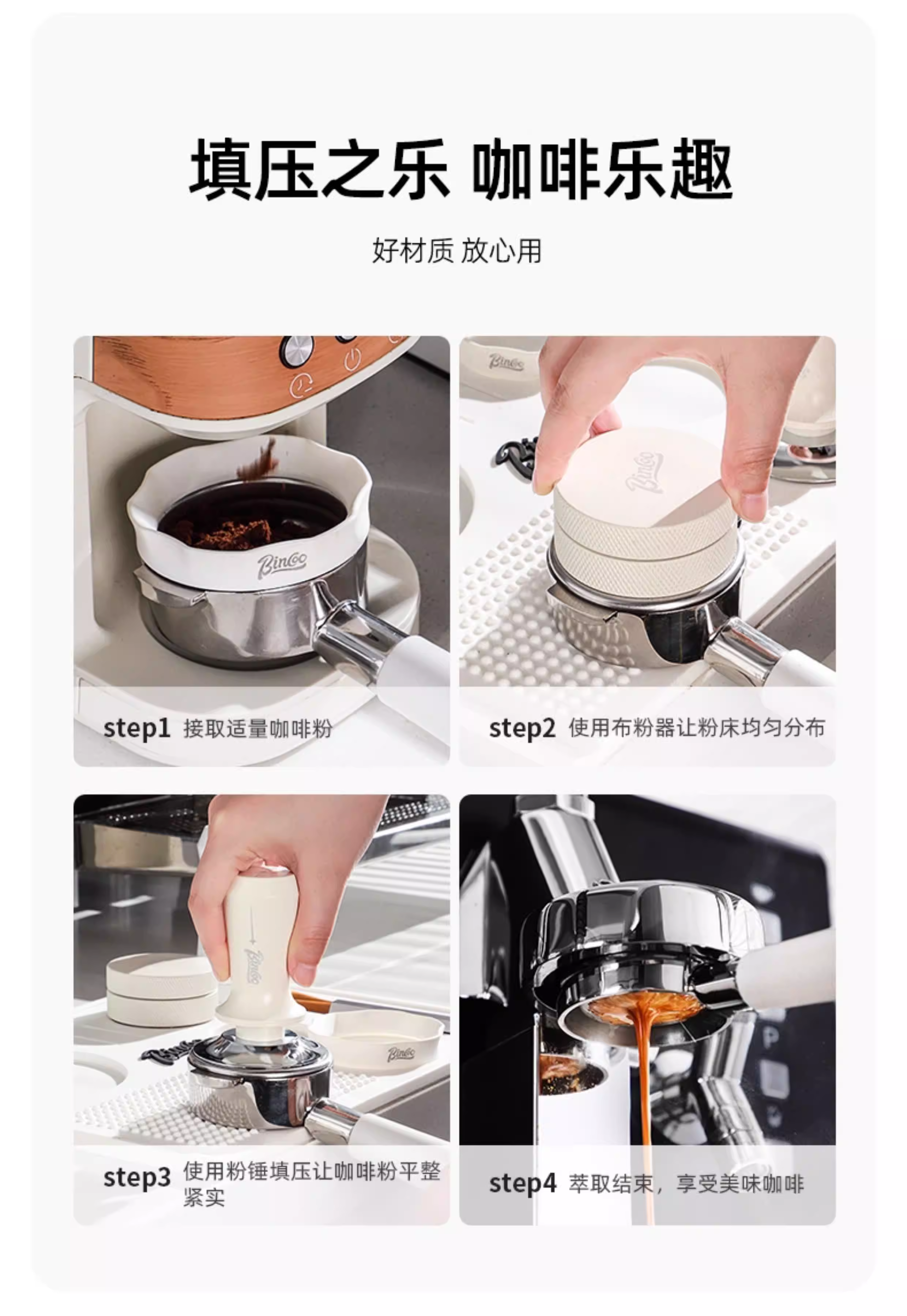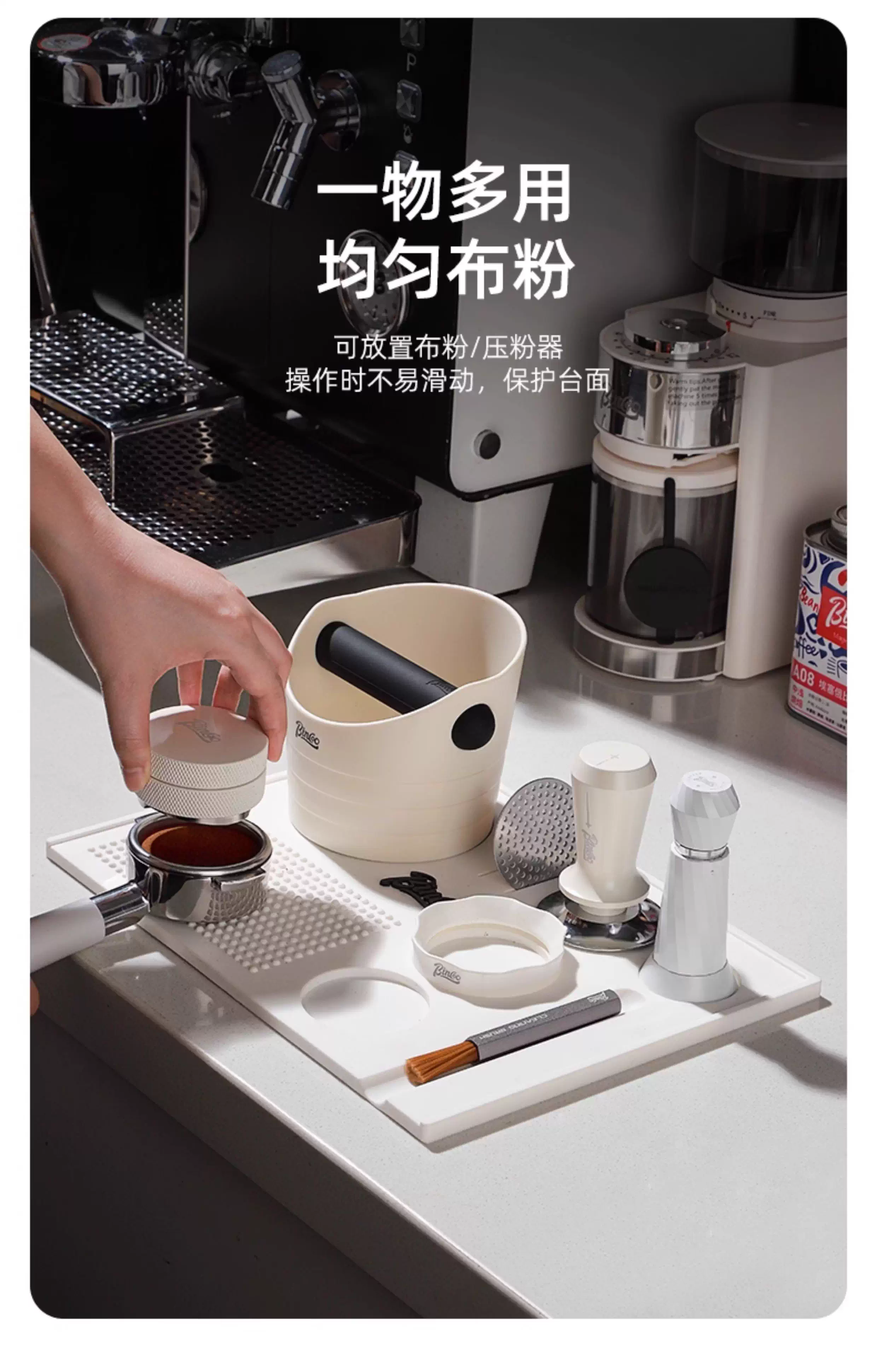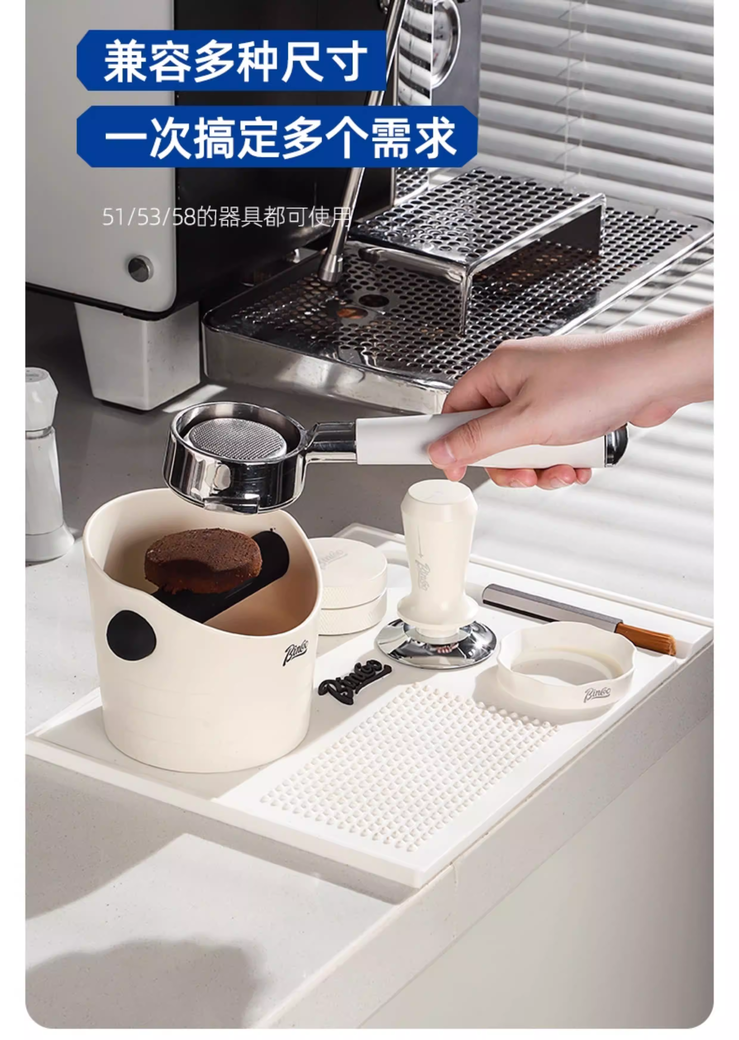 - Bộ dụng cụ pha cà phê đa năng Bincoo: đế nén cà phê, búa nén, dụng cụ phân phối bột, hộp đựng bã cà phê, đế để đồ 51mm58