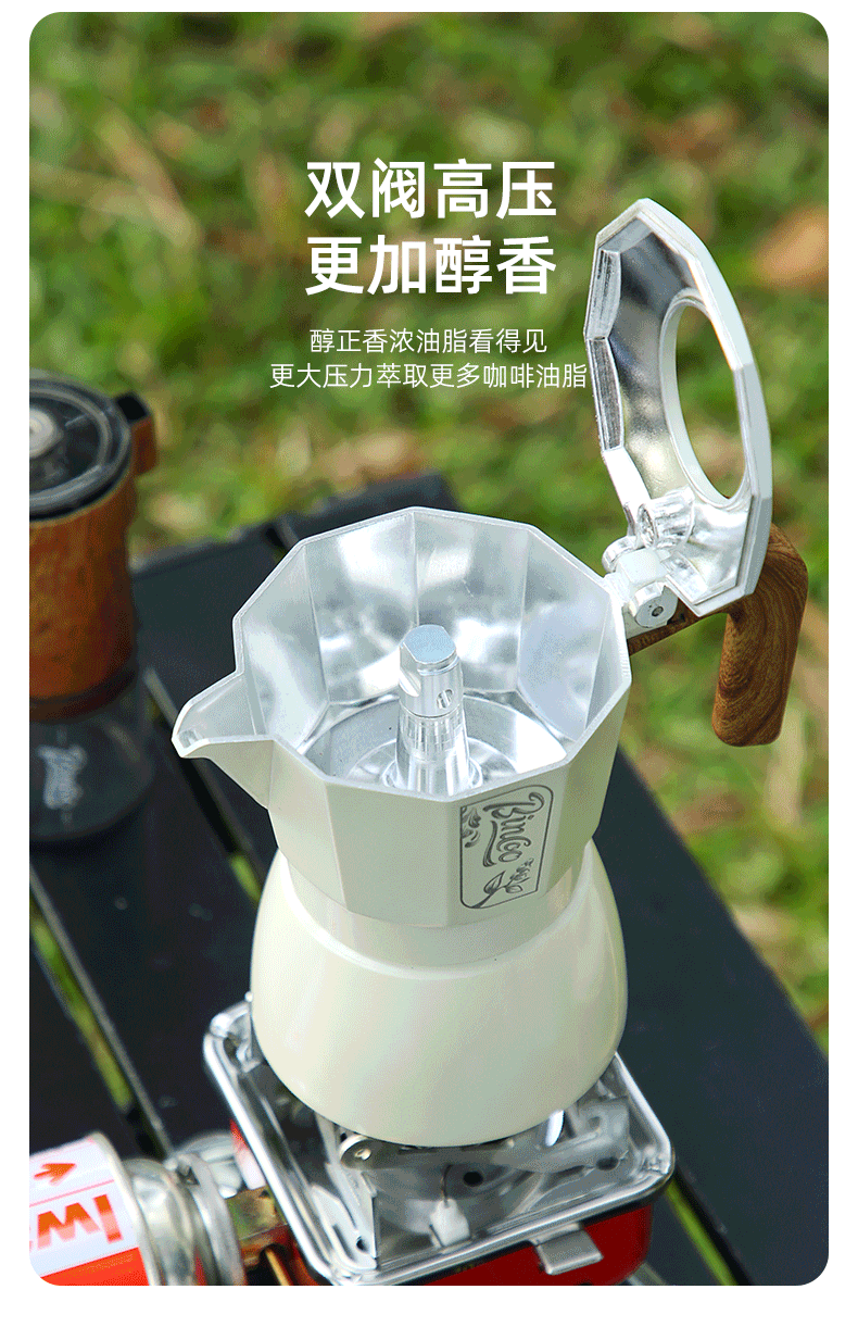 Bộ pha cà phê Bincoo du lịch ngoài trời, ấm pha cà phê moka hai van, thiết bị pha cà phê cắm trại, bộ pha cà phê di động đầy đủ