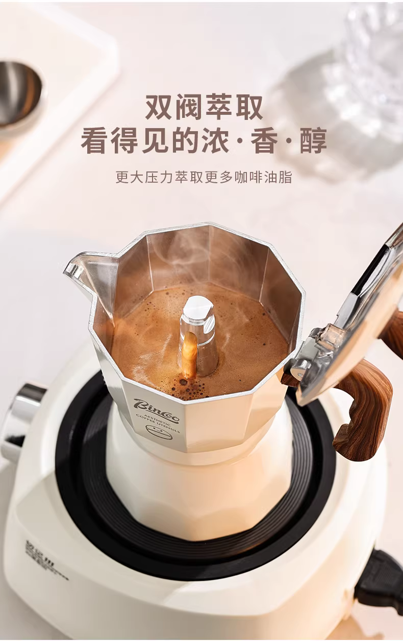 - Bộ pha cà phê Moka Bincoo hai van, sử dụng điện, kèm bếp điện gốm, hộp quà tặng, kiểu Ý, máy pha cà phê nhỏ gọn