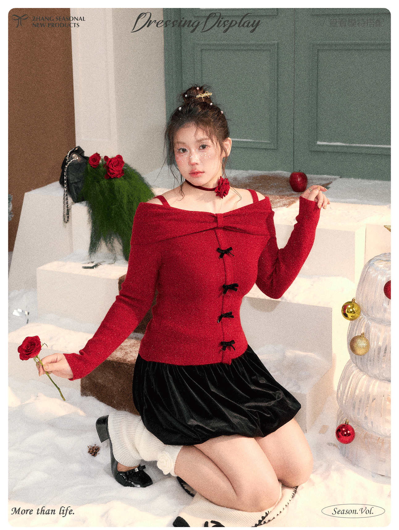 - Bộ quần áo mùa đông cho phụ nữ cỡ lớn, gồm áo len đỏ cổ nơ tôn dáng và chân váy nhung dành cho các cô gái mũm mĩm.