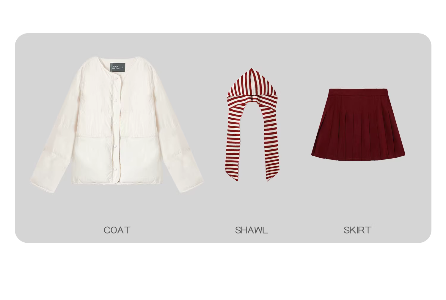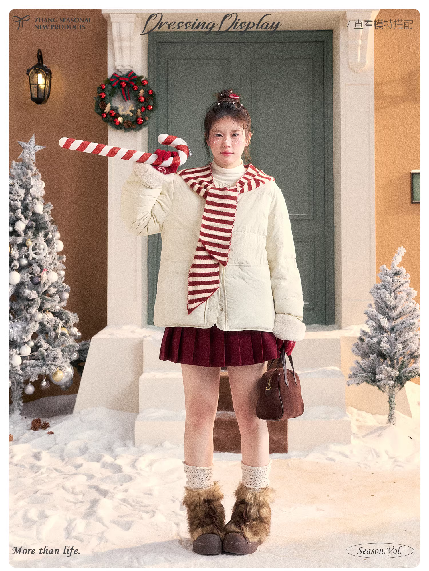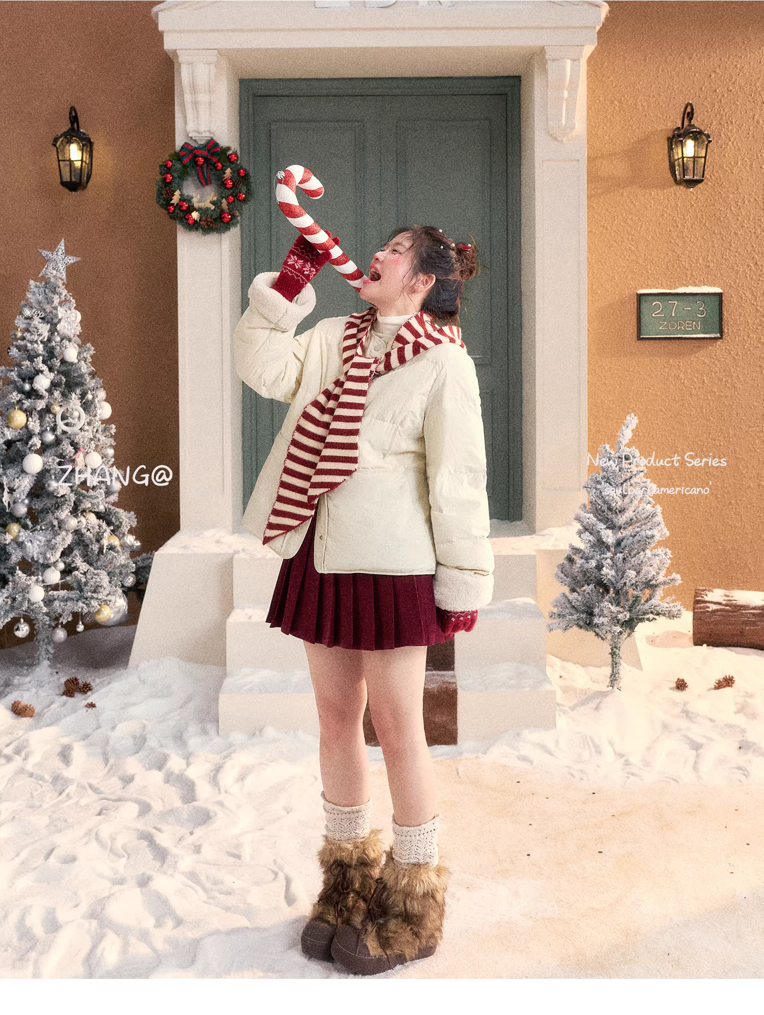 - Bộ quần áo mùa đông kiểu Hàn Quốc dành cho phụ nữ cỡ lớn, gồm áo khoác lông vũ màu mơ đào dáng ôm và chân váy xếp ly.