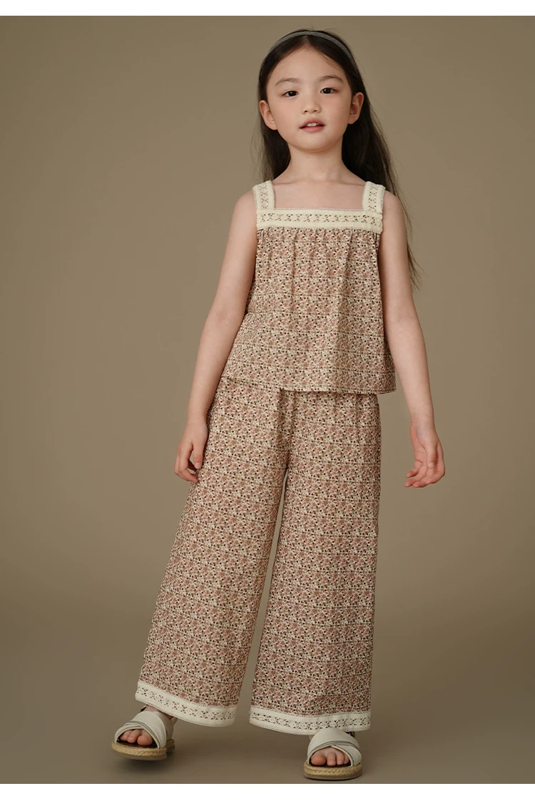 Bộ quần áo mùa hè cho trẻ em: áo vest cotton hoa hồng thân thiện với làn da và quần dài cho bé gái, kiểu dáng mùa hè mỏng nhẹ.