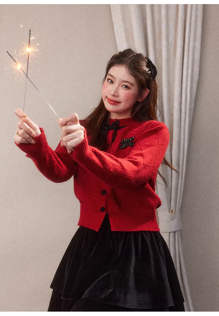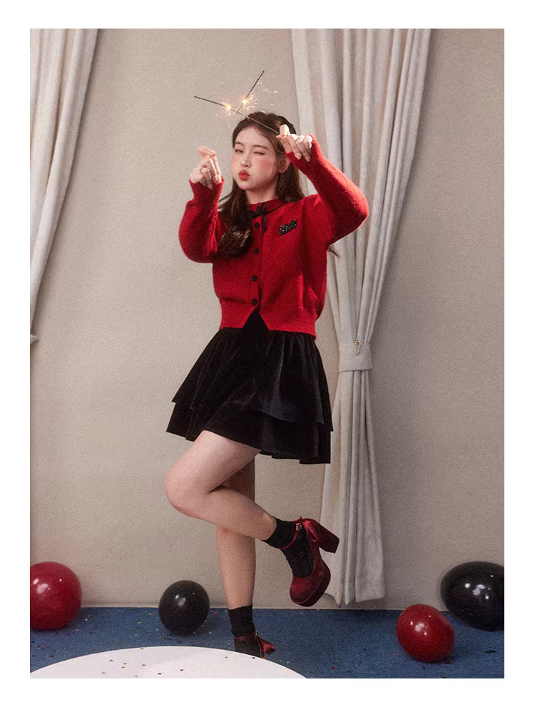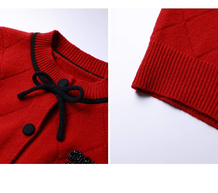 - Bộ quần áo nữ cỡ lớn: áo len đỏ tôn dáng, chân váy len đen, trang phục Tết.