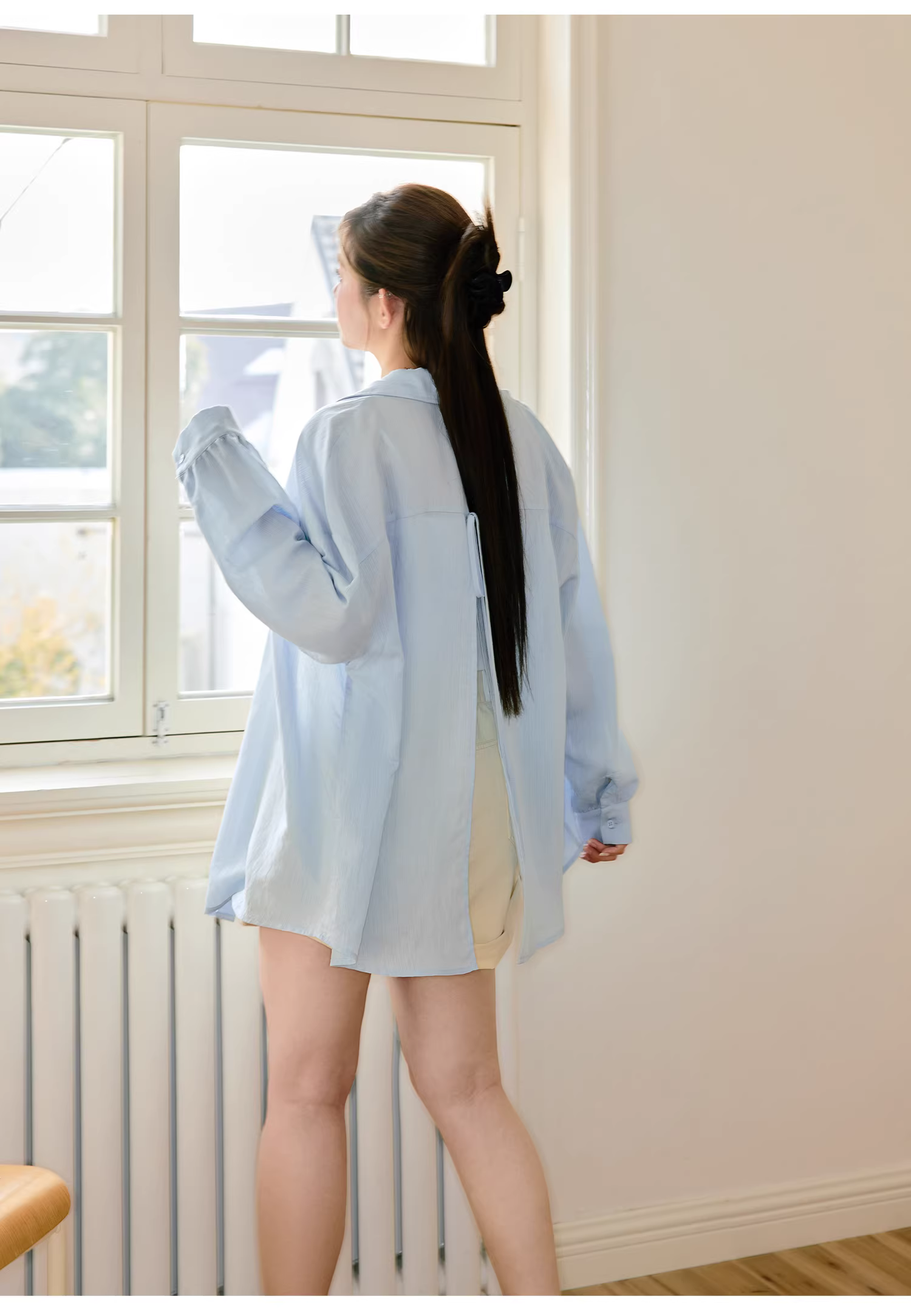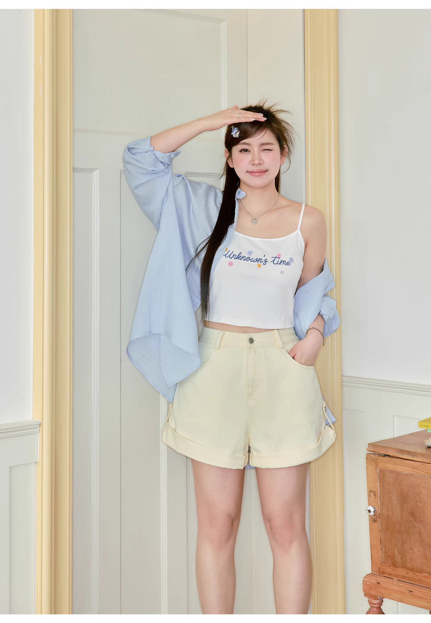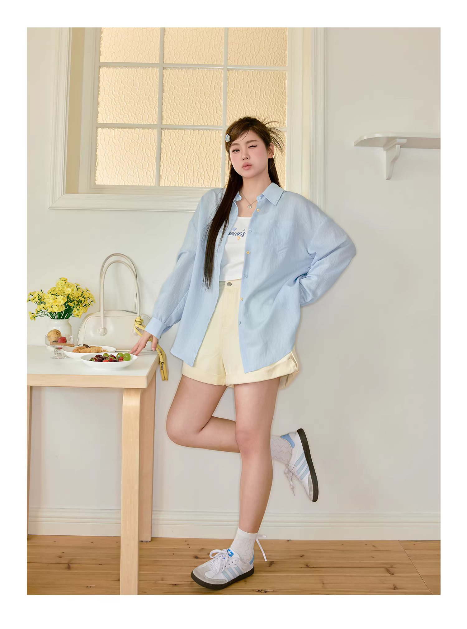 - Bộ quần áo nữ cỡ lớn dành cho người hơi mũm mĩm, áo sơ mi mỏng kiểu dopamine với quần short denim cạp cao.