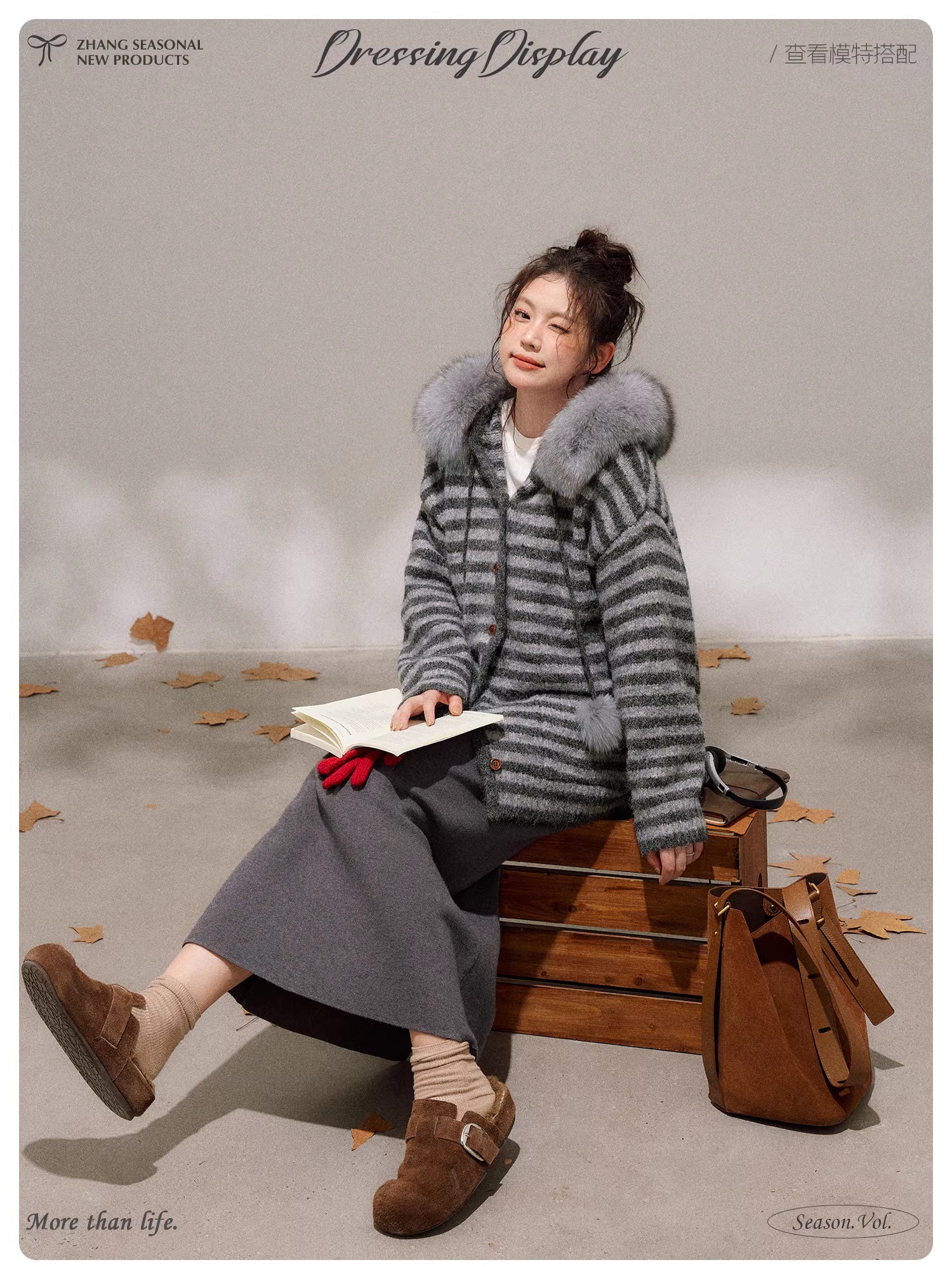 - Bộ quần áo nữ cỡ lớn dành cho người lớn, phong cách Hàn Quốc, áo khoác sọc cổ lông mùa đông tôn dáng và chân váy dài bóng.