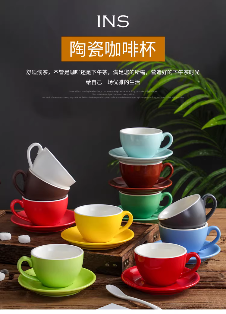 Bộ tách cà phê gốm sứ miệng rộng dày dặn, bộ cà phê đơn giản nhiều màu sắc, phong cách châu Âu sáng tạo, bộ đầy đủ 220ml