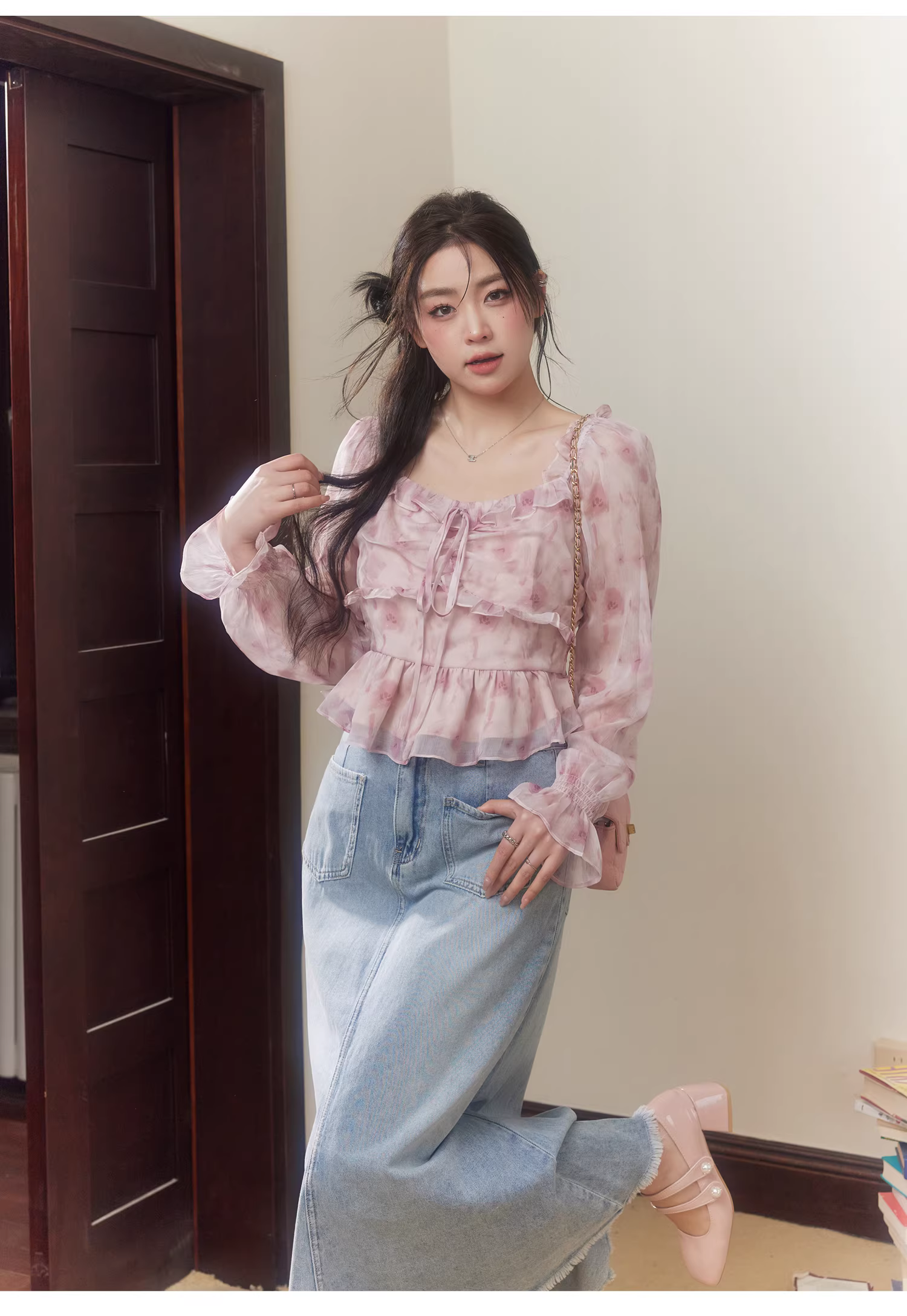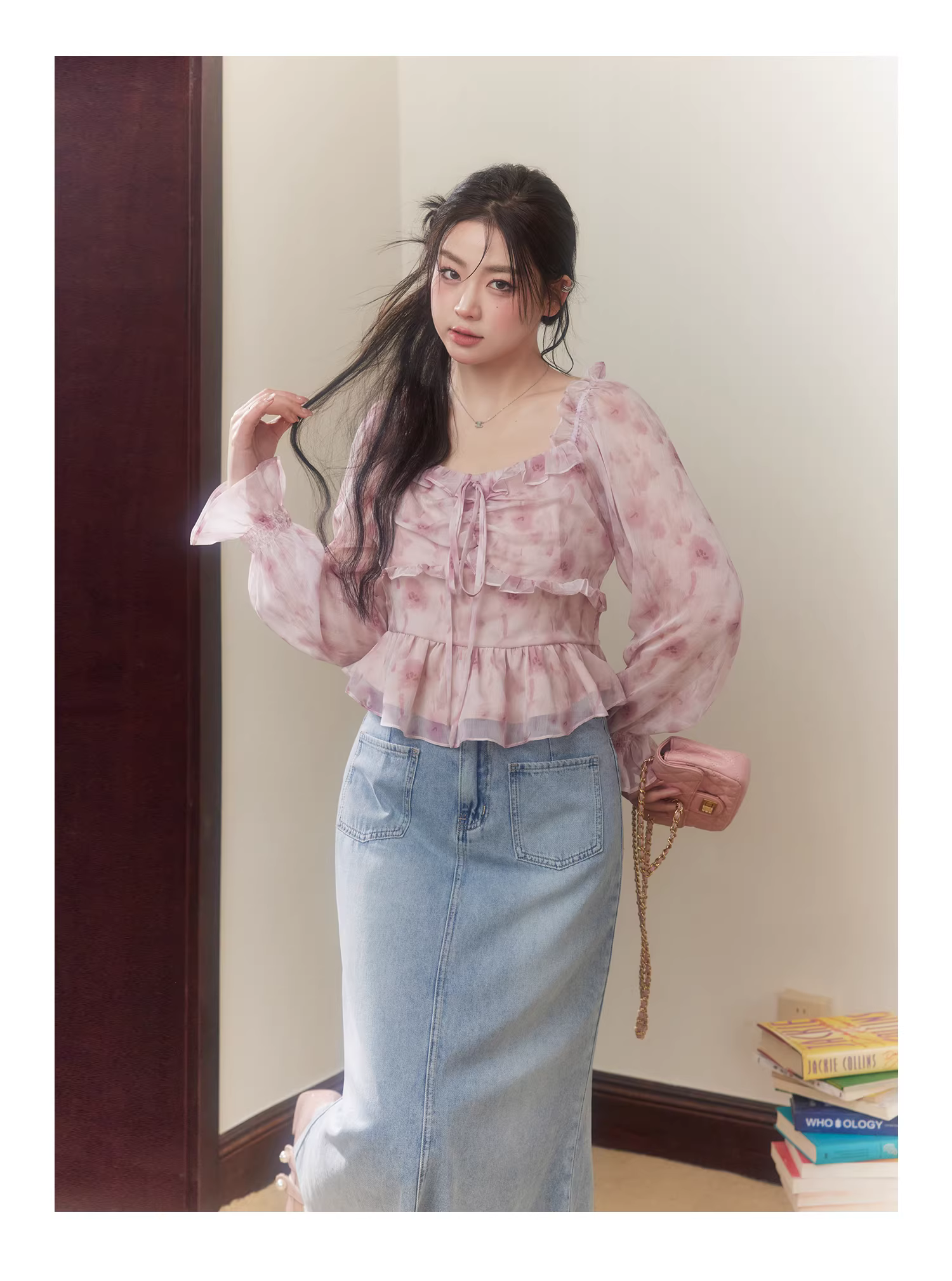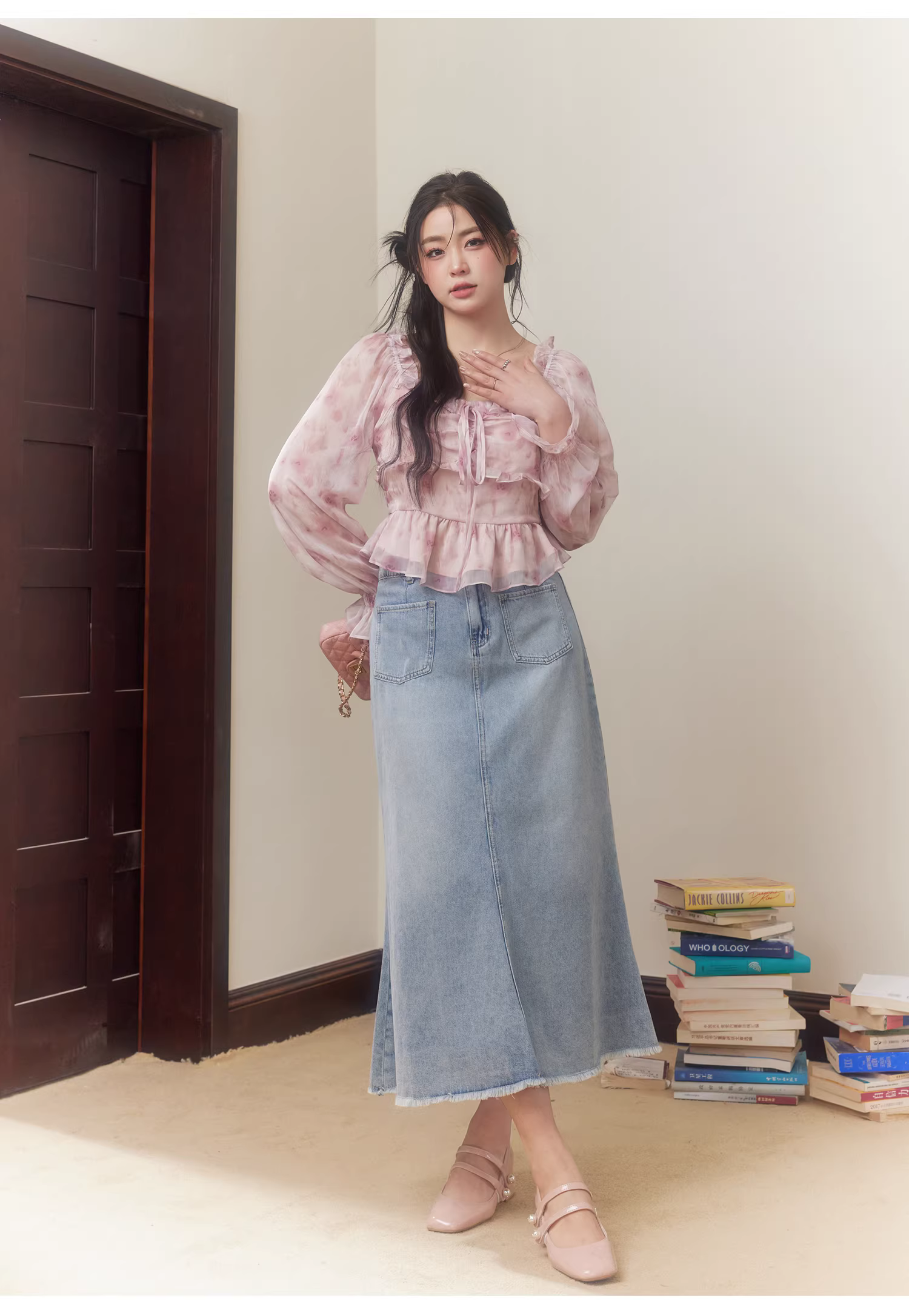 - Bộ thời trang mùa xuân cho phụ nữ cỡ lớn, gồm áo hoa dáng ôm và chân váy denim cạp cao.