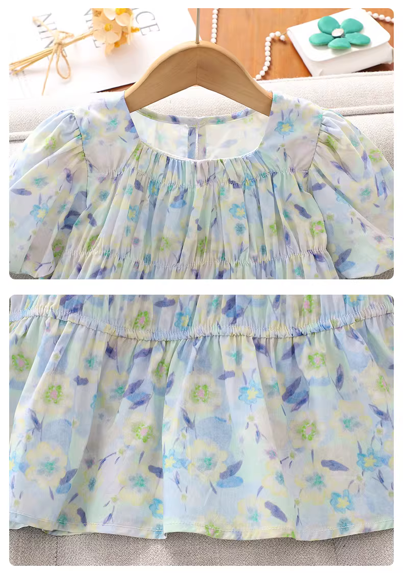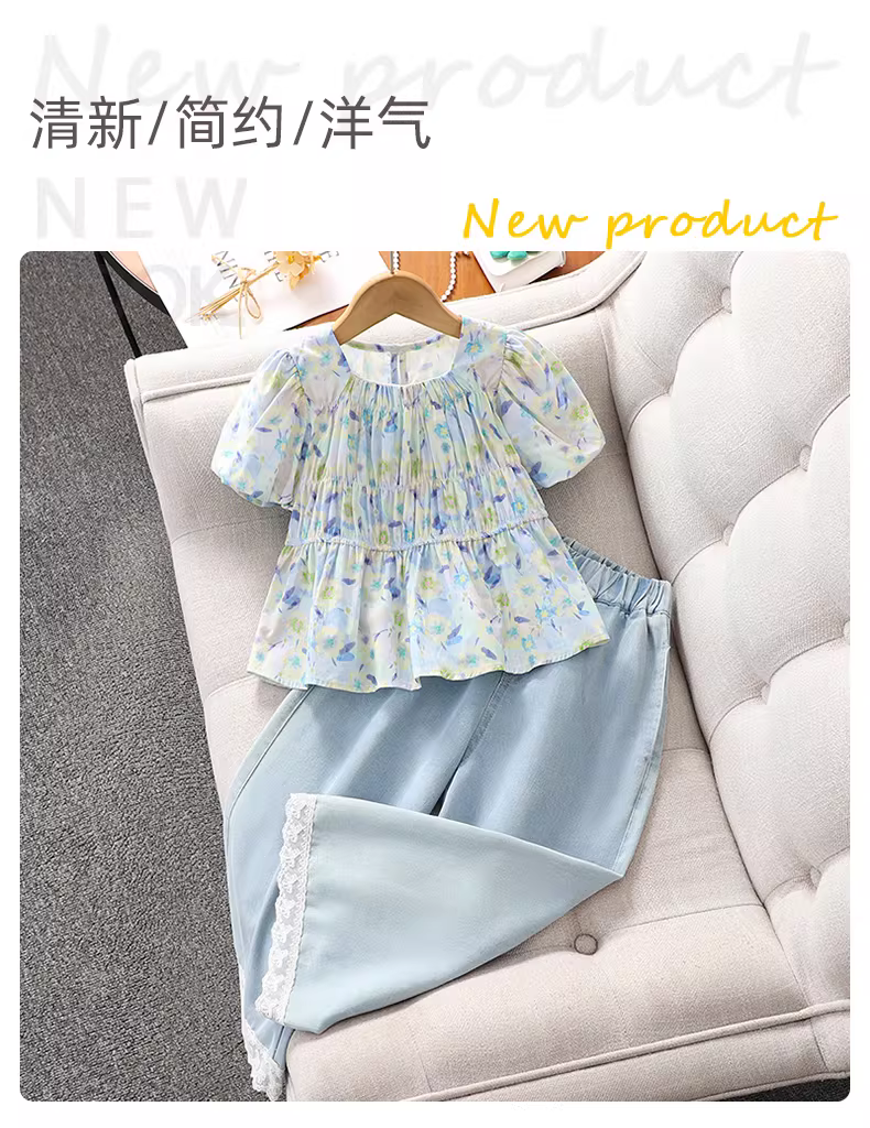 - Bộ trang phục hè 2025 cho bé gái: Áo sơ mi ngắn tay họa tiết hoa dễ thương + Quần denim ống rộng phong cách thường ngày