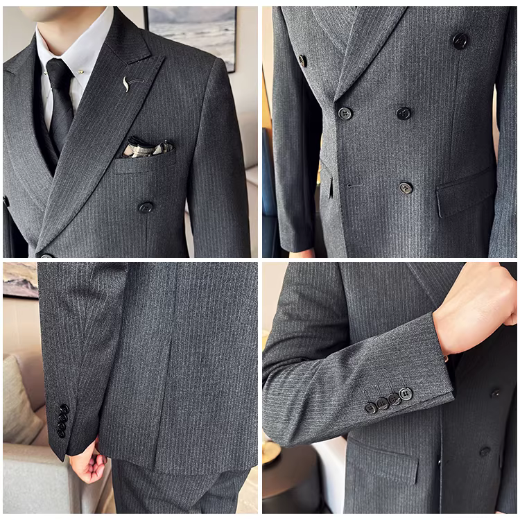 - Bộ vest kẻ sọc hai hàng khuy nam, thời trang xuân thu mới, kiểu dáng ôm body, lịch lãm, bộ ba món