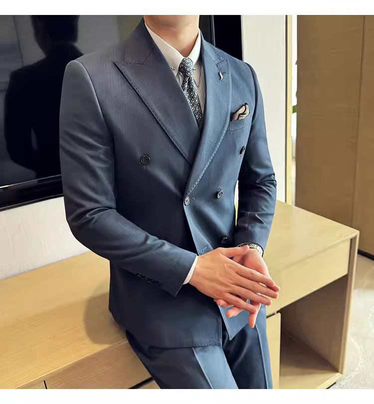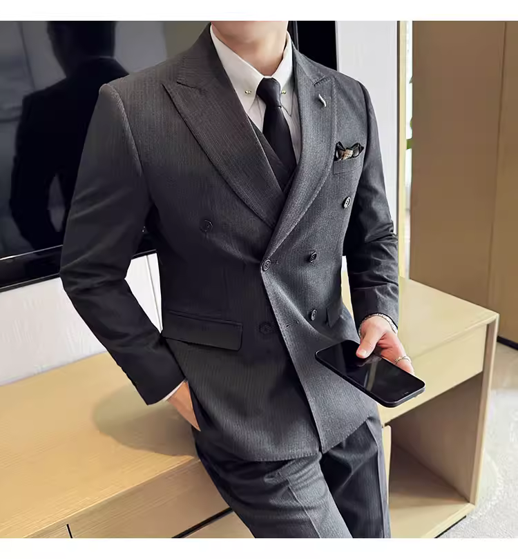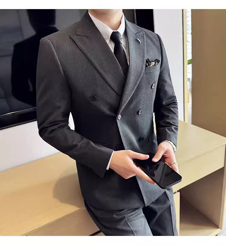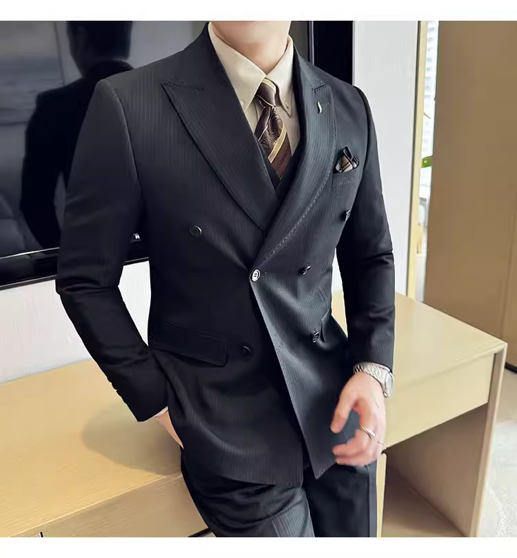 Bộ vest kẻ sọc hai hàng khuy nam, thời trang xuân thu mới, kiểu dáng ôm body, lịch lãm, bộ ba món