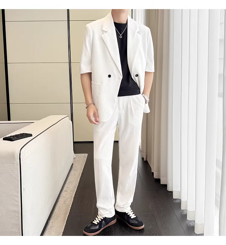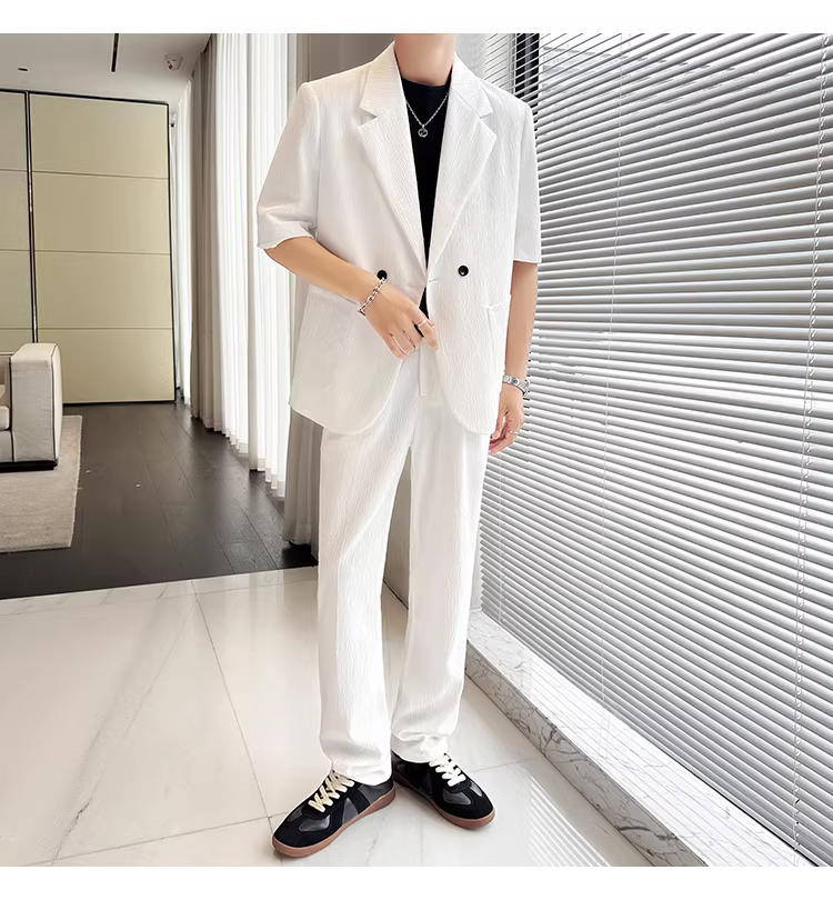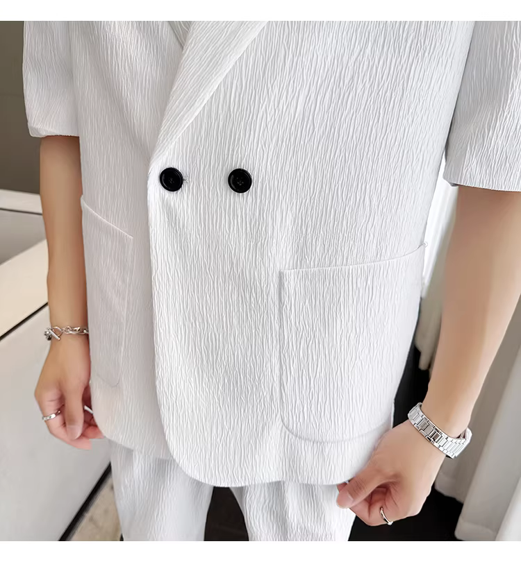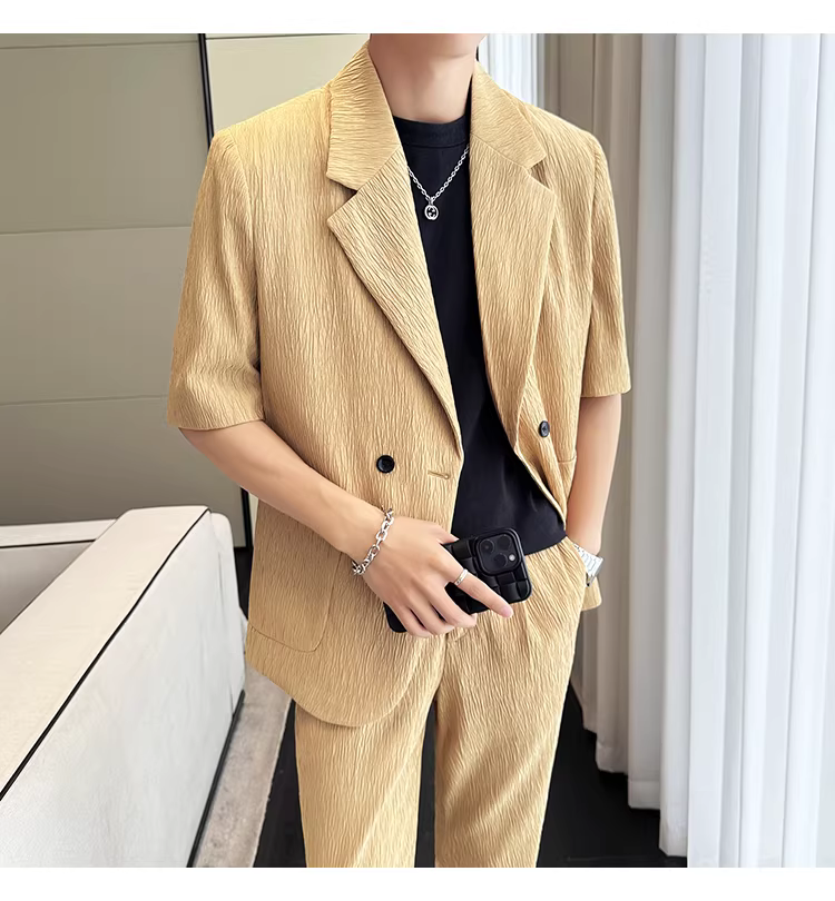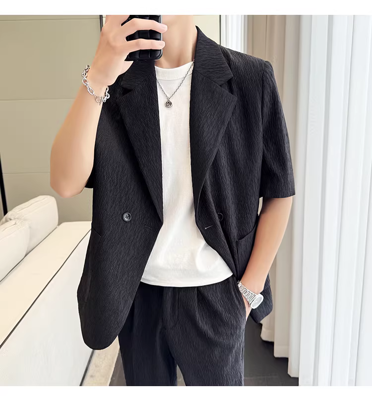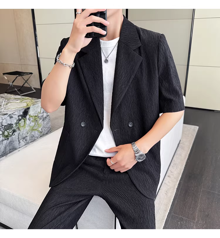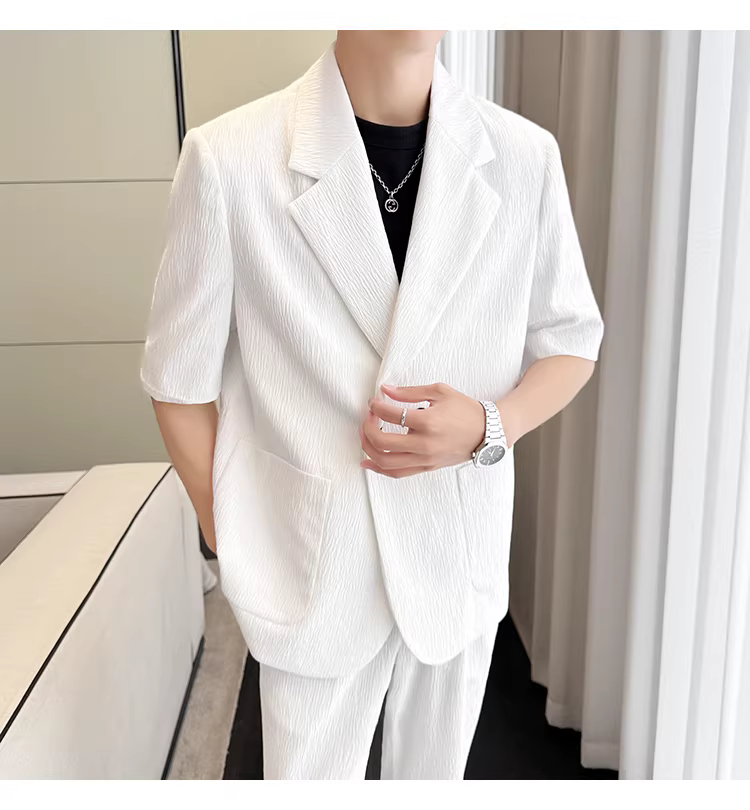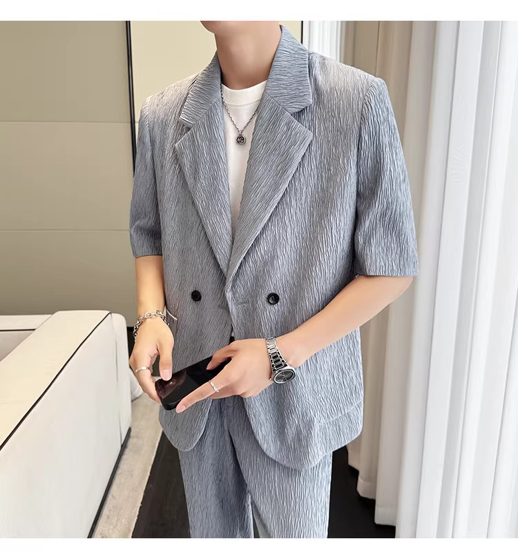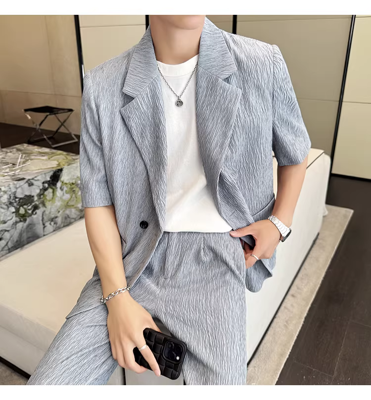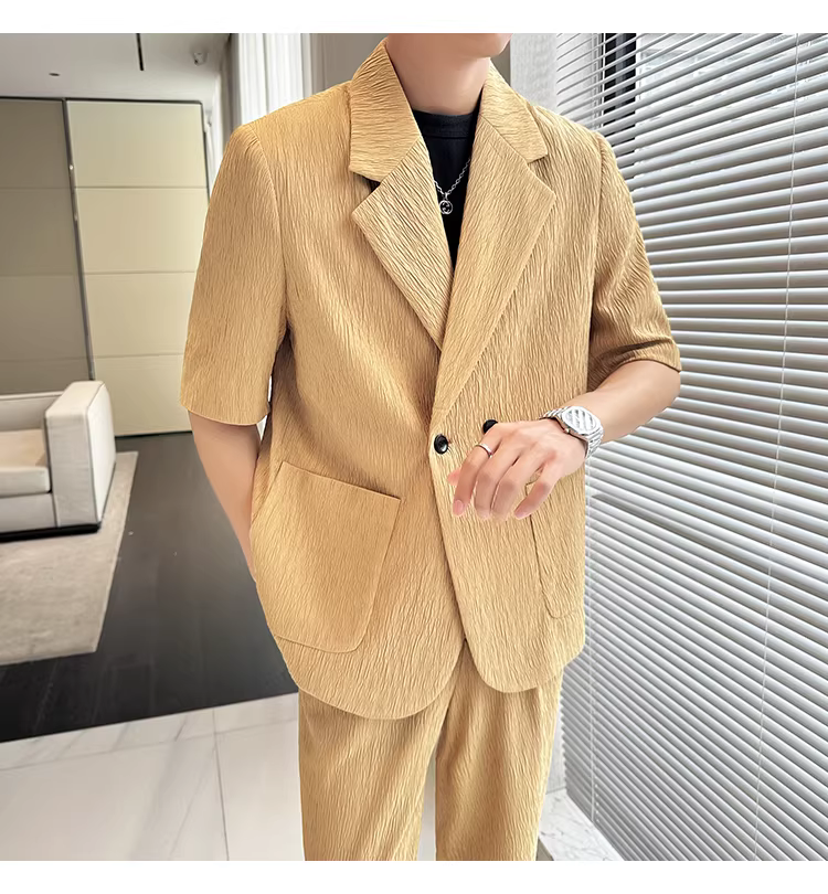 - Bộ vest nam chất liệu lụa đá, tay ngắn, kiểu dáng mùa hè mỏng nhẹ, hơi rộng rãi, thoải mái và đa năng, bộ hai mảnh phong cách thường ngày