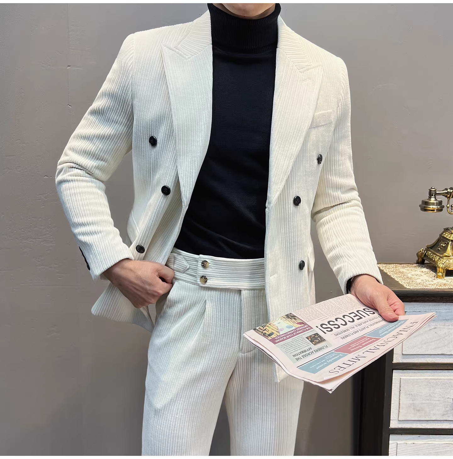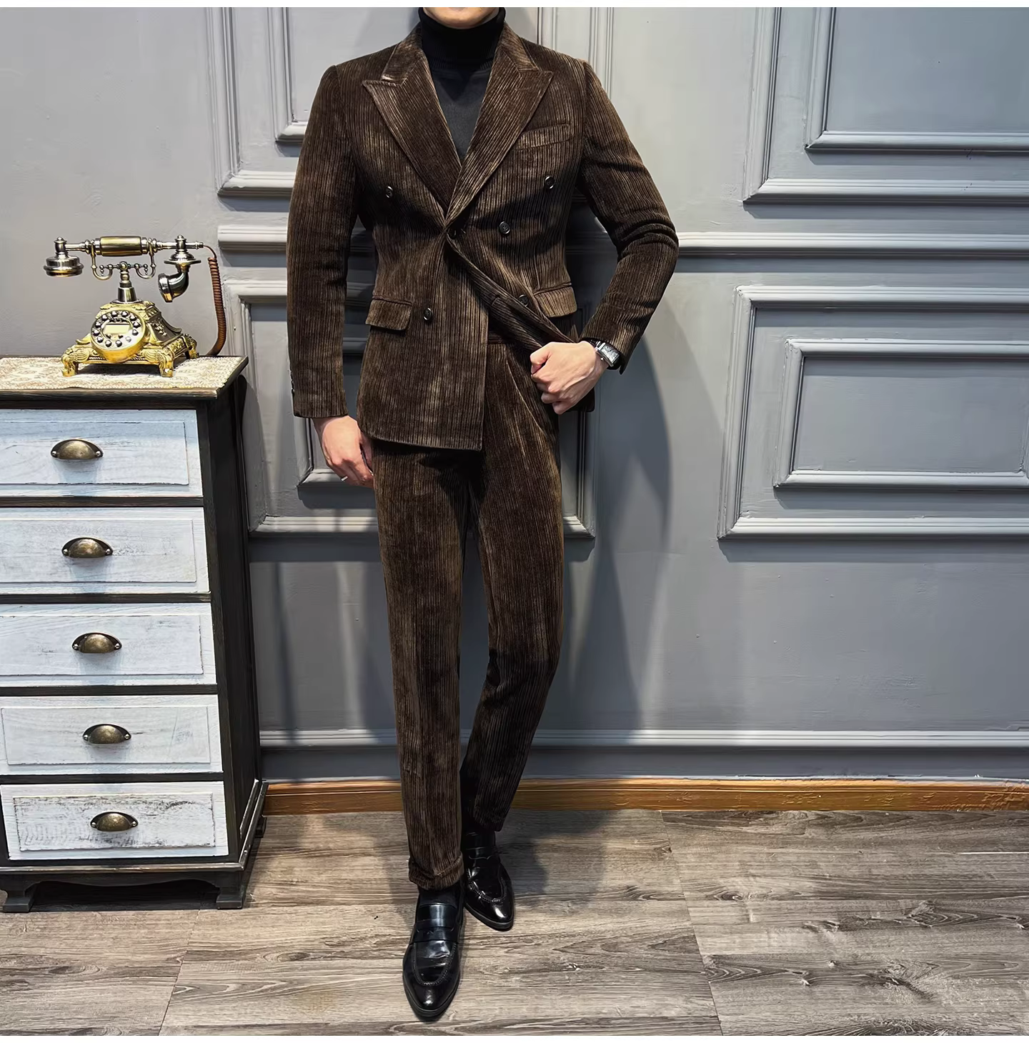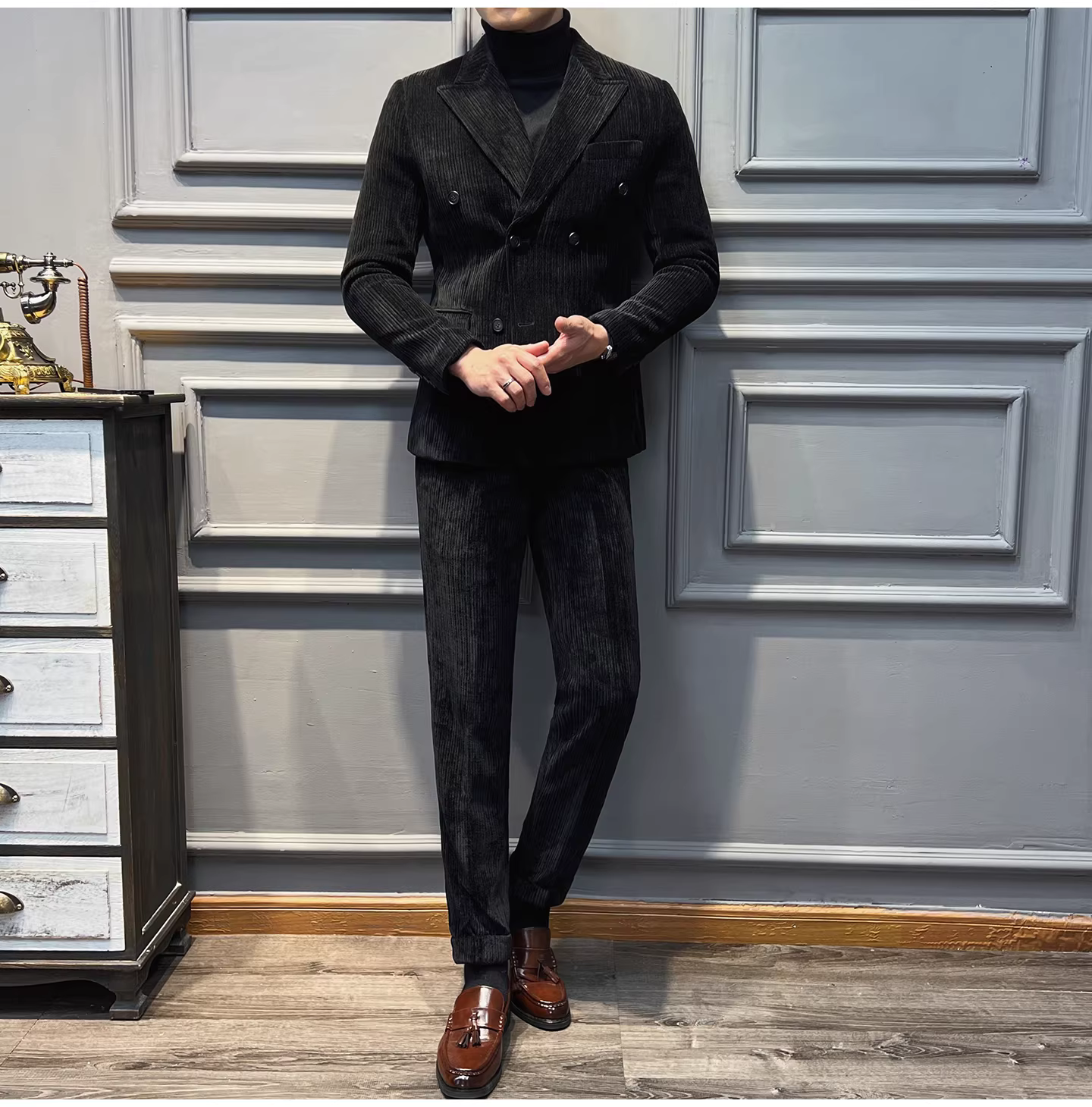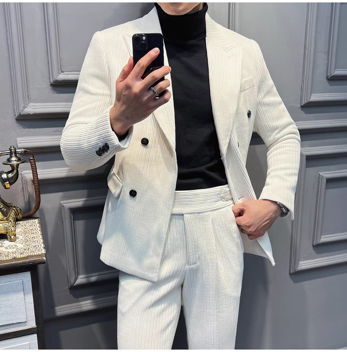 Bộ vest nam chất liệu nhung dày, dáng ôm, kiểu dáng mới thu đông, thời trang công sở lịch lãm, đa năng.