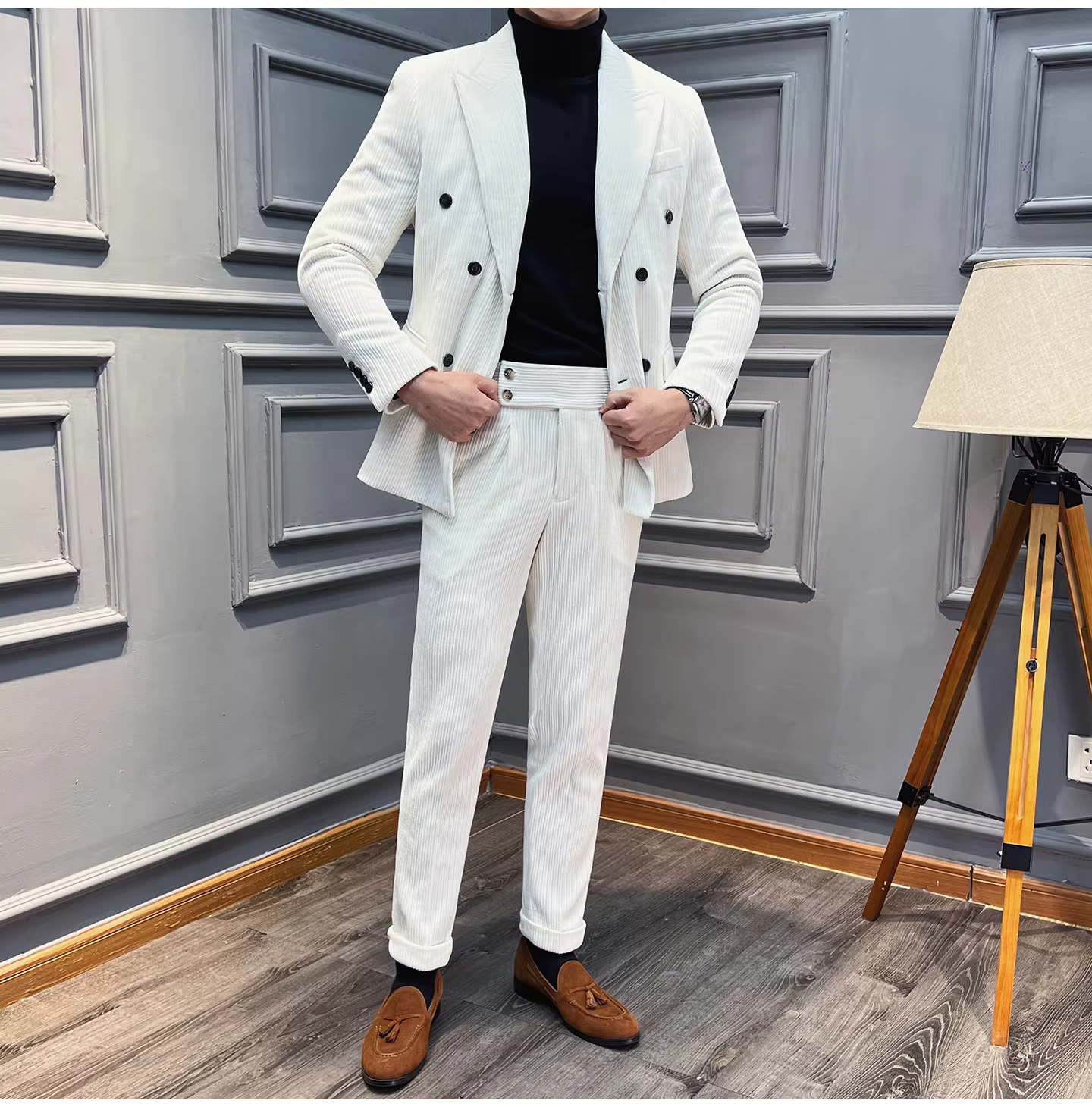 - Bộ vest nam chất liệu nhung dày, dáng ôm, kiểu dáng mới thu đông, thời trang công sở lịch lãm, đa năng.