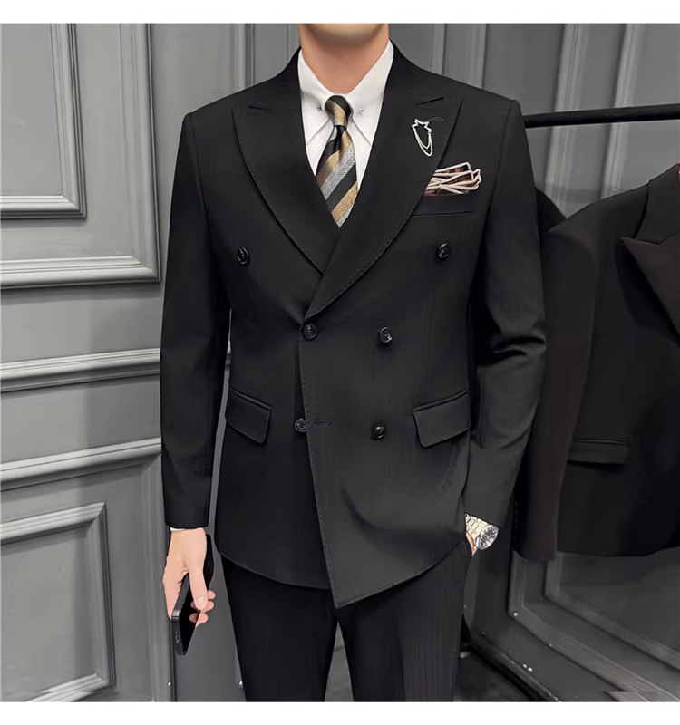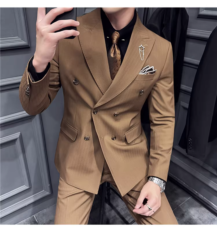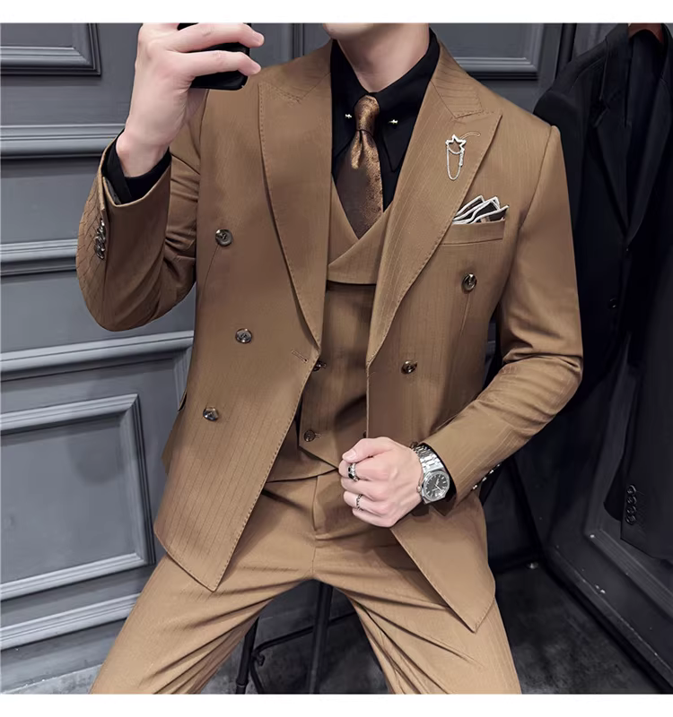- Bộ vest nam kẻ sọc đậm nhuộm sợi, kiểu dáng Hàn Quốc ôm dáng, trang phục công sở lịch sự, bộ vest ba mảnh dự tiệc cưới