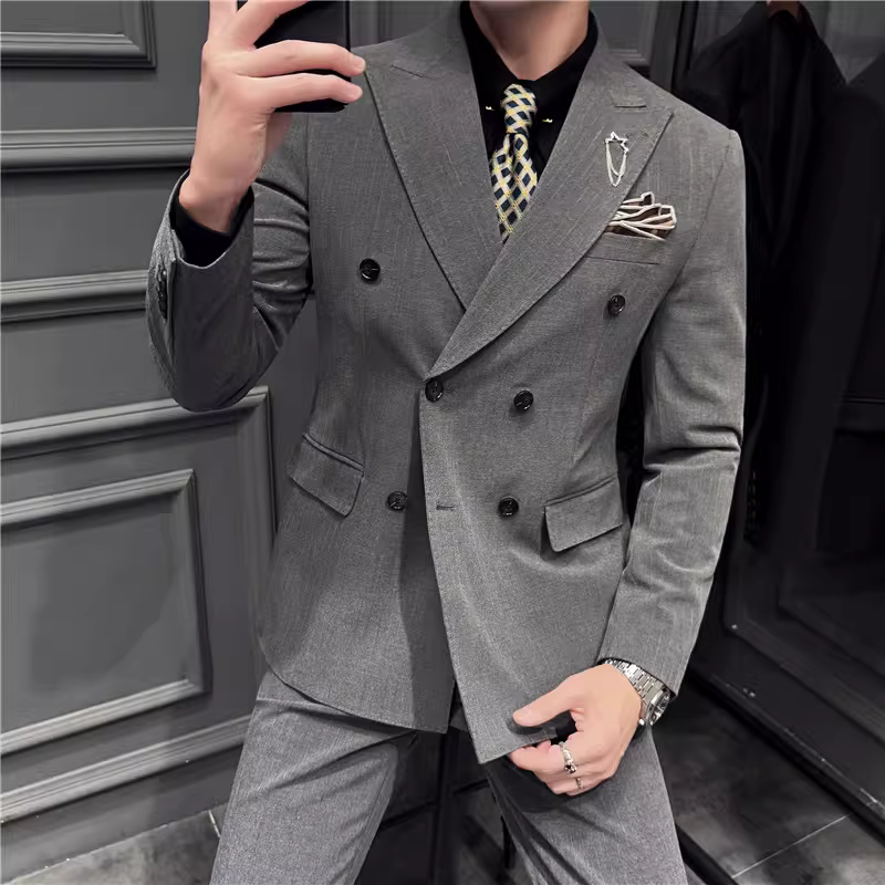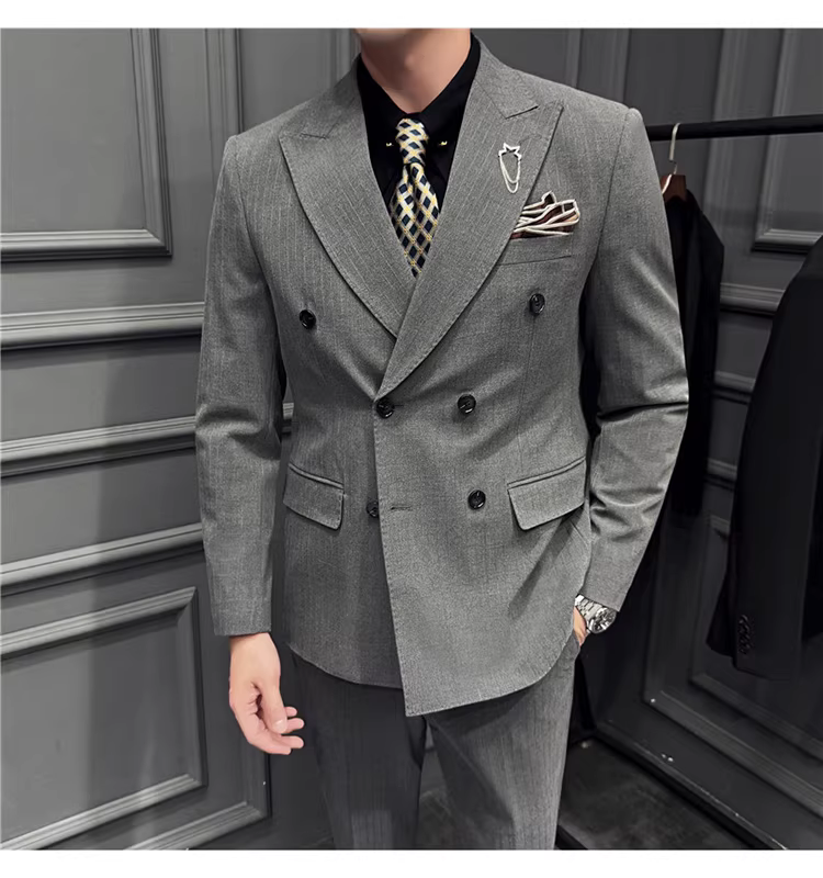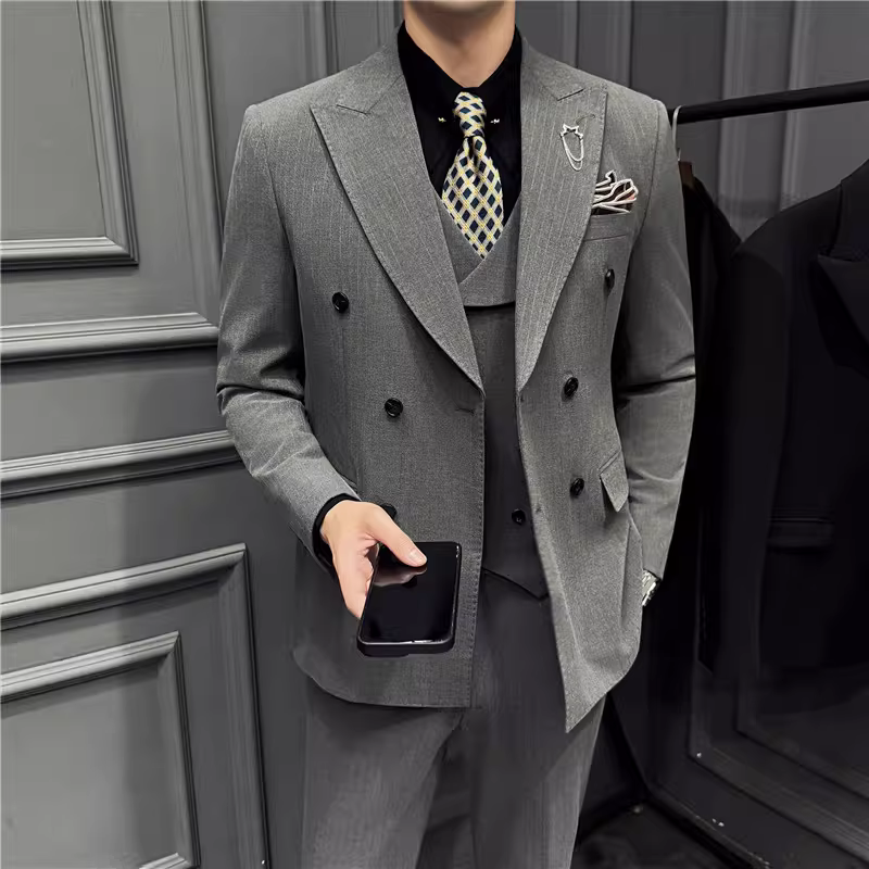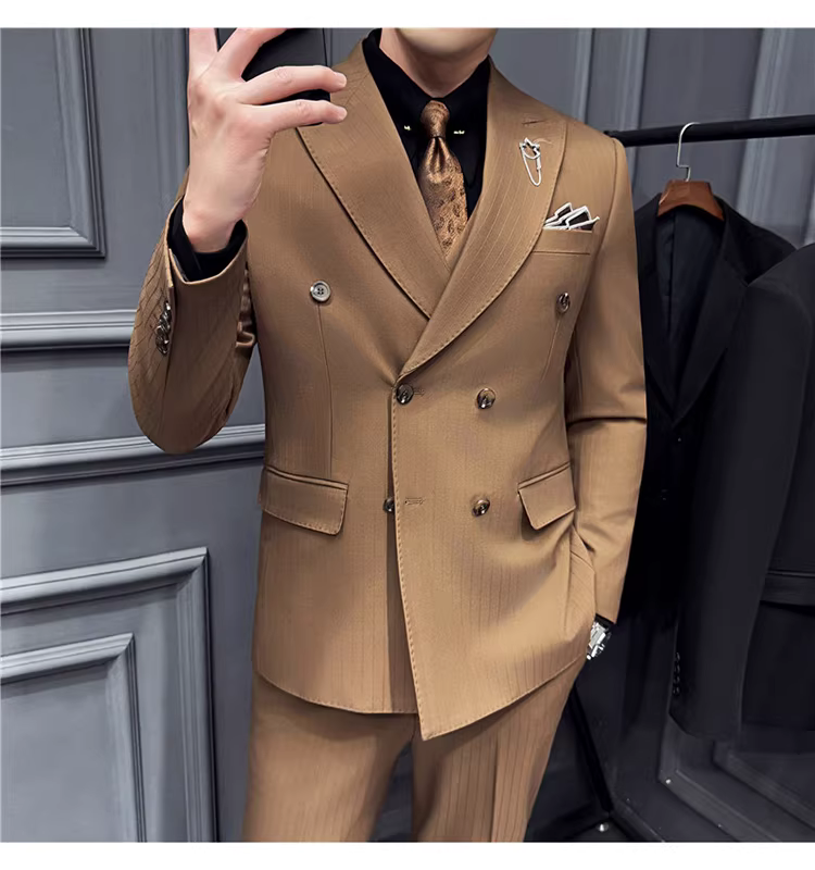 Bộ vest nam kẻ sọc đậm nhuộm sợi, kiểu dáng Hàn Quốc ôm dáng, trang phục công sở lịch sự, bộ vest ba mảnh dự tiệc cưới