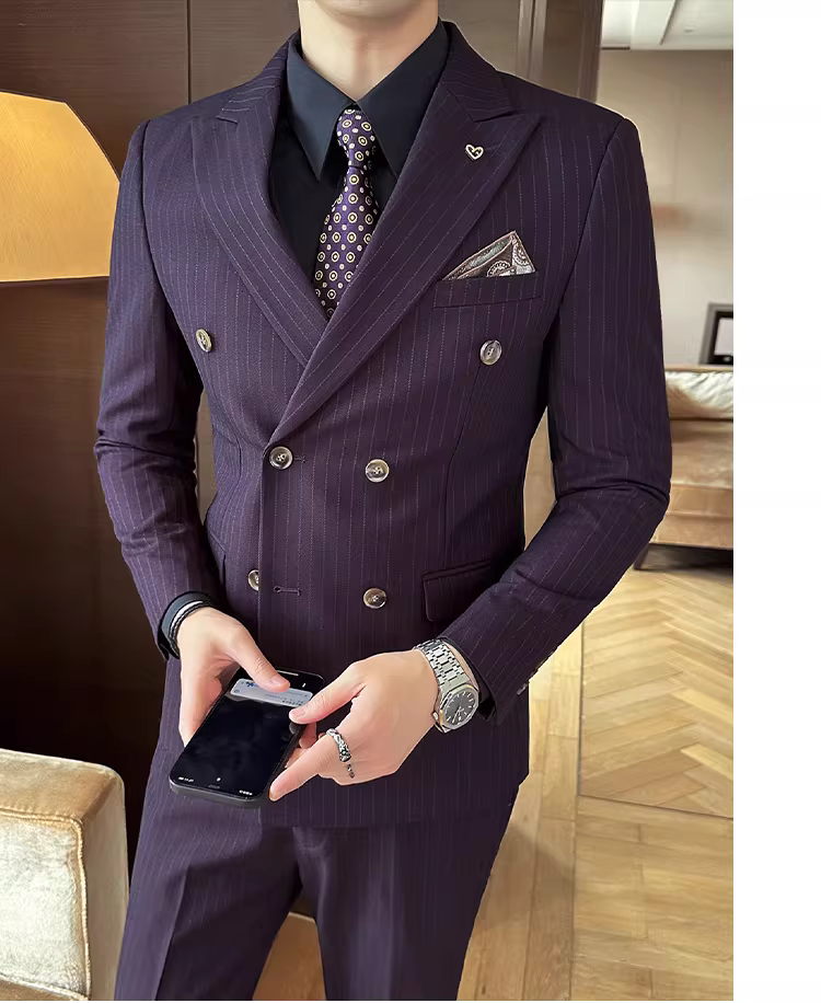 - Bộ vest nam kẻ sọc, kiểu dáng lịch lãm, ôm dáng, thời trang, bộ vest cưới ba mảnh dành cho chú rể