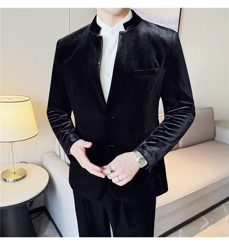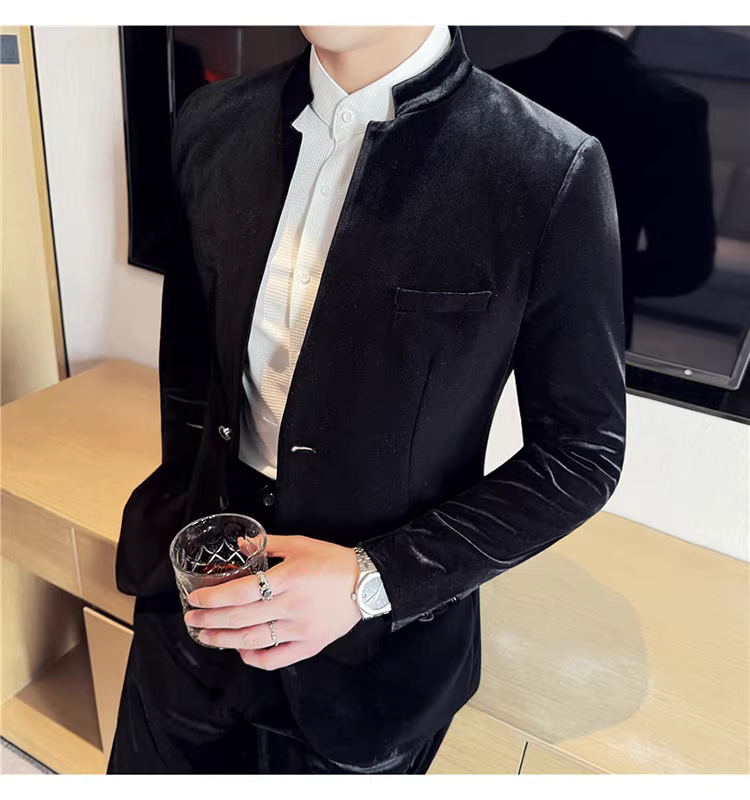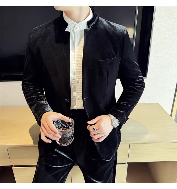 Bộ vest nhung cổ đứng kiểu Trung Quốc mới dành cho nam, dày dặn và ấm áp mùa thu đông, phong cách công sở giản dị, bộ vest ôm dáng cao cấp.