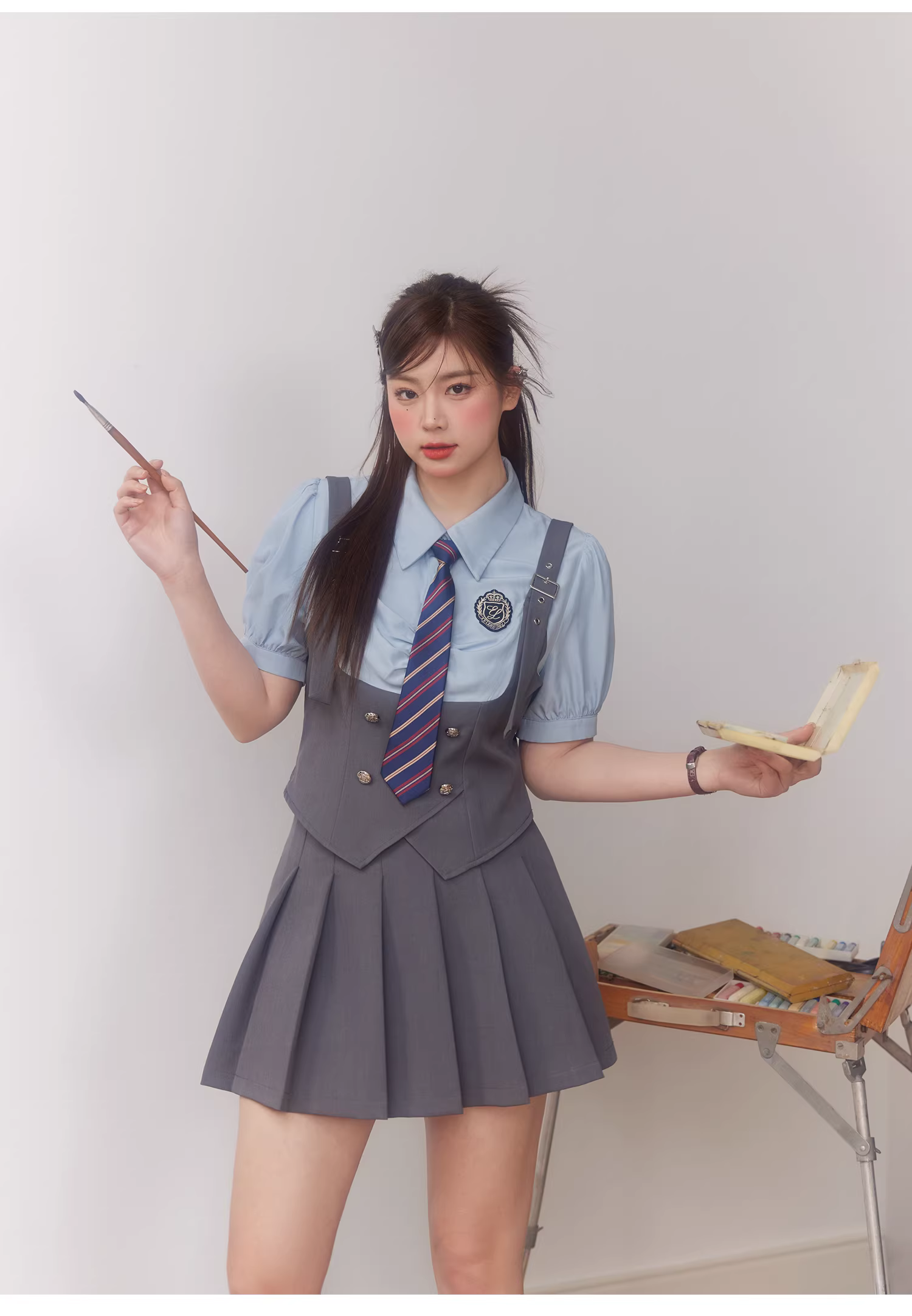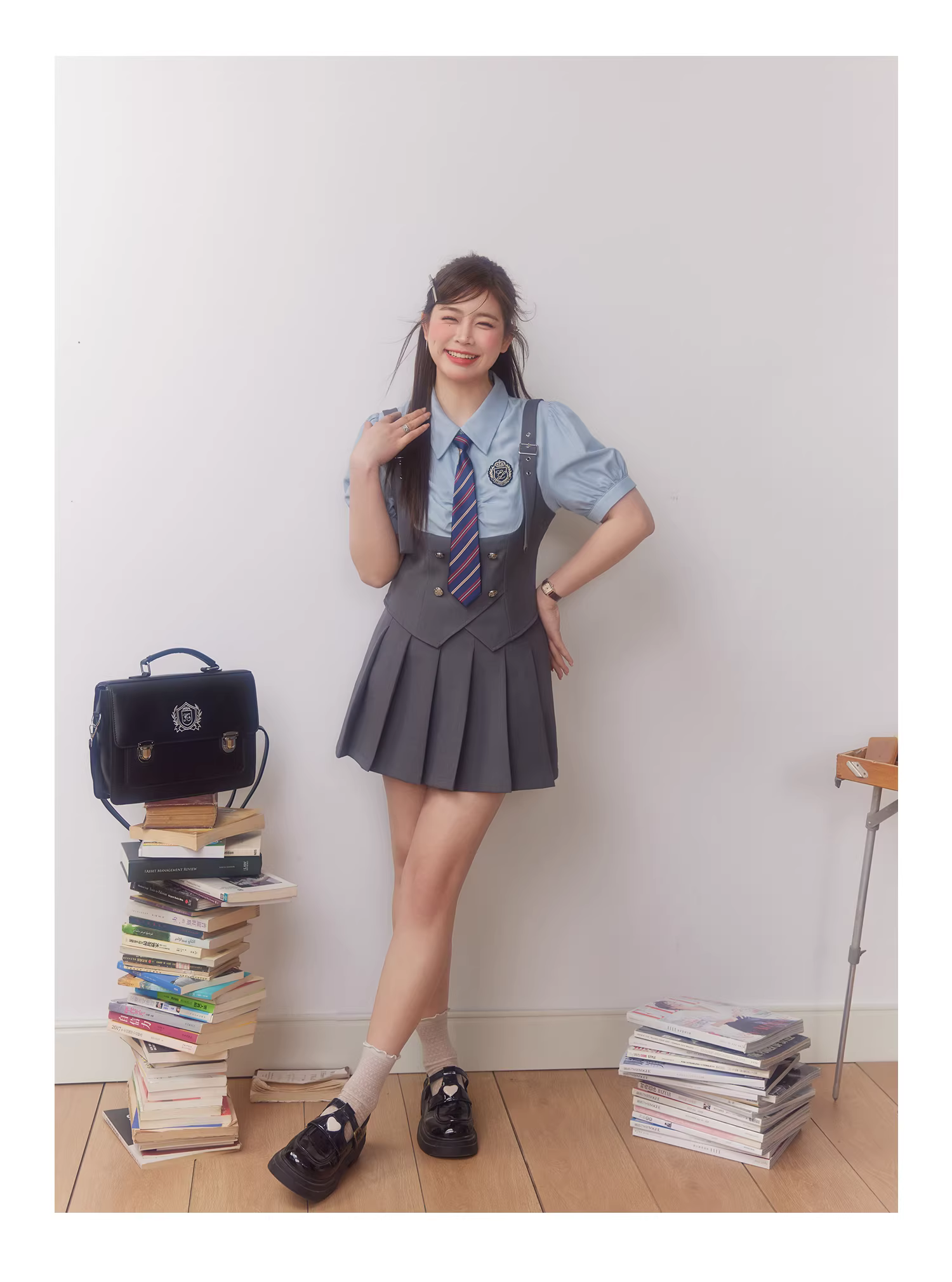 Bộ vest nữ cỡ lớn kiểu retro, ôm dáng, phong cách học sinh, gồm áo ngắn tay, blazer và váy yếm.
