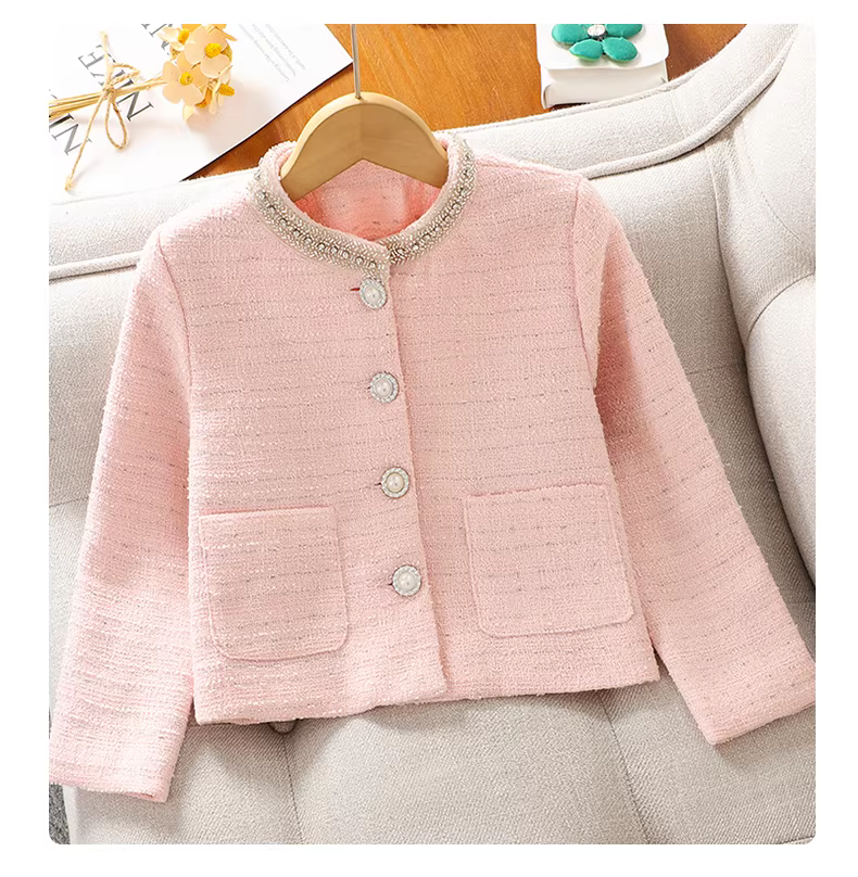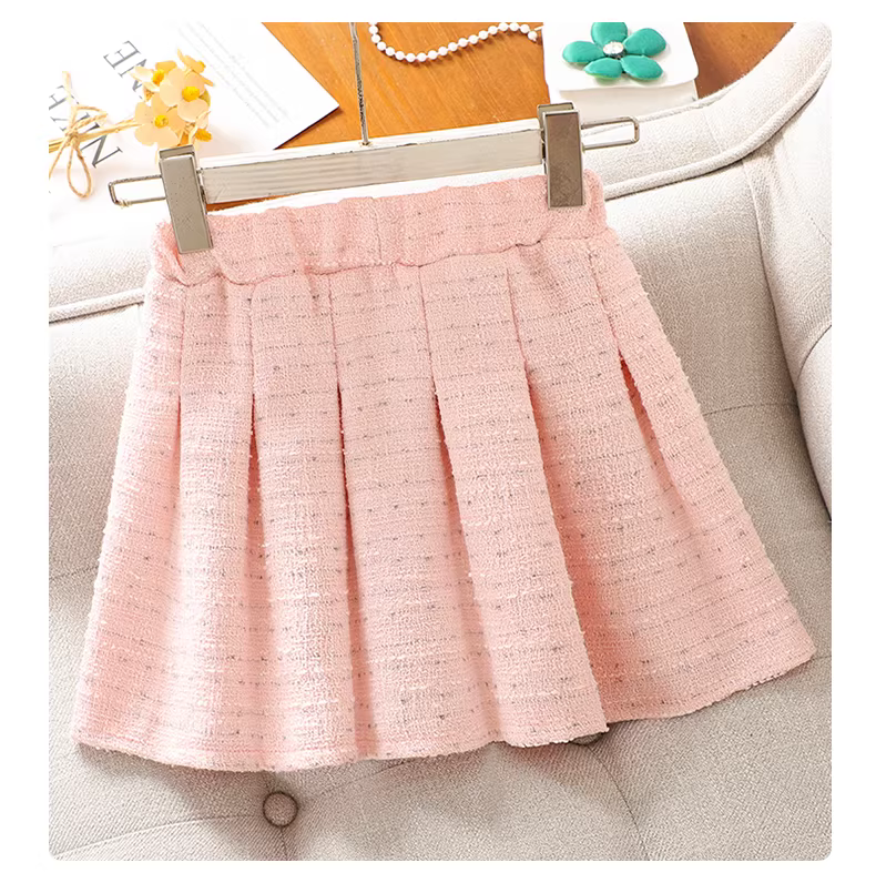 Bộ vest phong cách Chanel cho bé gái mùa xuân thu 2025, trang phục thu mới cho bé gái, bộ hai mảnh chân váy xếp ly, bộ váy thời trang và sành điệu.