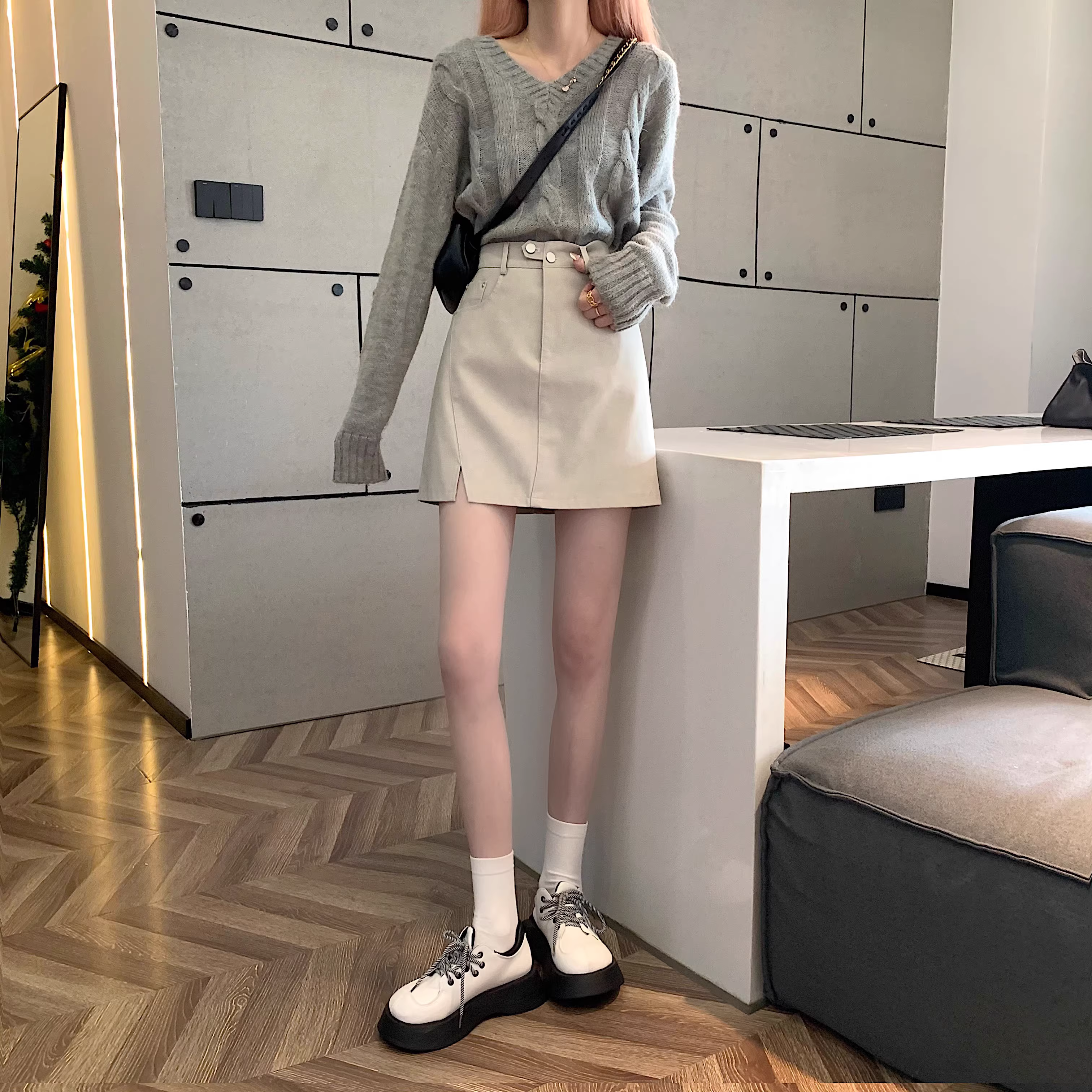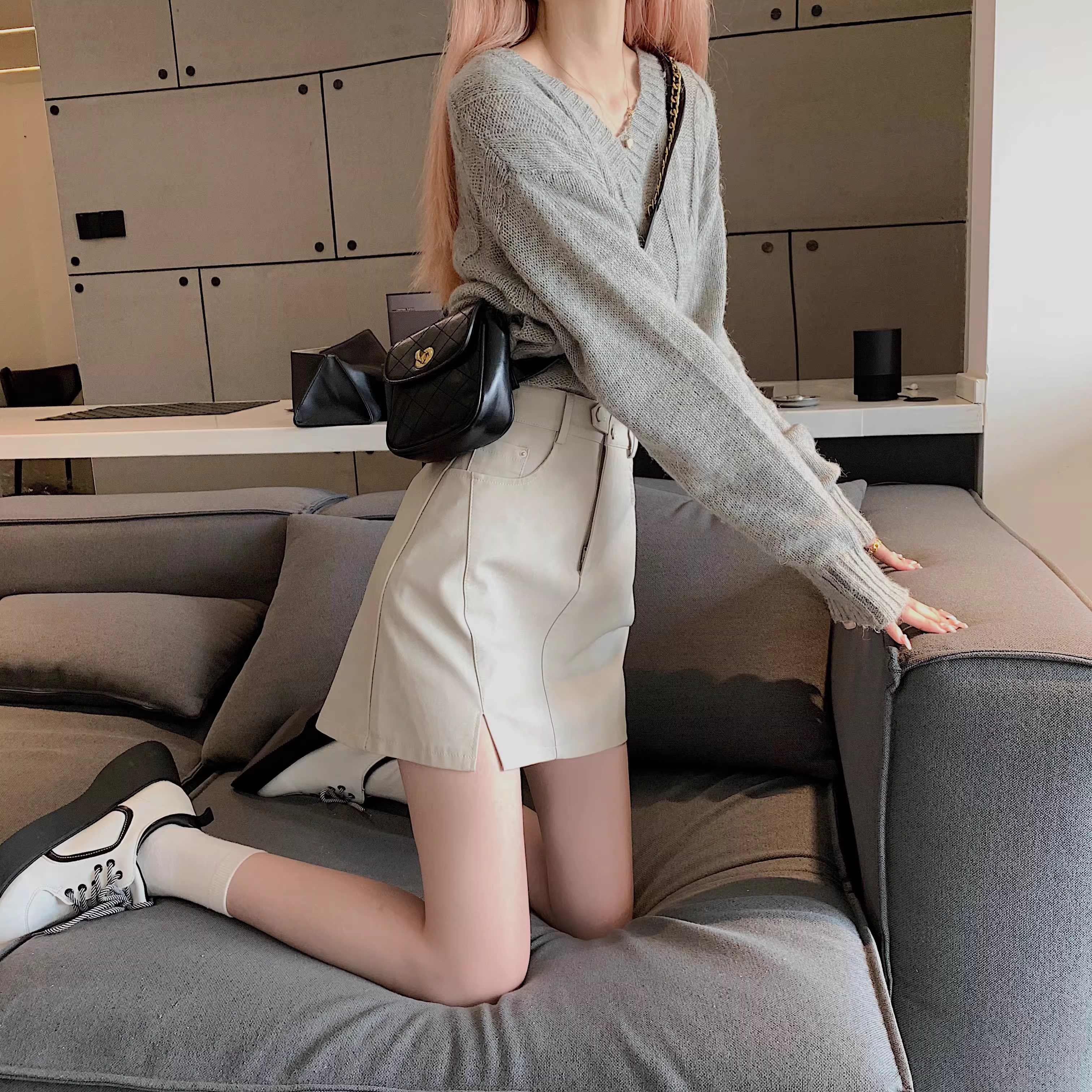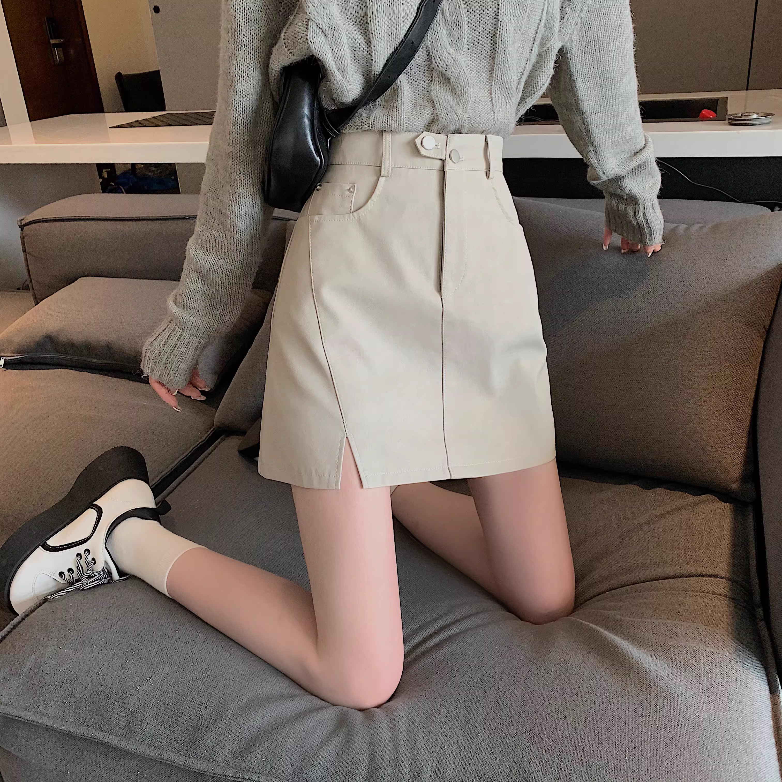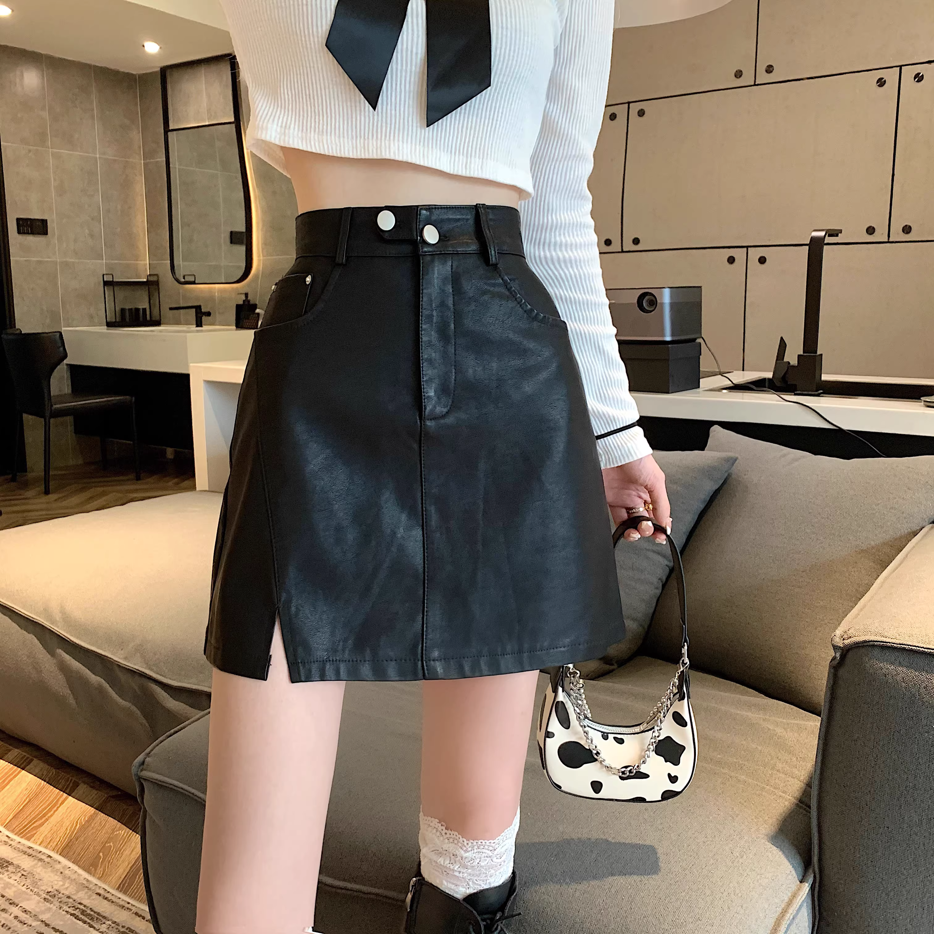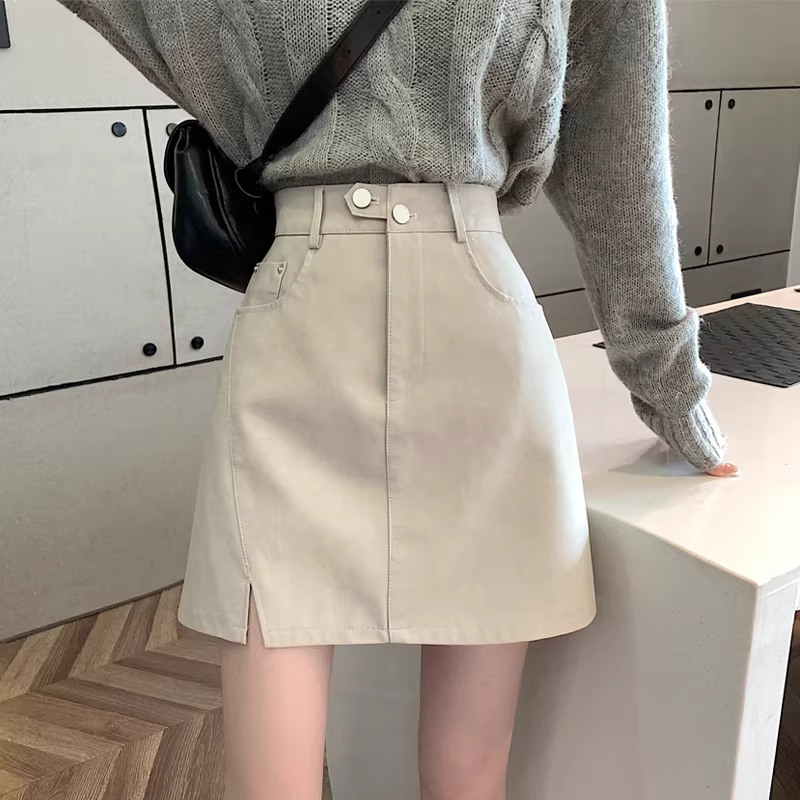 - Chân váy da PU màu mơ La Chapelle dành cho nữ, mẫu mới thu đông 2025, cạp cao, dáng ôm, xẻ tà, kiểu A, mini.