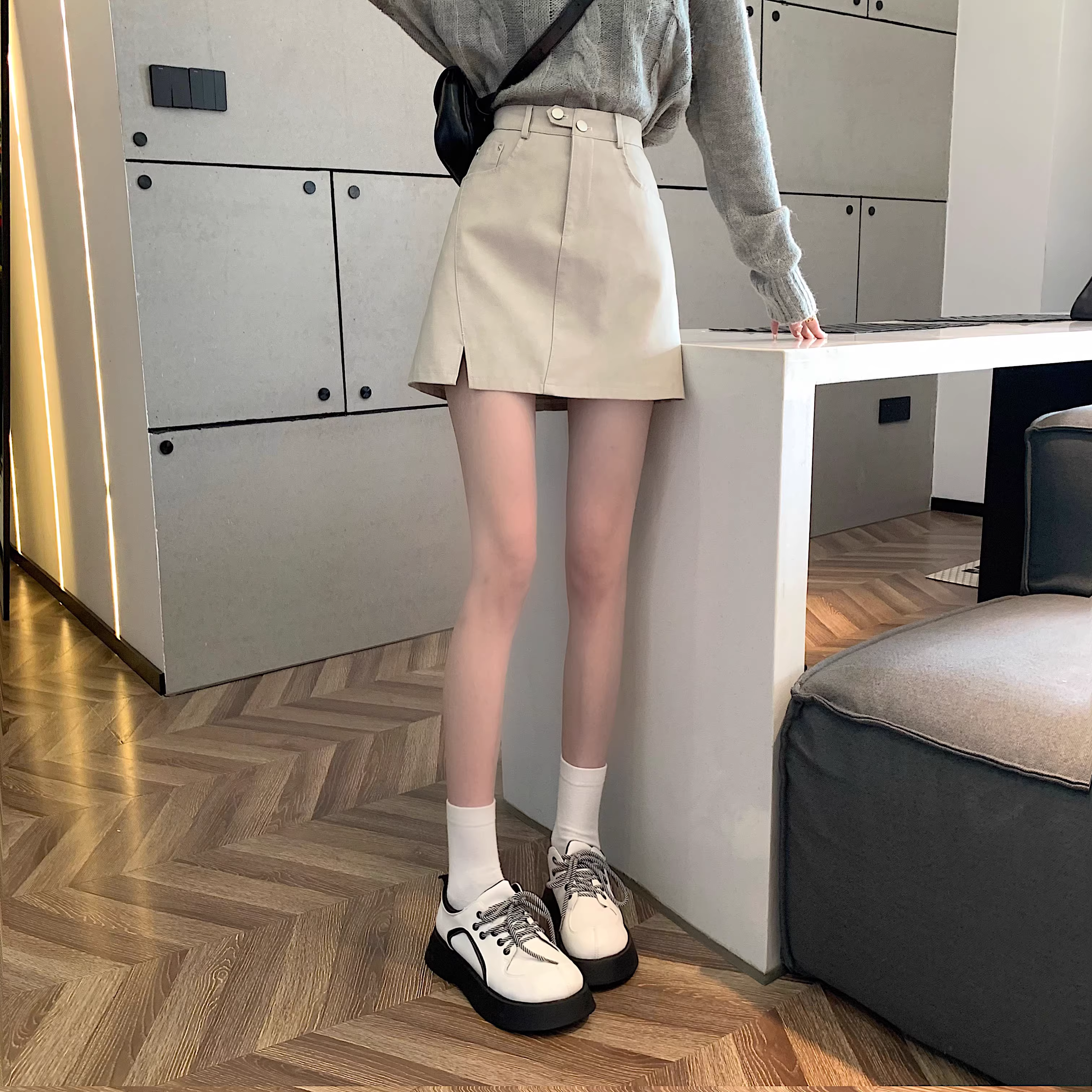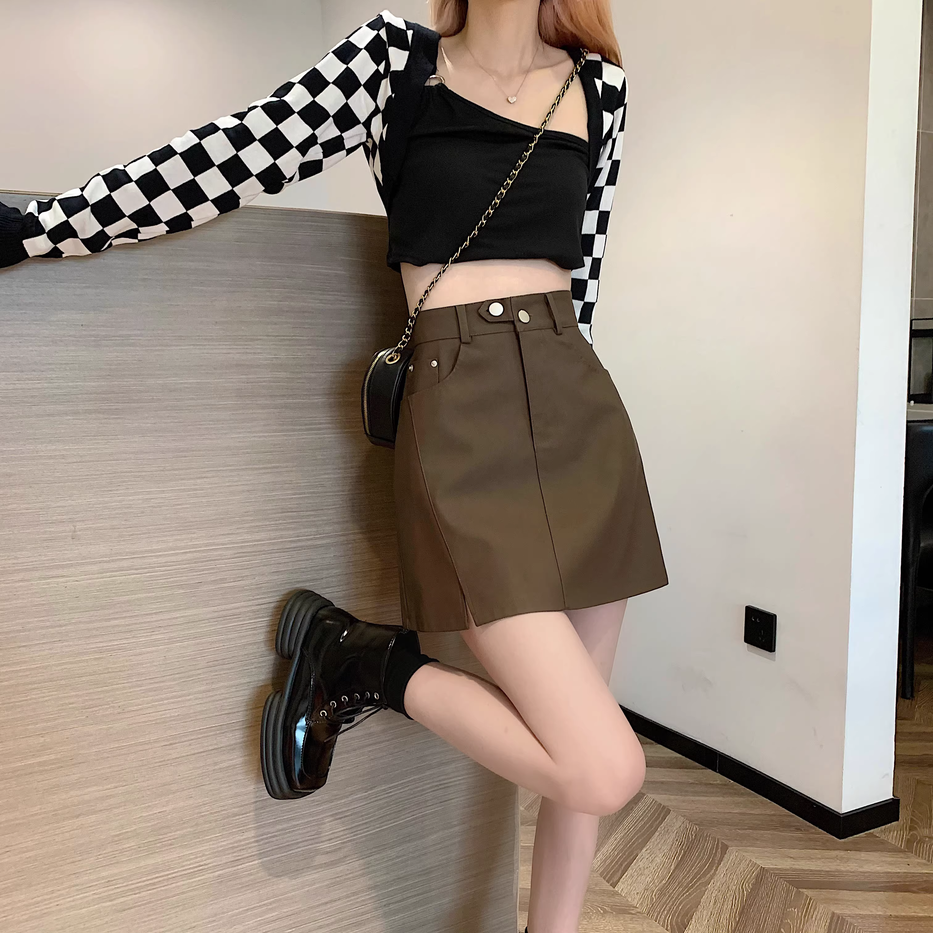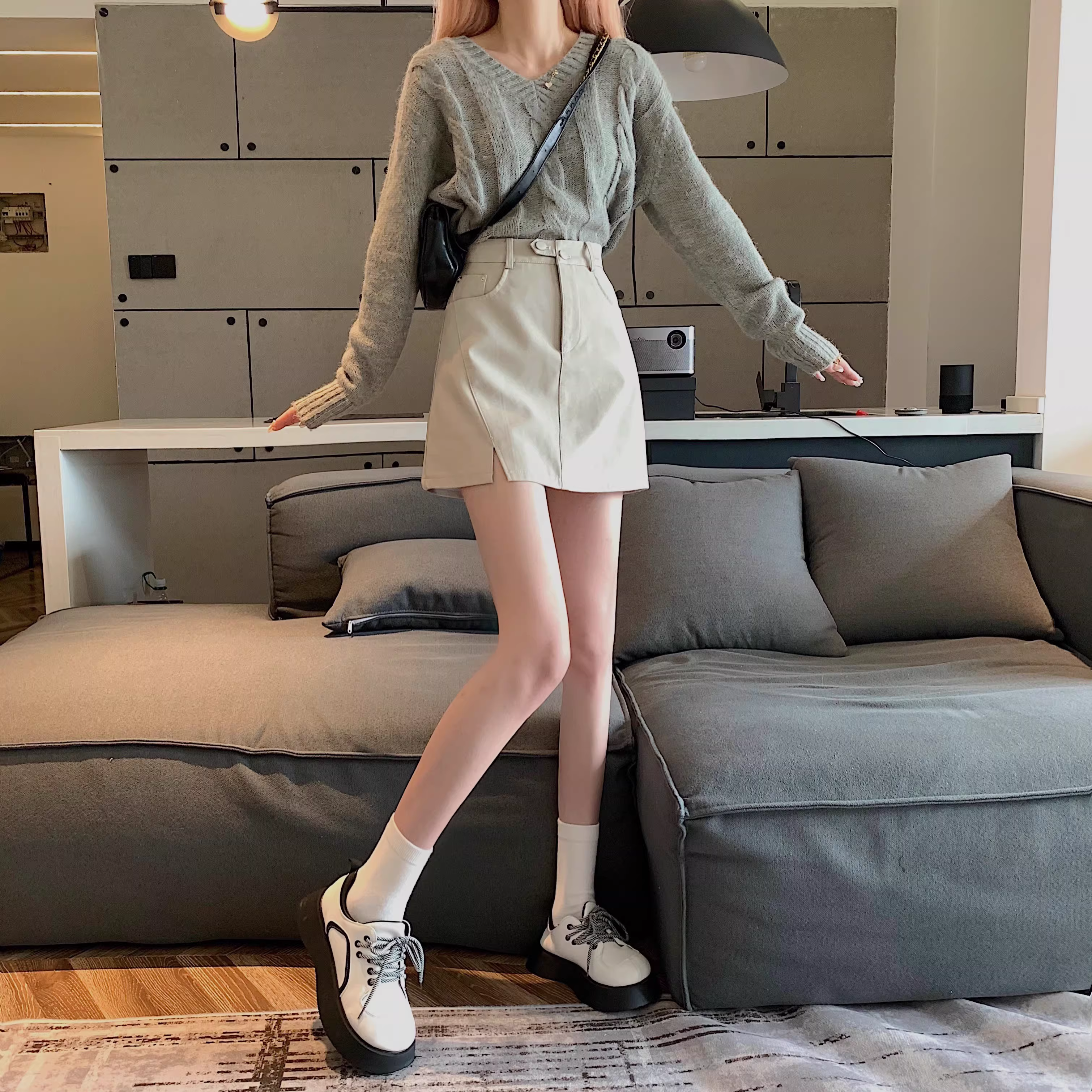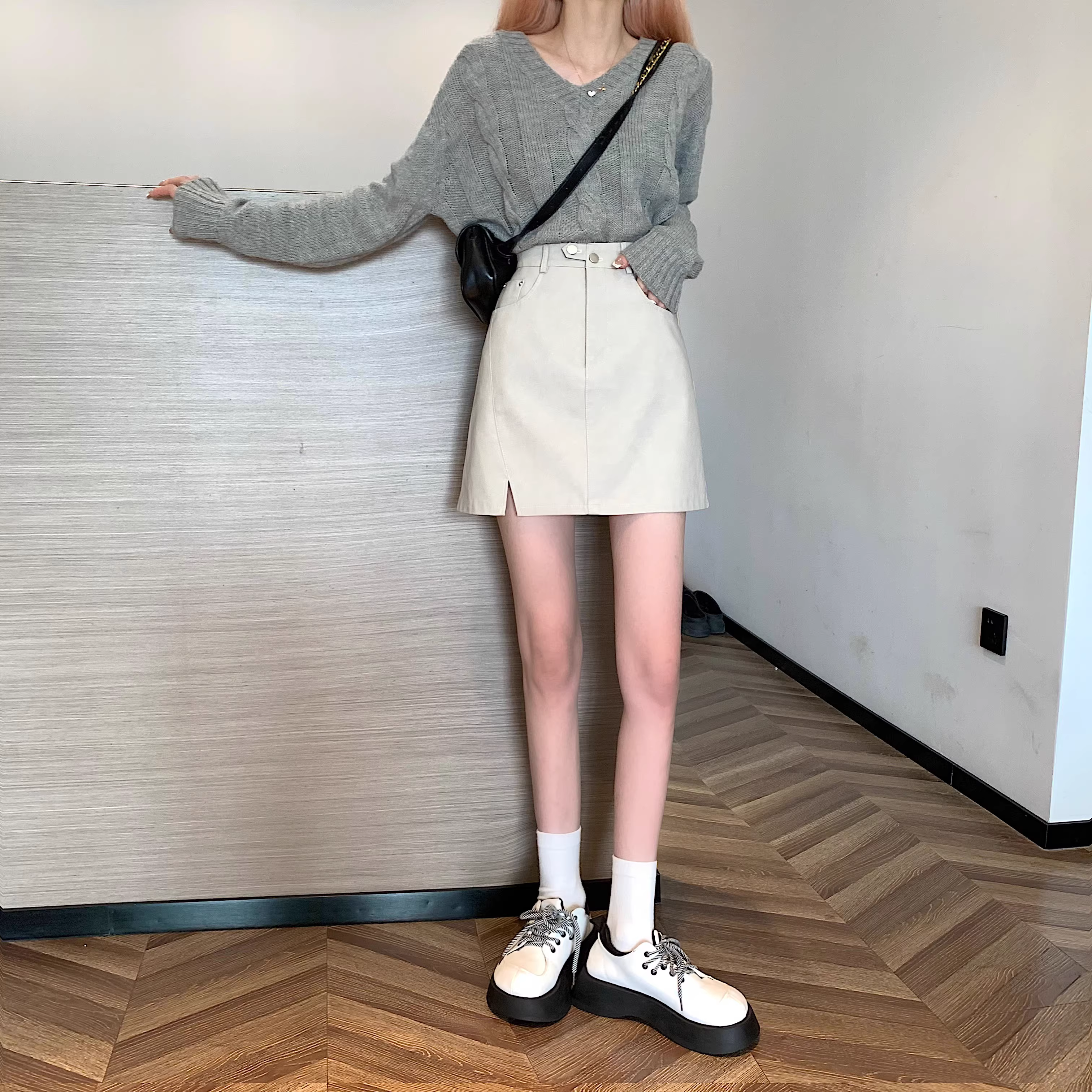 - Chân váy da PU màu mơ La Chapelle dành cho nữ, mẫu mới thu đông 2025, cạp cao, dáng ôm, xẻ tà, kiểu A, mini.