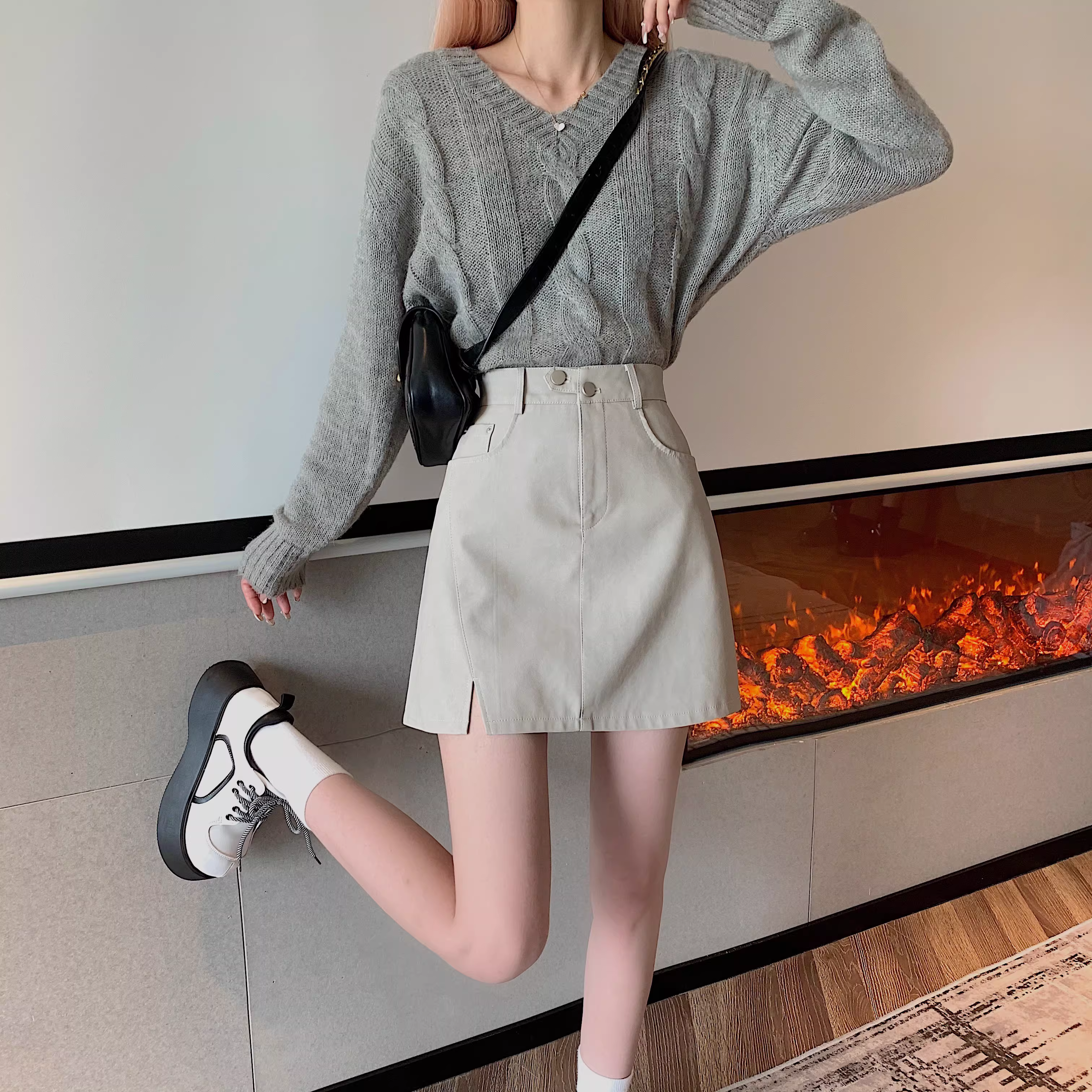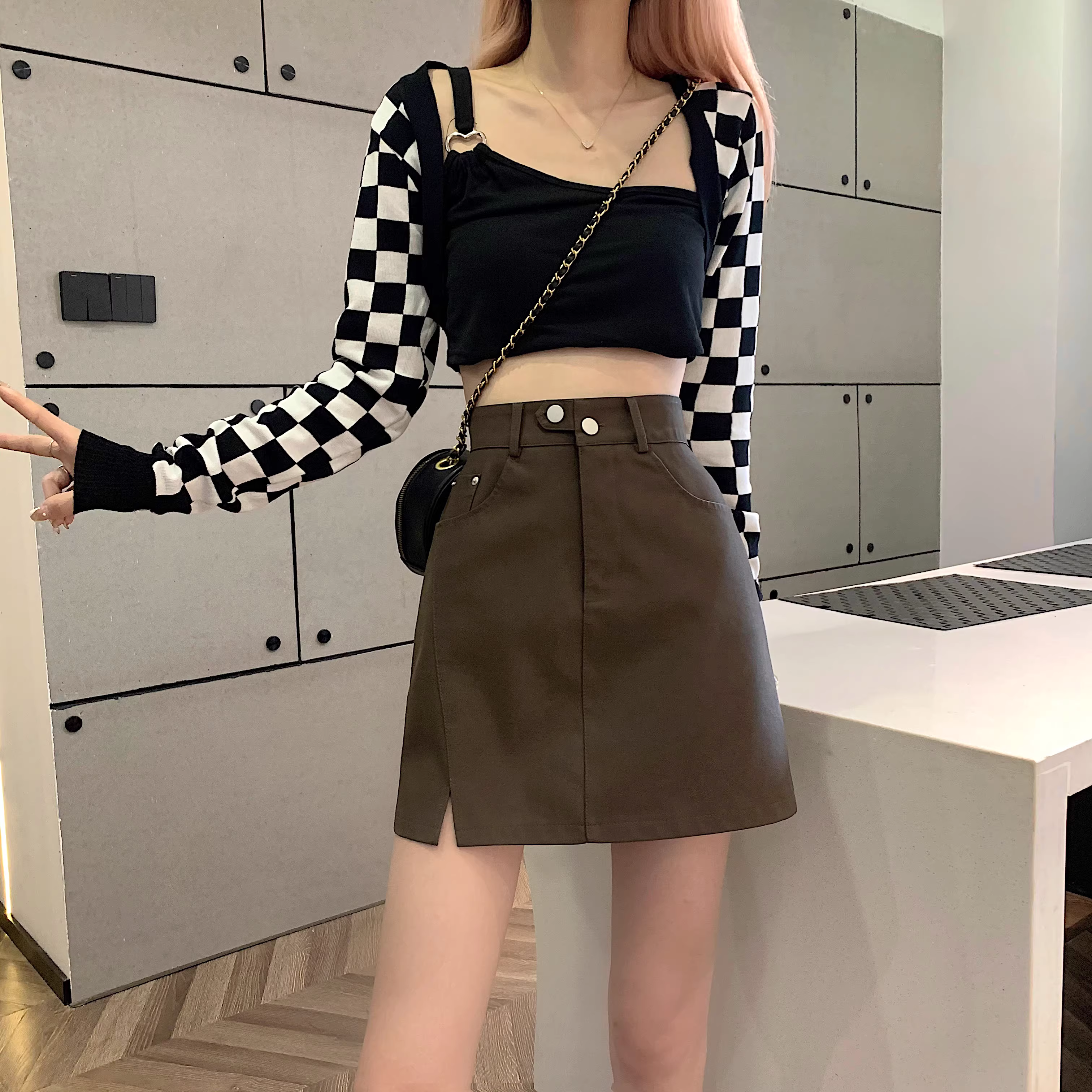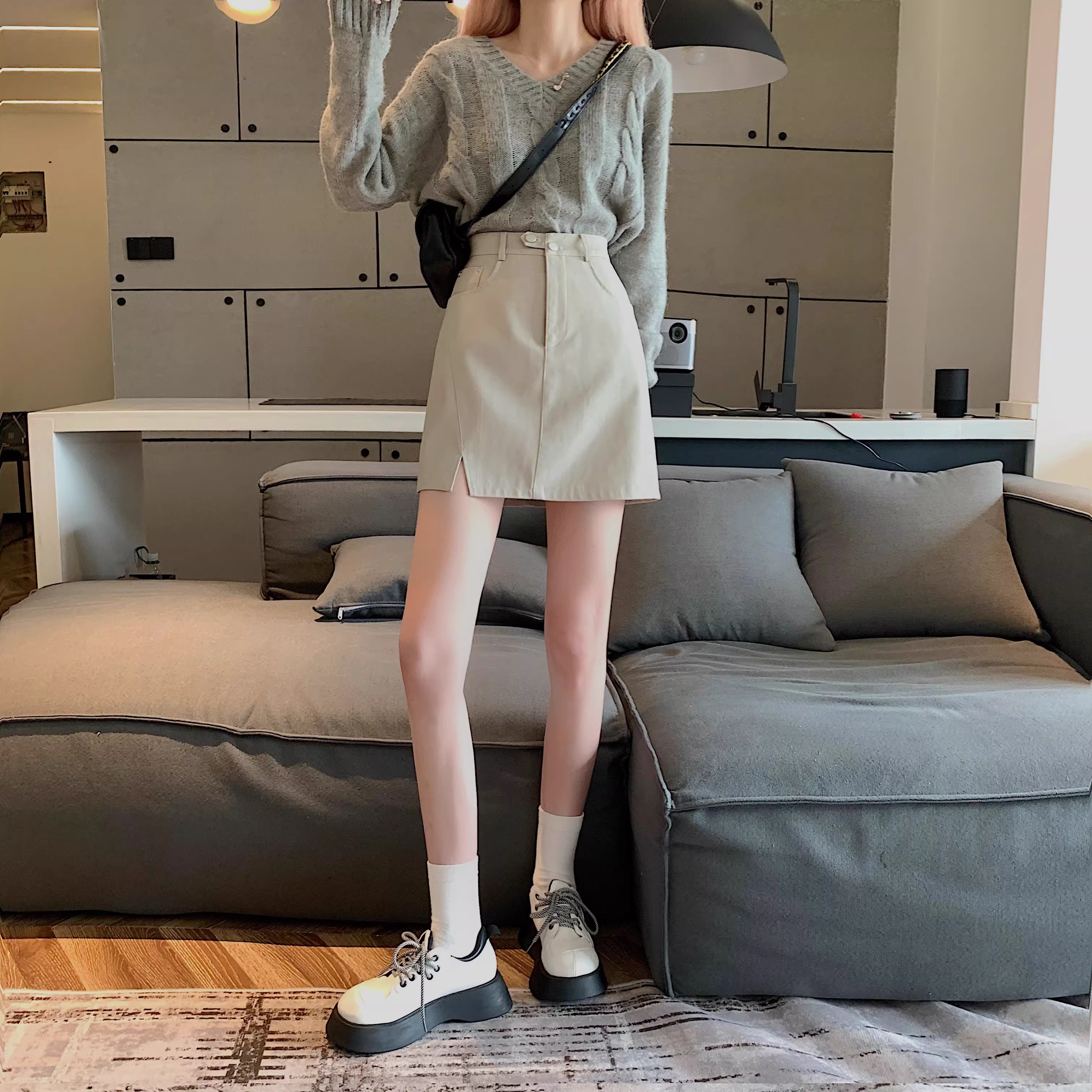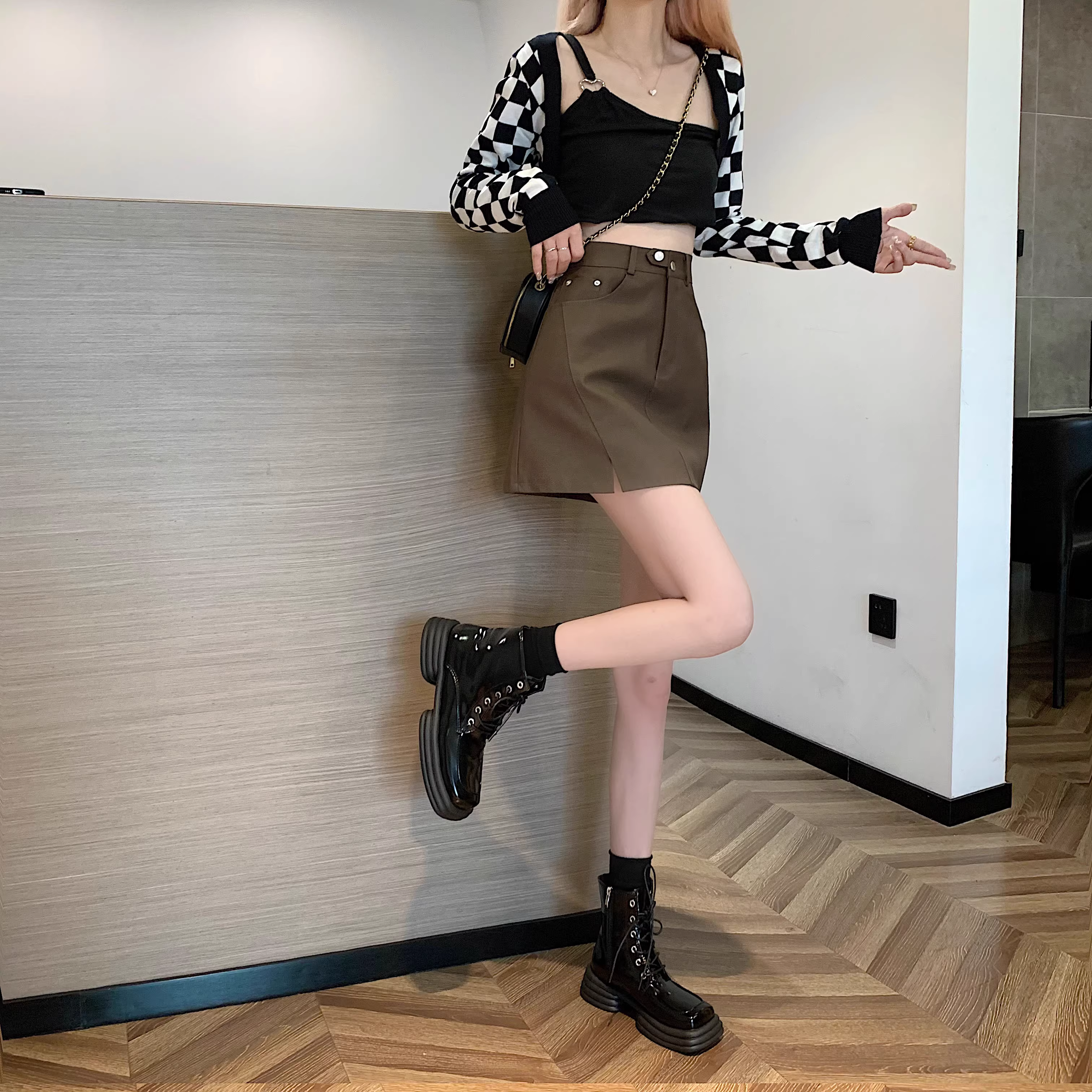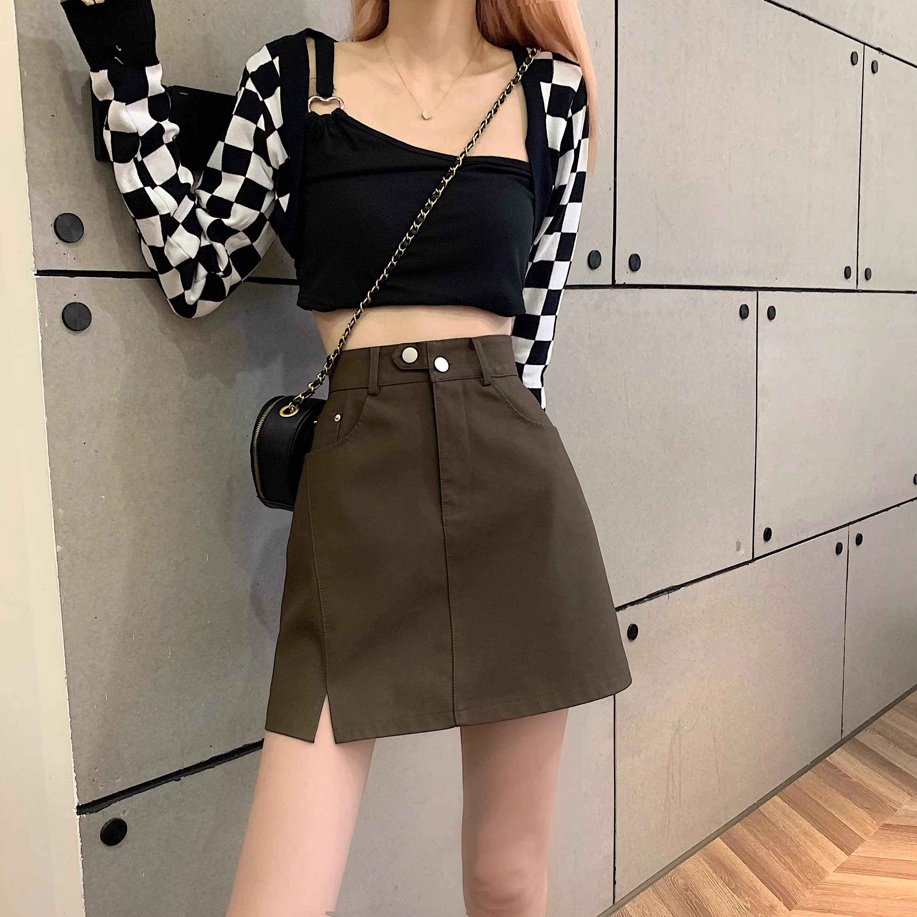 - Chân váy da PU màu mơ La Chapelle dành cho nữ, mẫu mới thu đông 2025, cạp cao, dáng ôm, xẻ tà, kiểu A, mini.