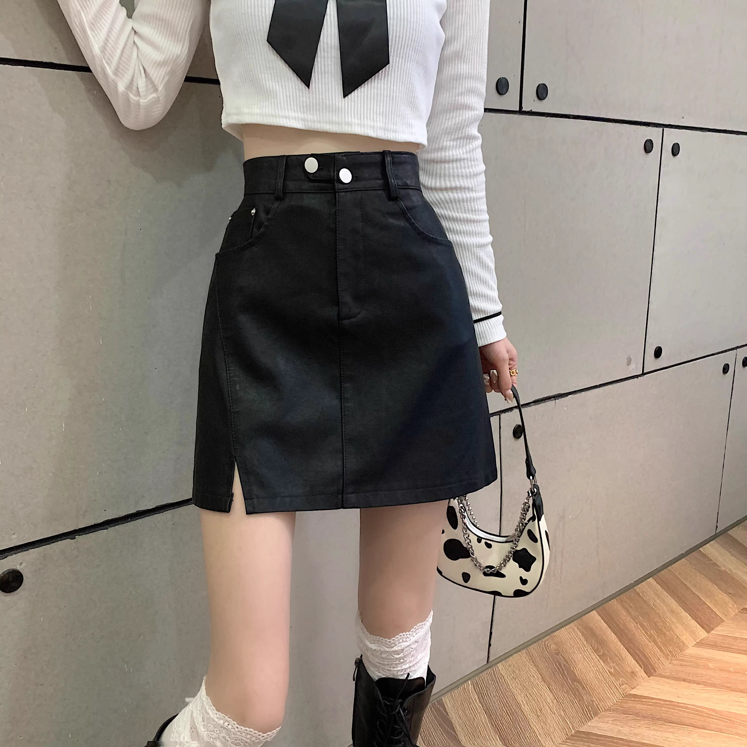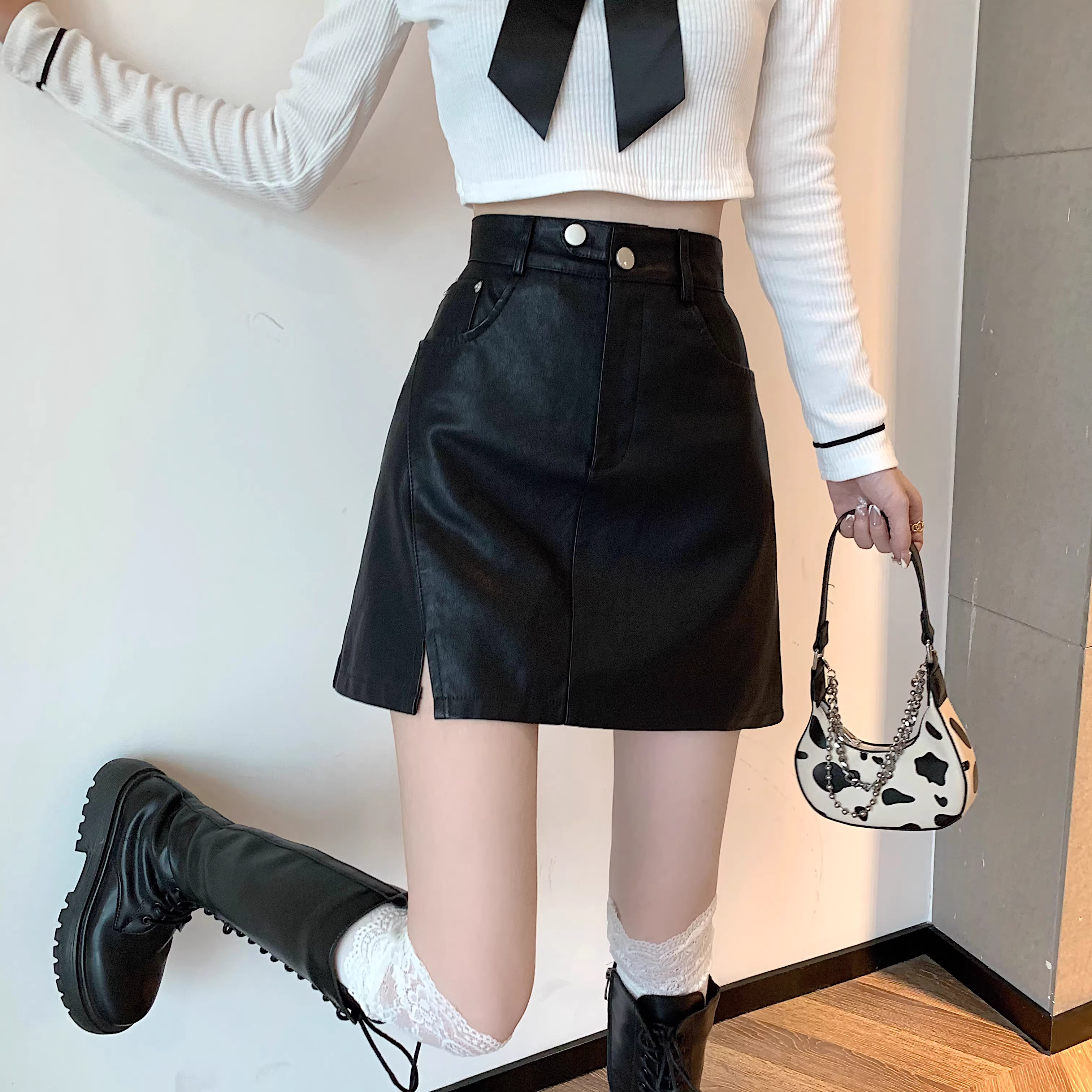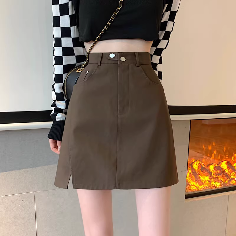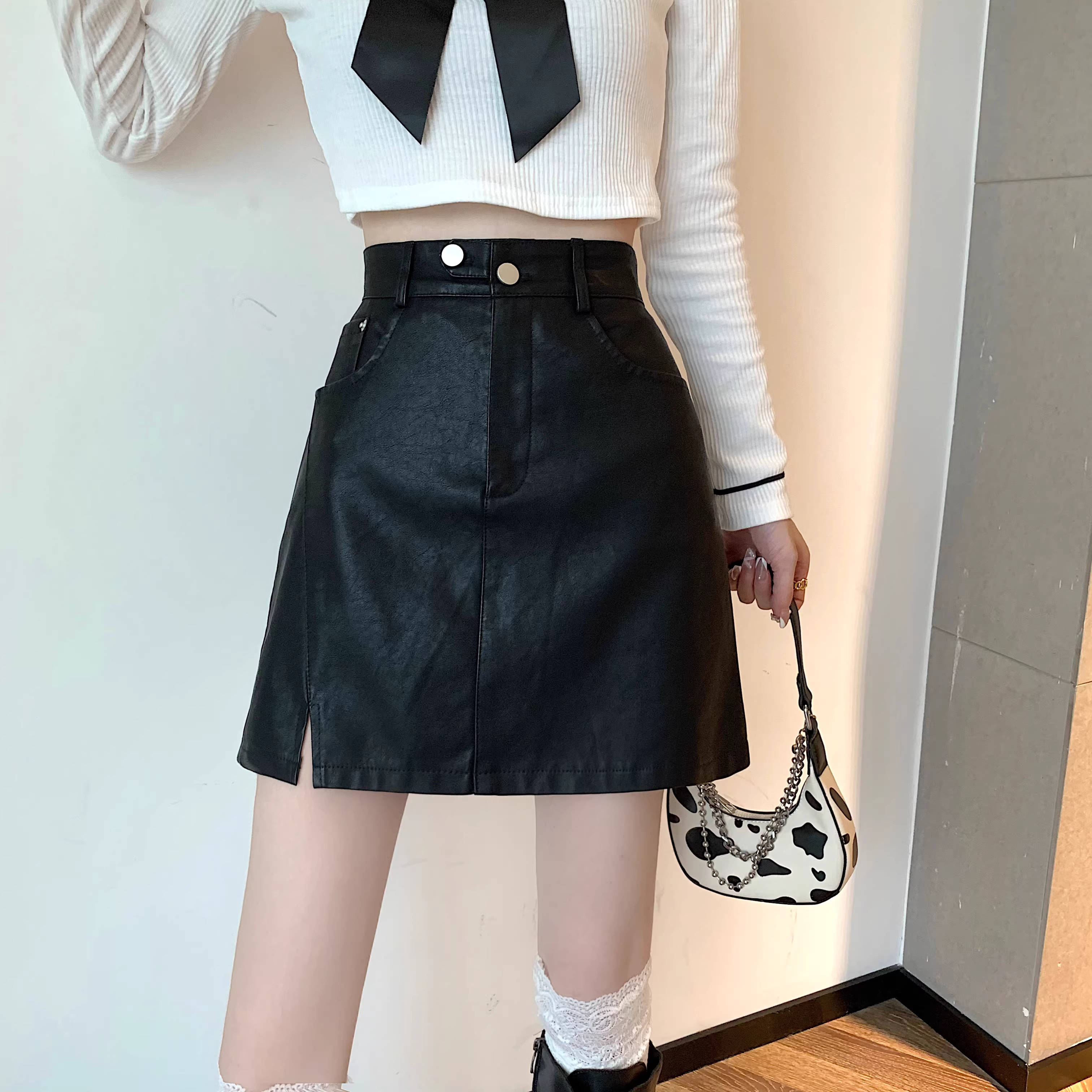 Chân váy da PU màu mơ La Chapelle dành cho nữ, mẫu mới thu đông 2025, cạp cao, dáng ôm, xẻ tà, kiểu A, mini.