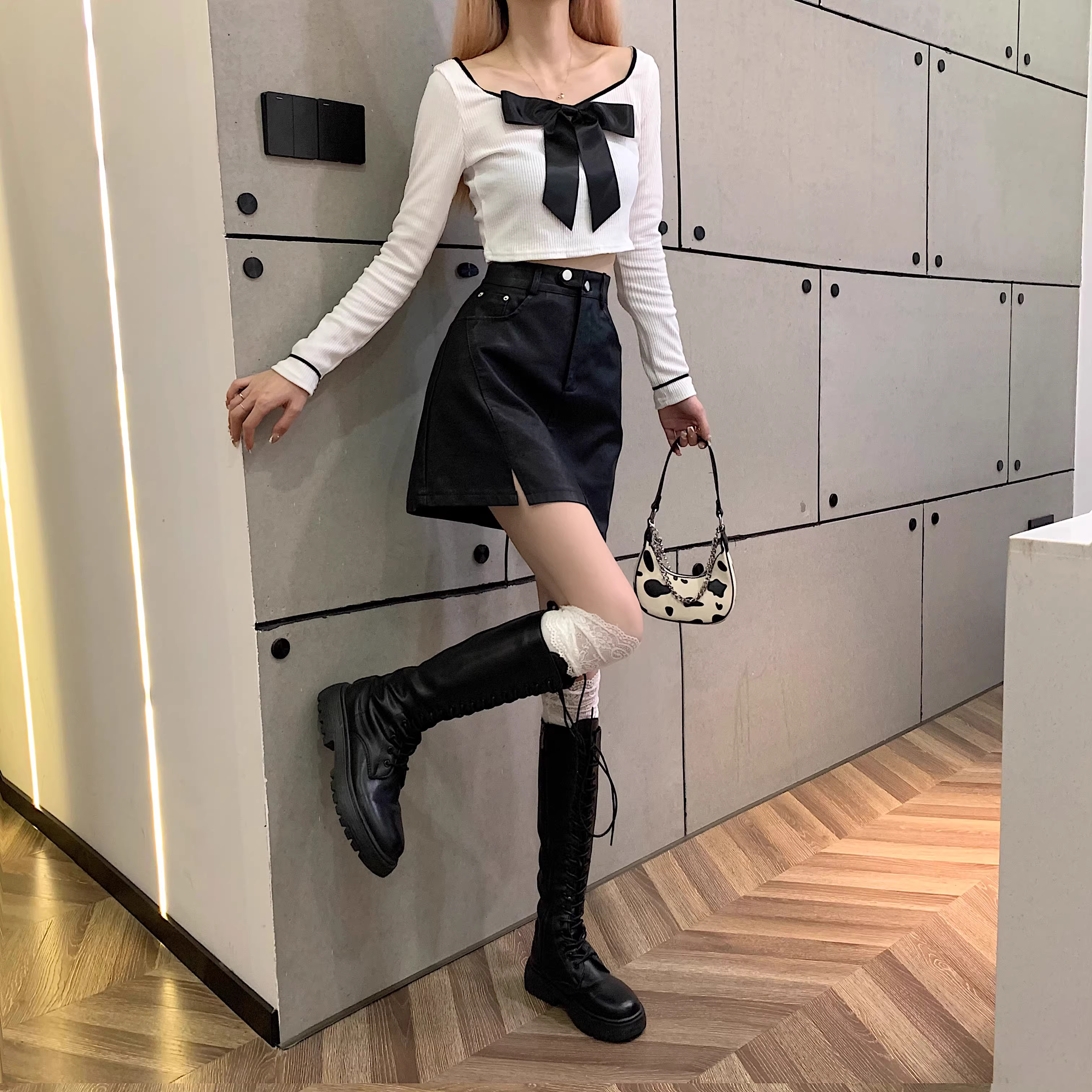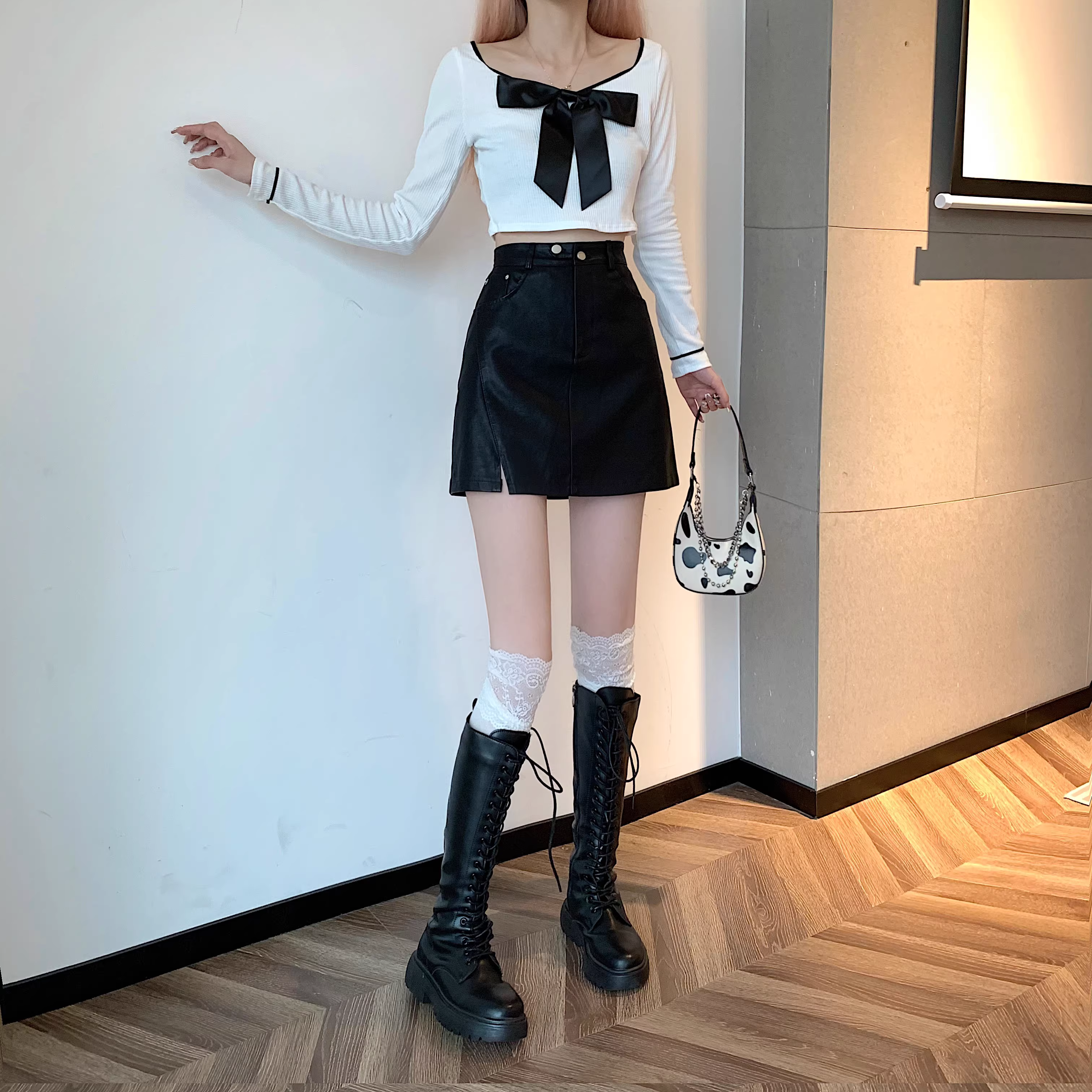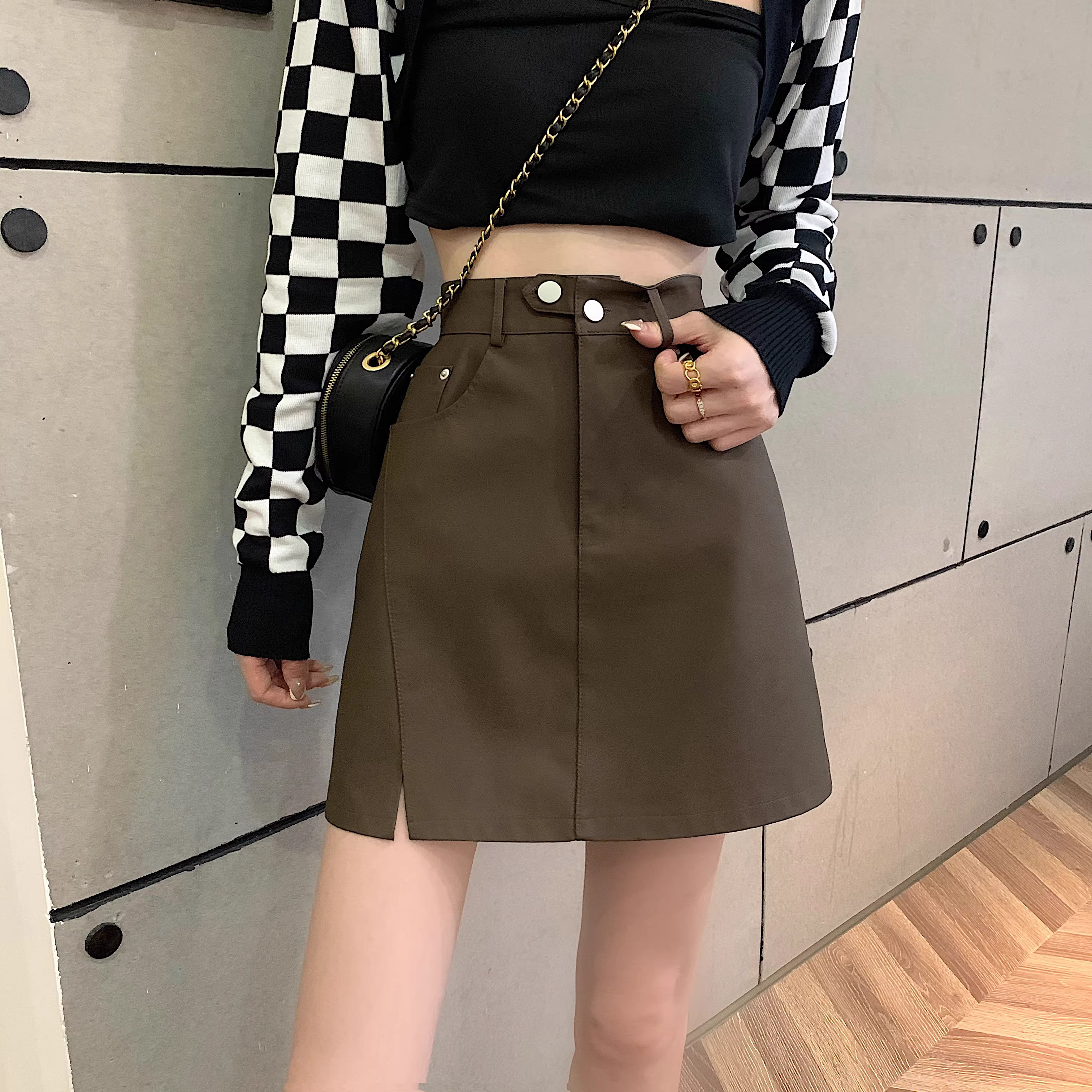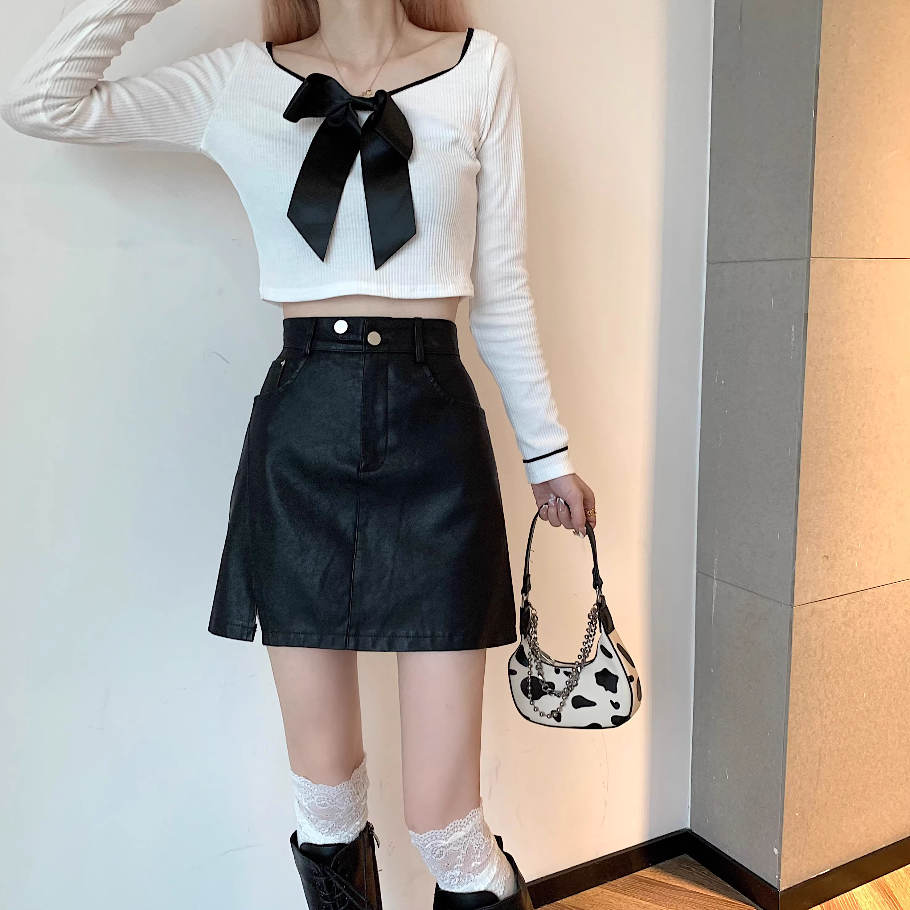 Chân váy da PU màu mơ La Chapelle dành cho nữ, mẫu mới thu đông 2025, cạp cao, dáng ôm, xẻ tà, kiểu A, mini.