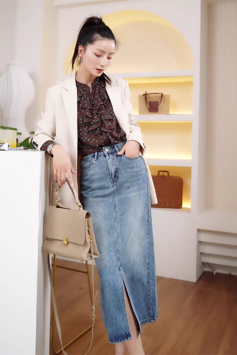 - Chân váy midi denim xẻ tà cao cấp, kiểu dáng chữ A, mùa xuân dành cho nữ