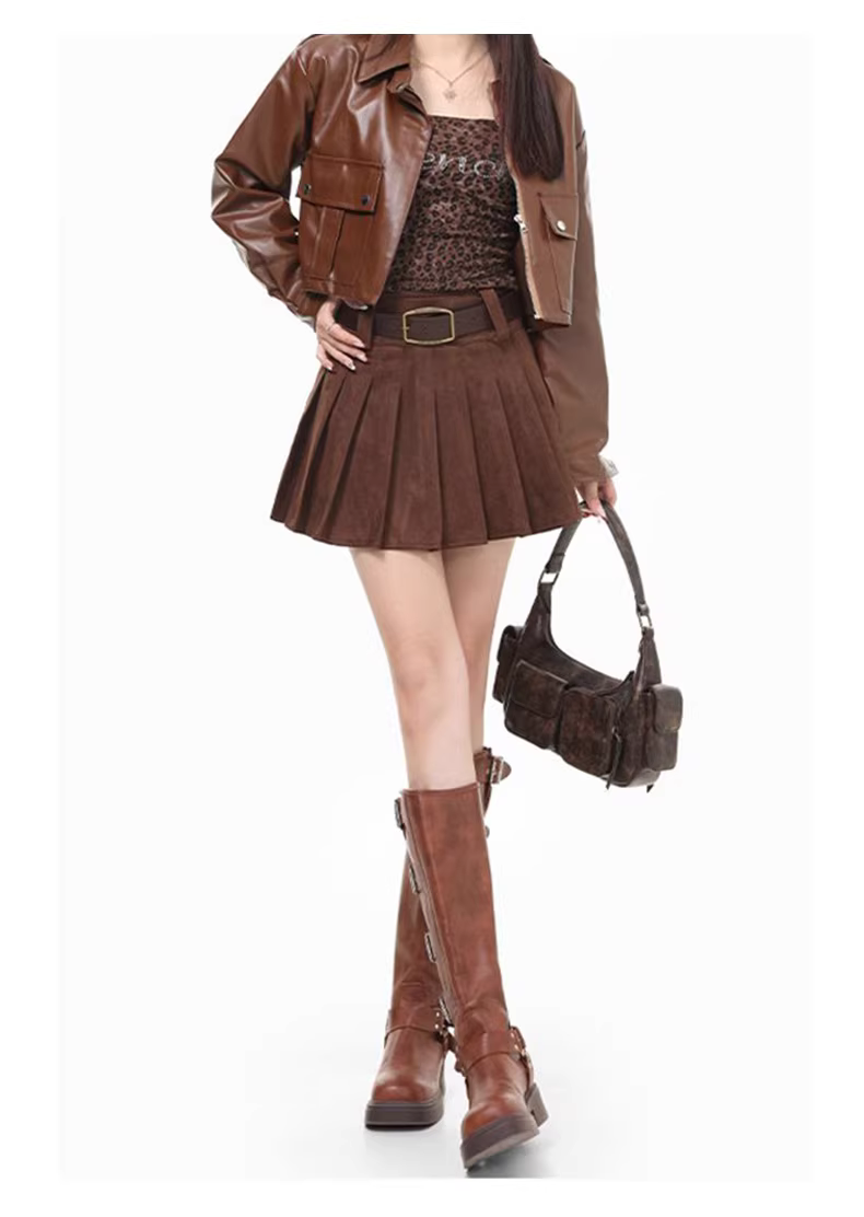 - Chân váy xếp ly cao eo màu cà phê La Chapelle dành cho nữ, mẫu mới thu đông 2025, có dây lưng, kiểu dáng nhỏ nhắn, ngắn, phong cách thường ngày