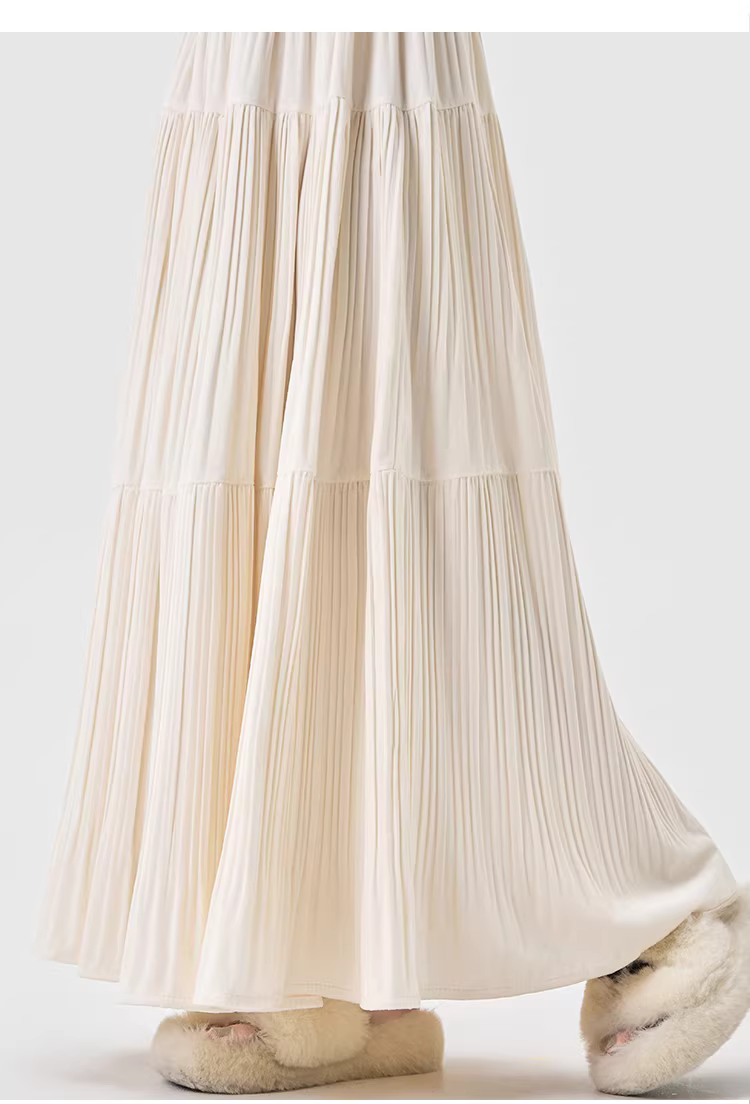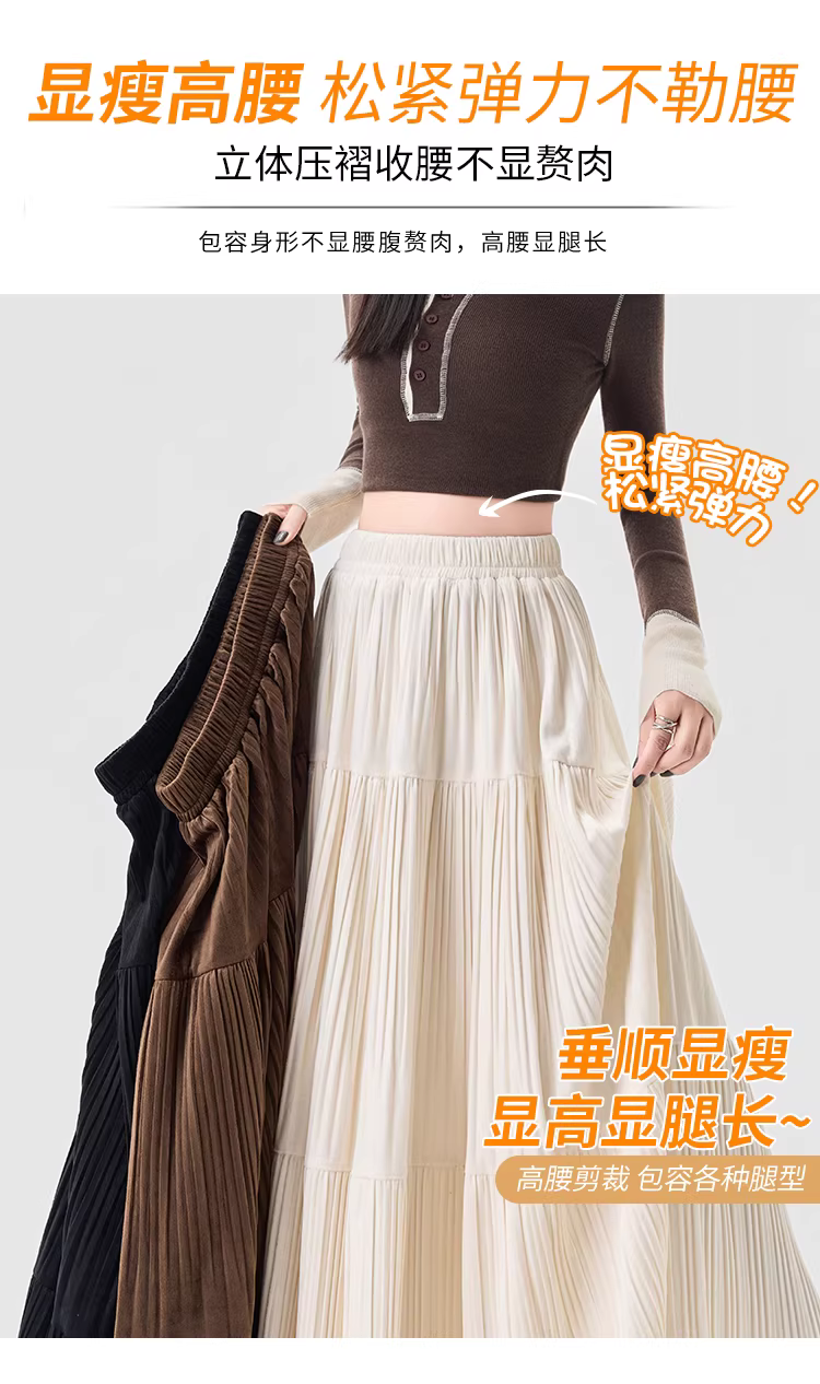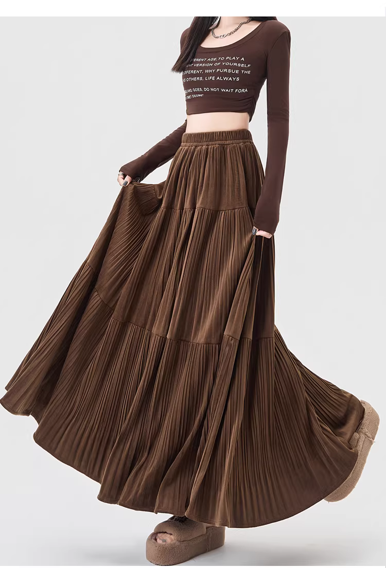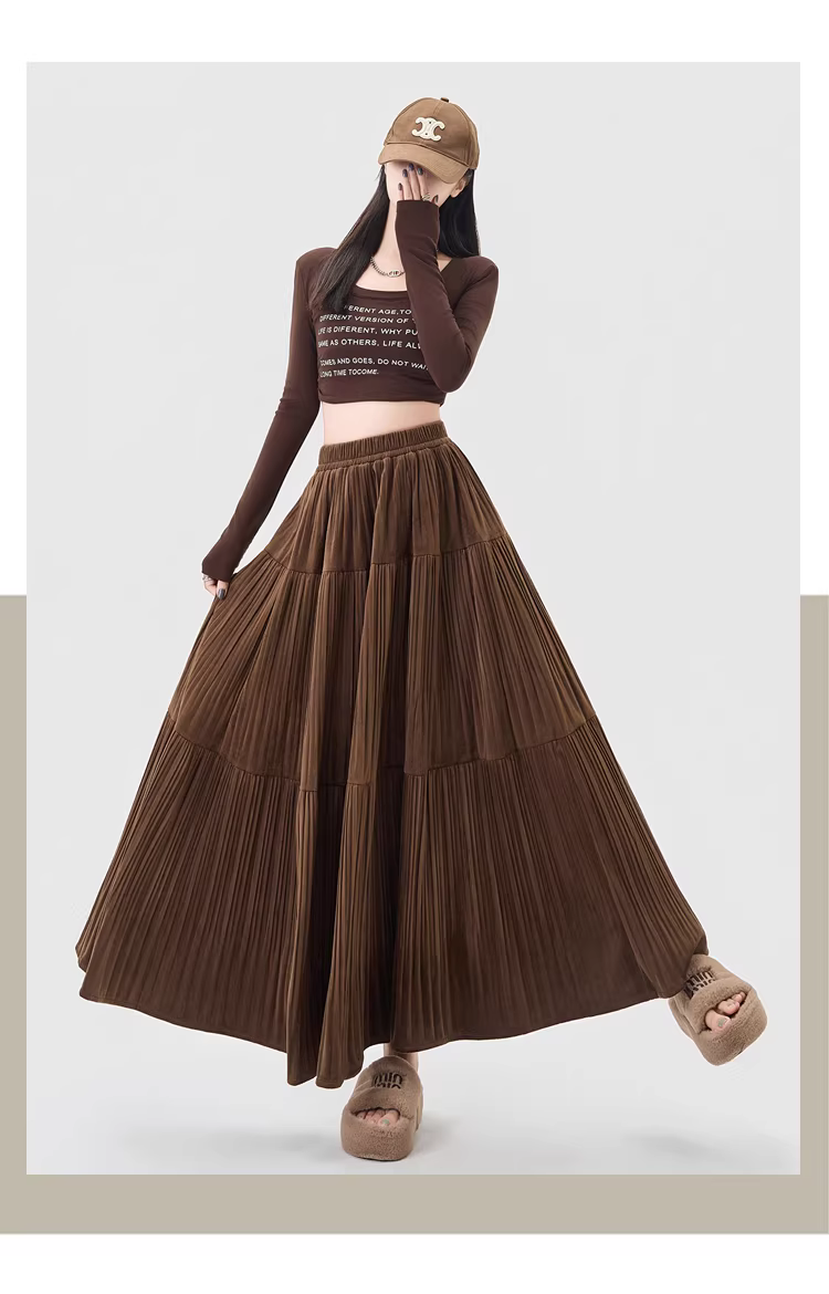 - Chân váy xếp ly cao eo màu cà phê La Chapelle dành cho nữ, mẫu mới thu đông 2025, dáng chữ A dài trung bình, nhiều tầng