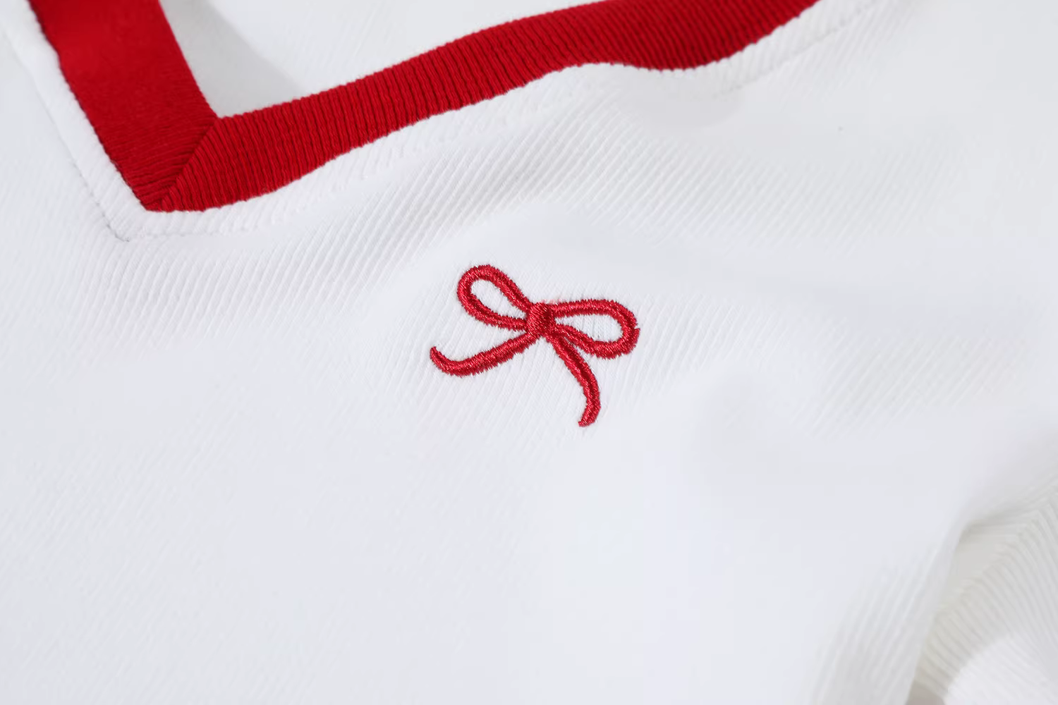 - CuteGirl kiểu Mỹ cổ điển sọc tương phản cổ chữ V ngắn tay áo thun nữ mùa hè ngắn gợi cảm thêu nơ hàng đầu