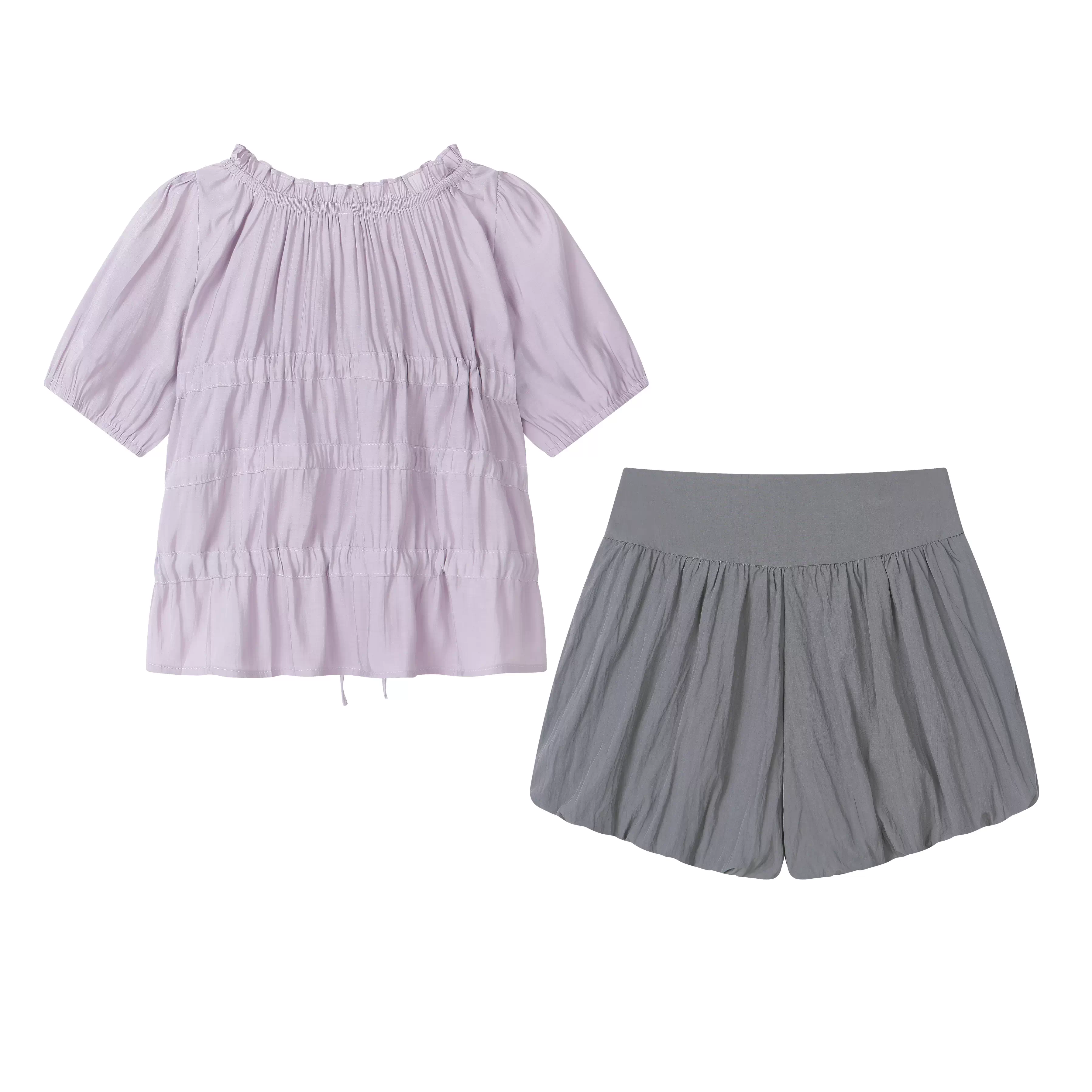 - CuteGirl phong cách Pháp màu tím tay phồng có dây buộc cổ tròn áo sơ mi nữ mùa hè nụ hoa váy phồng quần bộ đồ hai mảnh