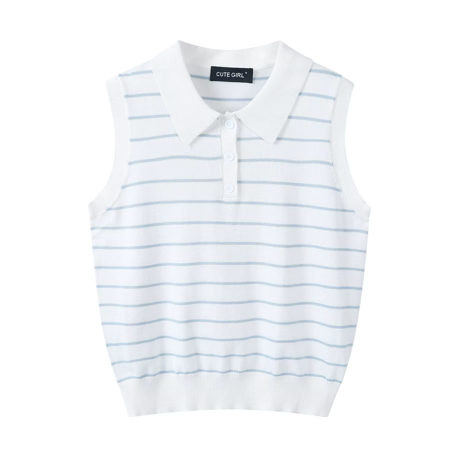 - CuteGirl thiết kế theo phong cách phối màu áo polo sọc cổ áo dệt kim không tay dành cho nữ đầu thu dáng ôm vừa vặn áo đa năng