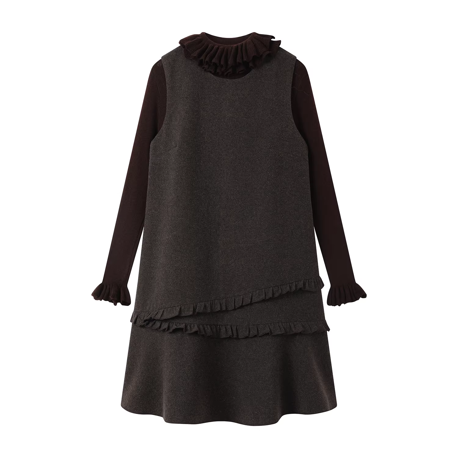 - Đầm liền thân không tay kiểu Pháp xếp tầng cho nữ, bộ hai mảnh áo vest len màu xám mùa thu đông