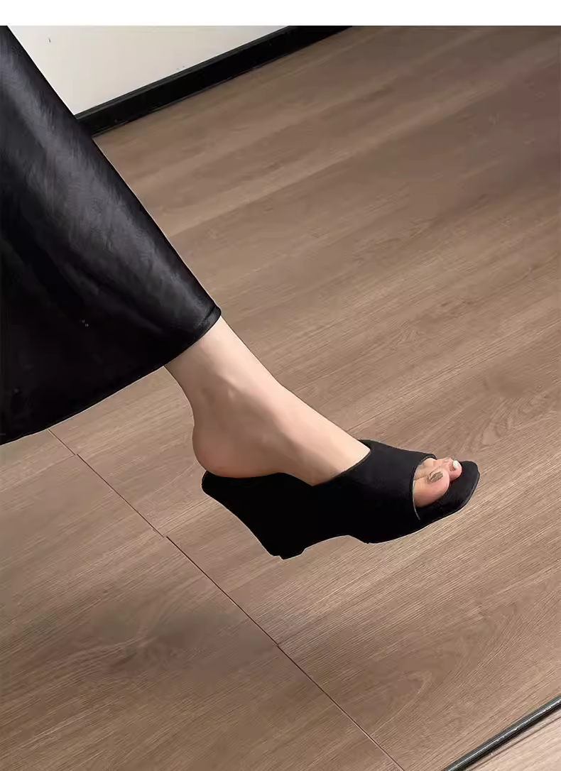 Dép đế xuồng cao cấp màu đen dành cho nữ, trang phục mùa hè, kiểu mới 2025, thích hợp phối với váy, dép kiểu Pháp.