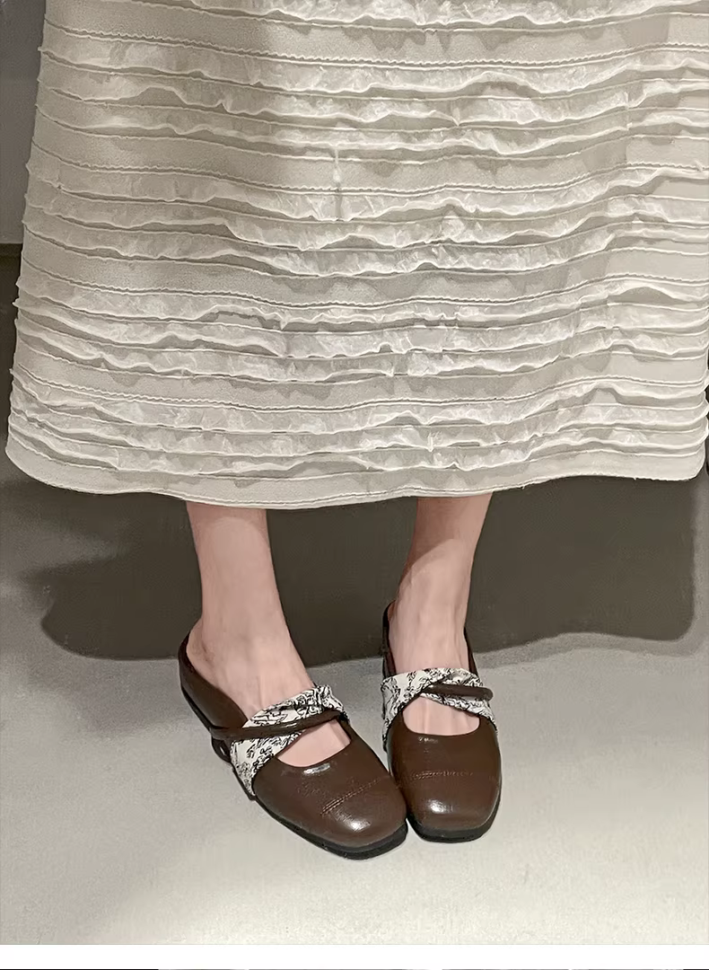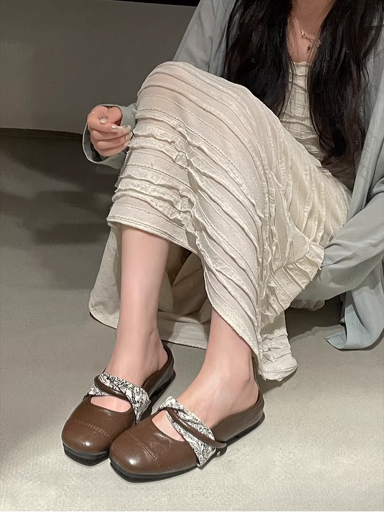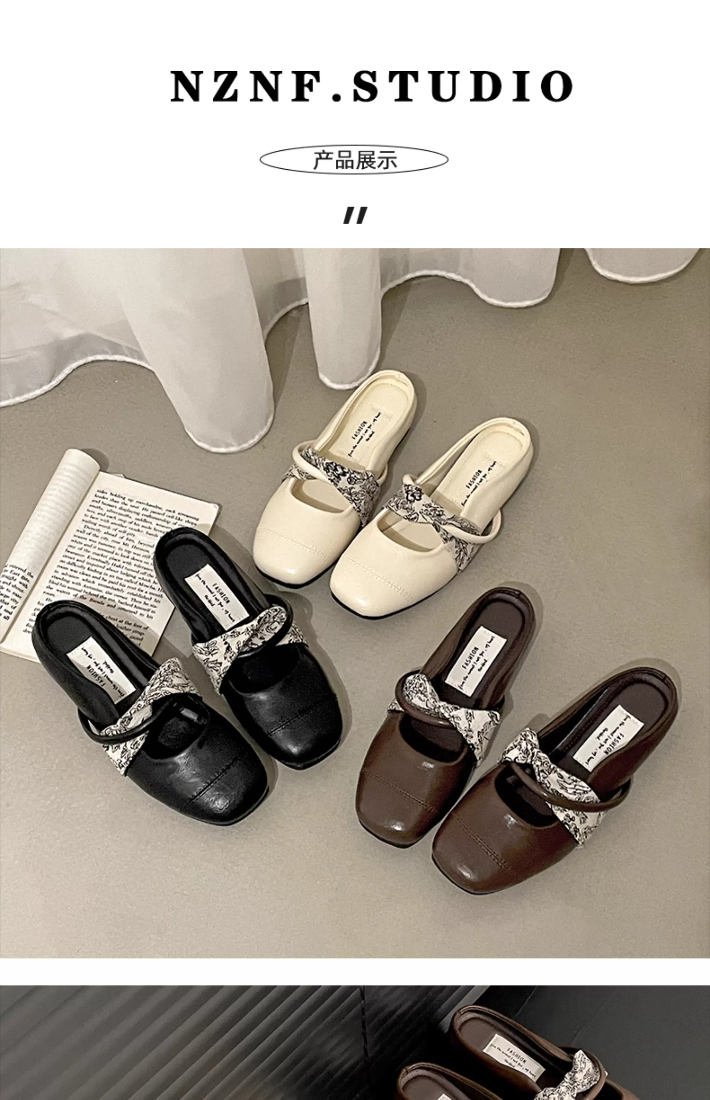 Dép nữ đế thấp cổ điển màu đen, mũi kín, tăng chiều cao, thời trang mùa hè, kiểu mới 2025, thích hợp phối cùng váy, dép kiểu Pháp.