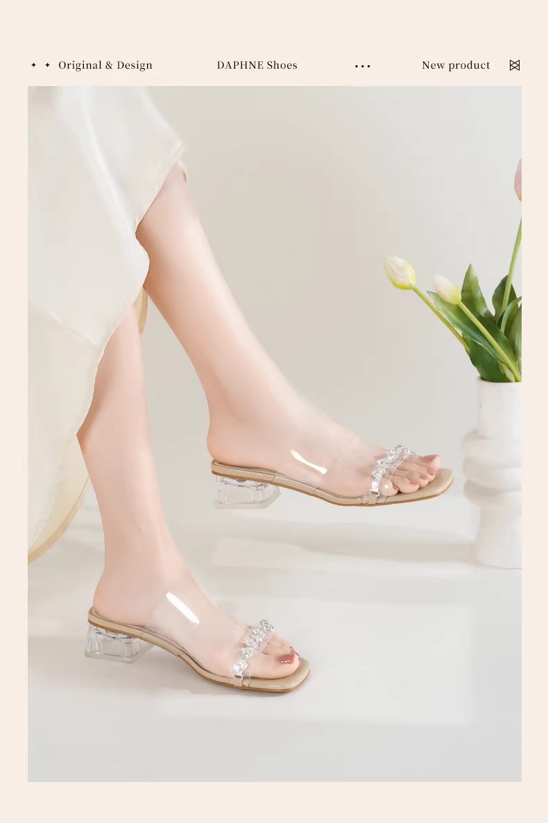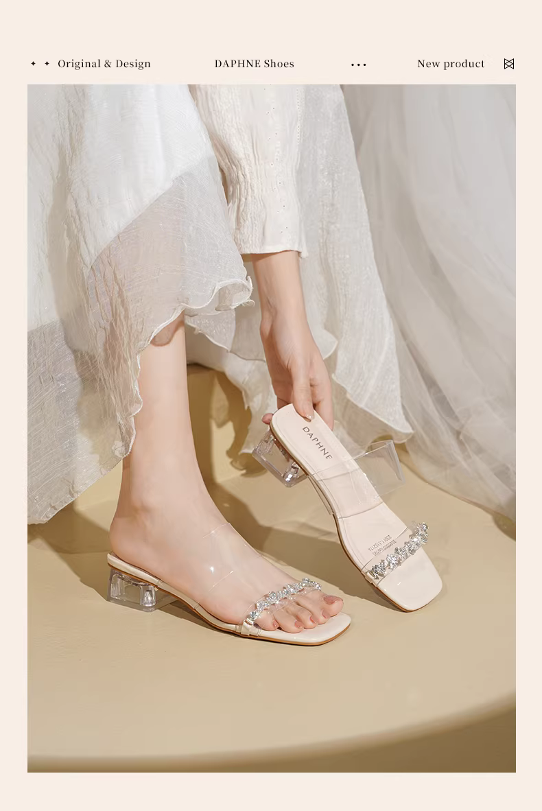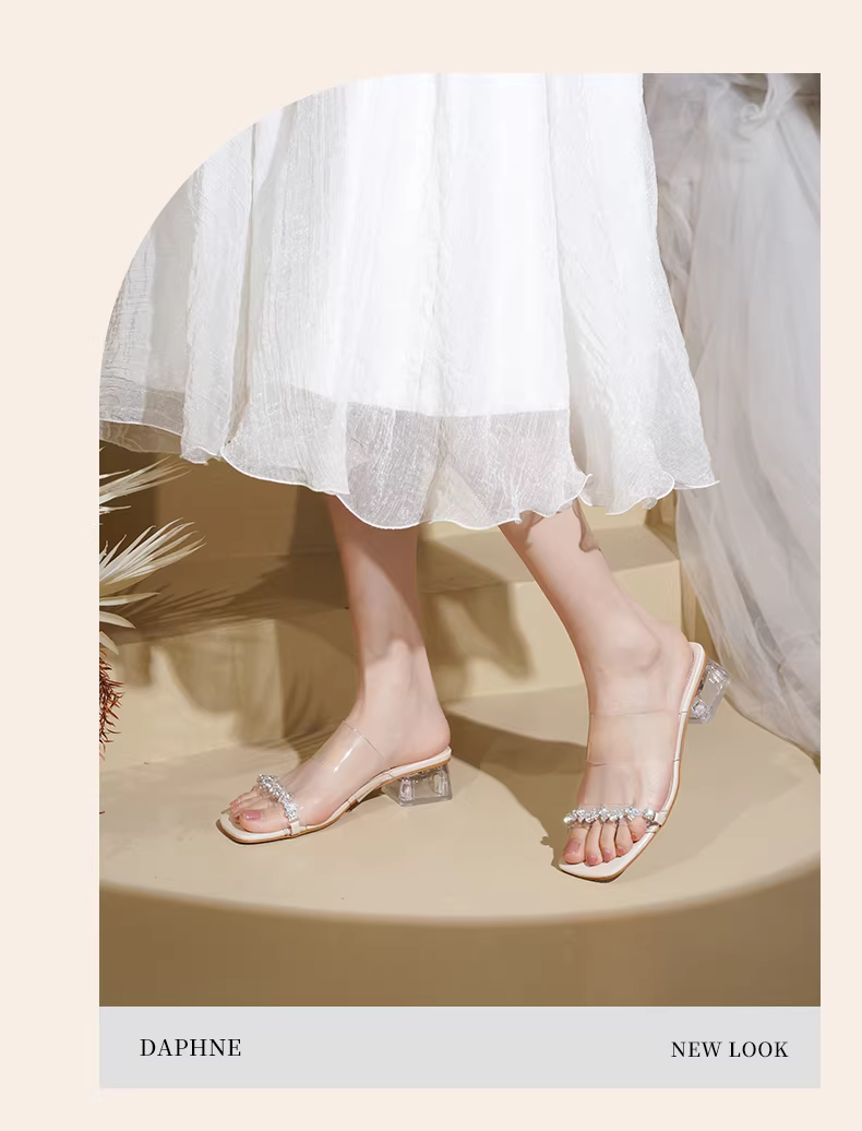 - Dép trong suốt Daphne dành cho nữ 2025, kiểu mới mùa hè, kiểu Pháp, mũi hở, gót dày và cao.