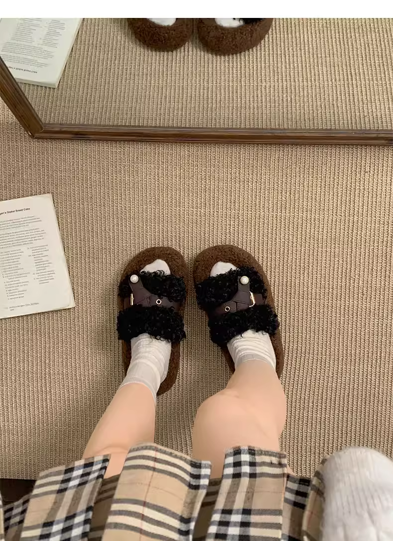 Đôi dép lê nữ đế dày phong cách retro màu trắng, thích hợp đi ngoài trời, dép bông giữ ấm dày dặn mới mùa thu đông 2025.