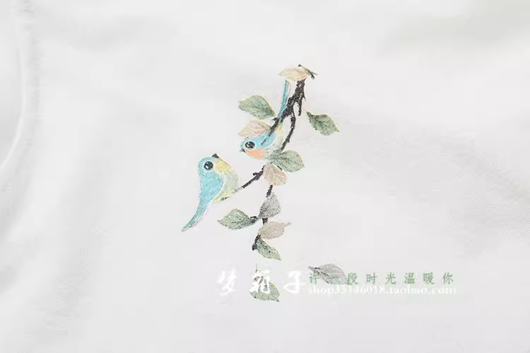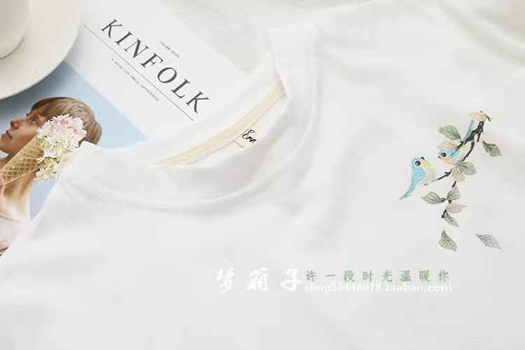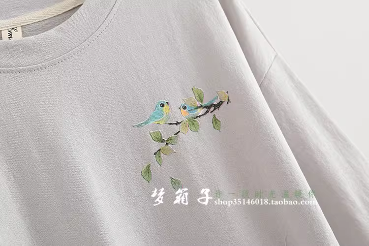水洗麻棉面料,卡通鸟儿清新小女孩印花,落肩宽松款