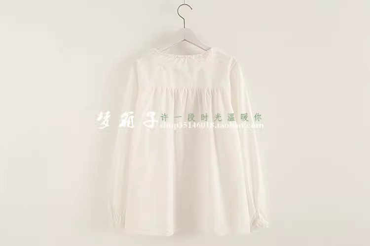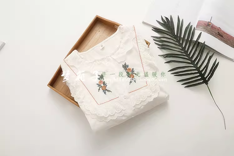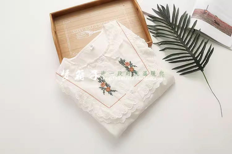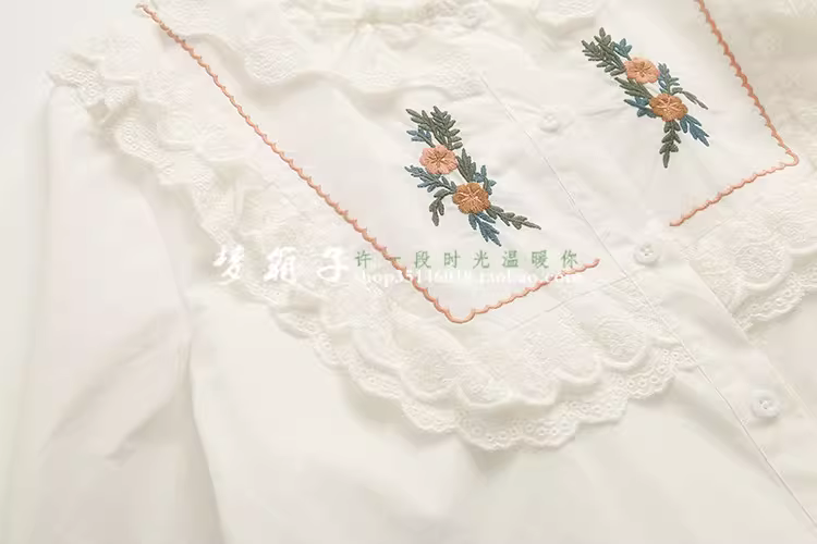 - Dream Box 2022 Thu Mới Thêu Hoa Áo Sơ Mi Cotton Nữ Viền Ren Cổ Tròn Dài Tay Áo Sơ Mi Trắng