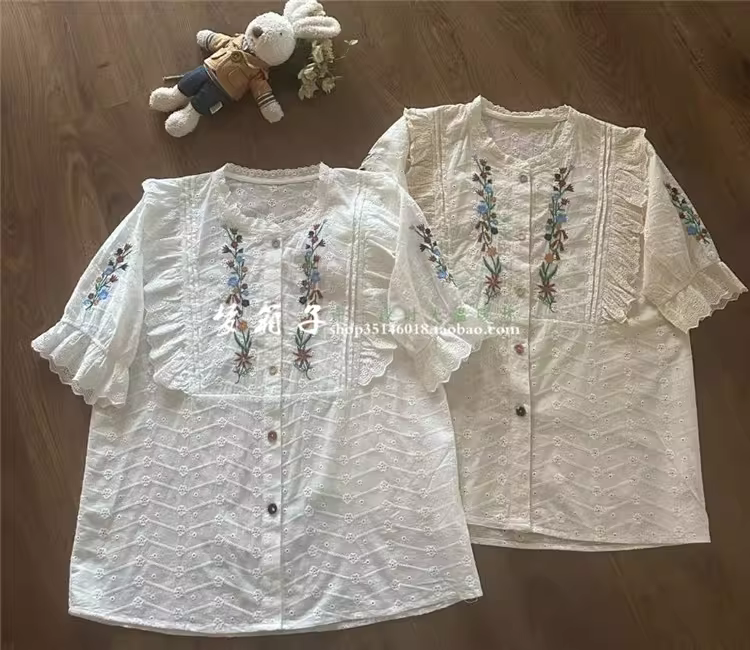- Dream Box 2023 Mùa hè mới Áo sơ mi cotton cổ đứng thêu hoa có cổ xếp nếp với các nút màu sắc và tay áo ngắn dáng rộng