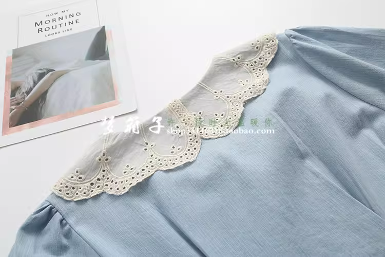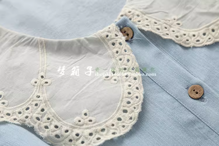 牛仔面料,镂空刺绣蕾丝娃娃领,腰间褶皱设计