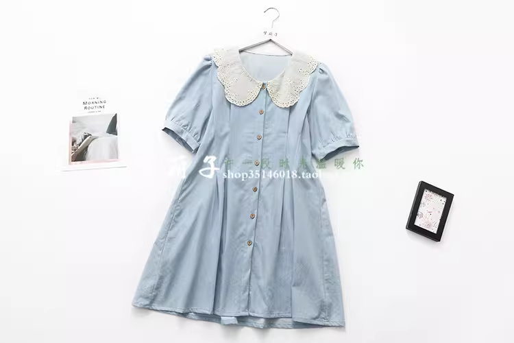 - Dream Box 2023 Mùa Hè Mới Tươi Mát Màu Trơn Váy Denim Nữ Thêu Ren Cổ Búp Bê Tay Ngắn Eo-Cinching đầm
