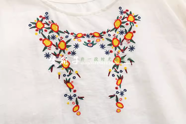 麻布面料,凉爽舒适,重工花朵刺绣,前短后长设计,清新百搭