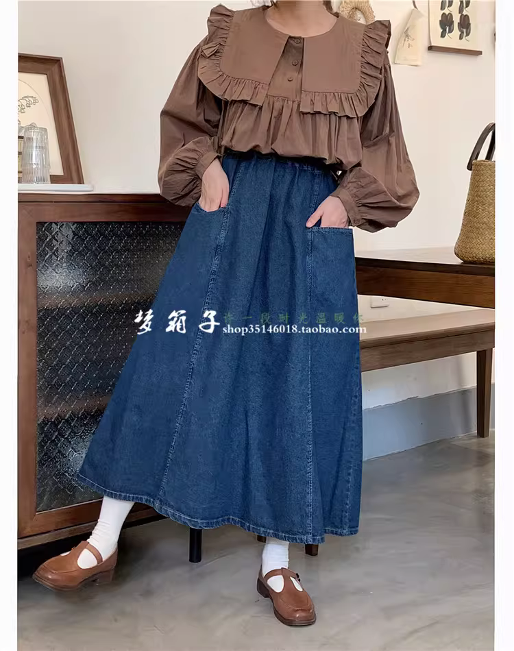 - Dream Box 2023 Mùa Xuân Mới Vintage Màu Váy Denim Lưng Thun Túi Lớn Chữ A Giảm Béo Chiều Dài Trung Bình Váy