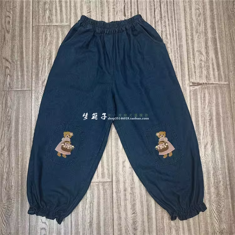 牛仔面料,熊小姐姐刺绣,木耳边灯笼裤裤型