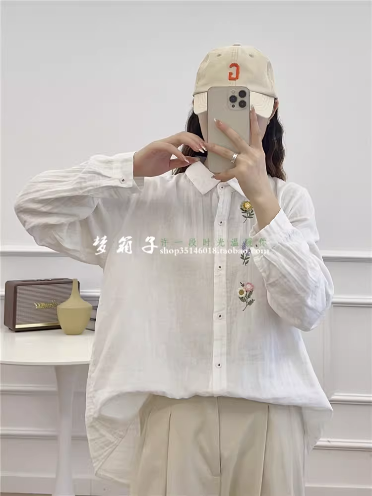 - Dream Box 2023 Thu Đông Phong Cách Mới Áo Sơ Mi Cotton Thêu Hoa Ba Chiều Cổ Bẻ Tay Dài Áo Sơ Mi Trắng Thêu Rộng Cho Nữ
