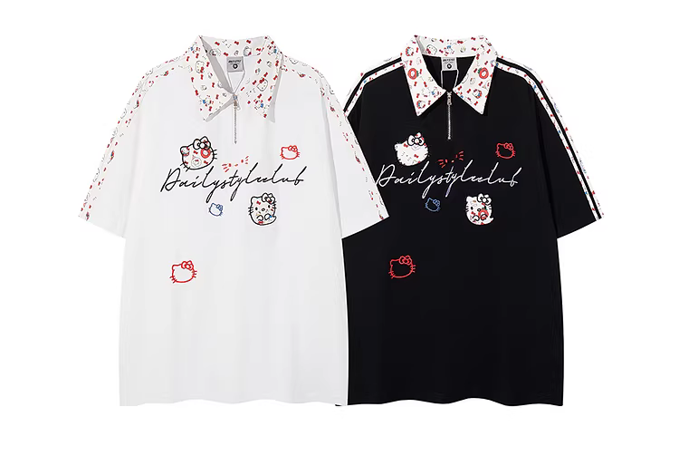 - From Mars Girly Kitty Summer Fun Phim hoạt hình thêu Niche Patchwork Unisex Áo thun ngắn tay dáng rộng