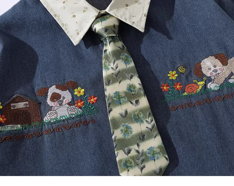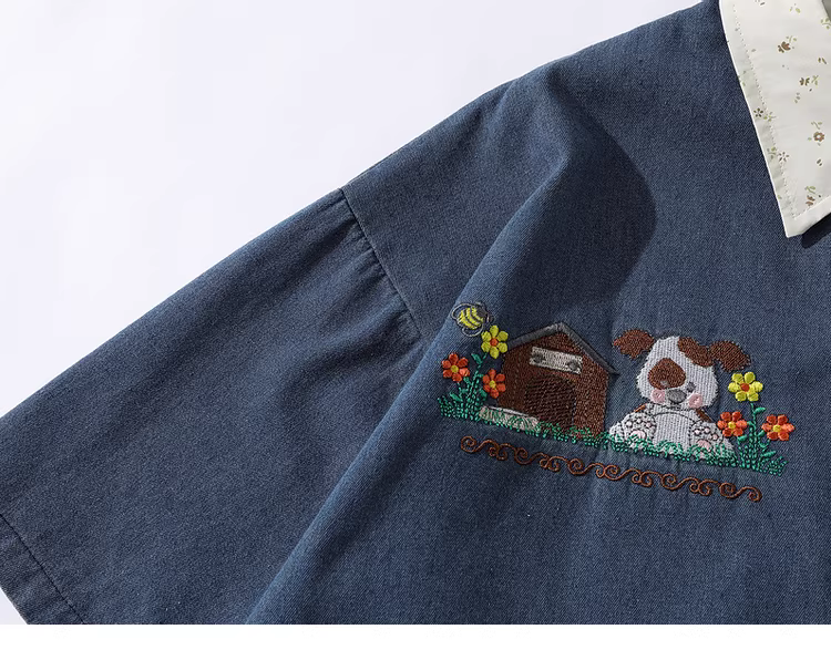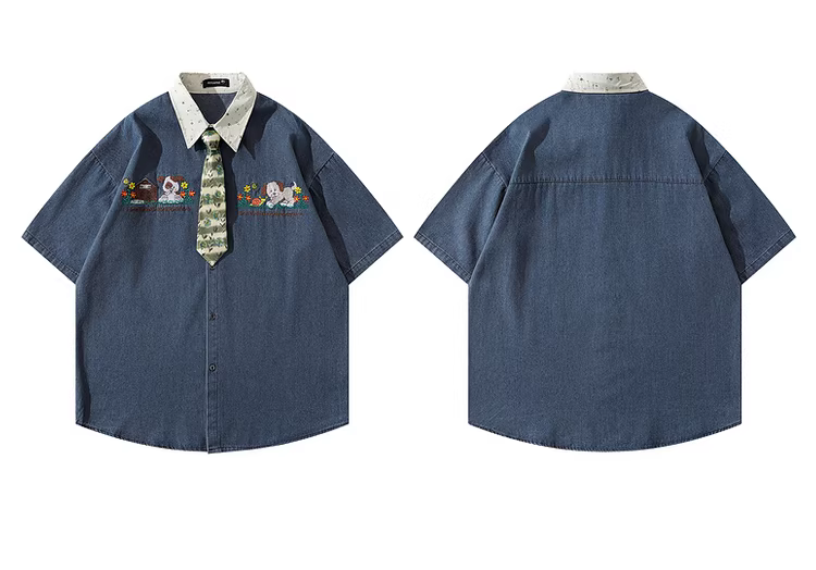 - From Mars Puppy House Trendy Fun Tie Patchwork Áo sơ mi denim thêu dáng rộng tay ngắn mùa hè Ins